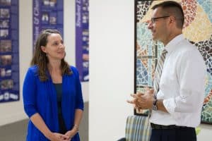 Trisha Maust ’95 Blosser, new Development Officer, talks with Paul Leaman, Head of School.