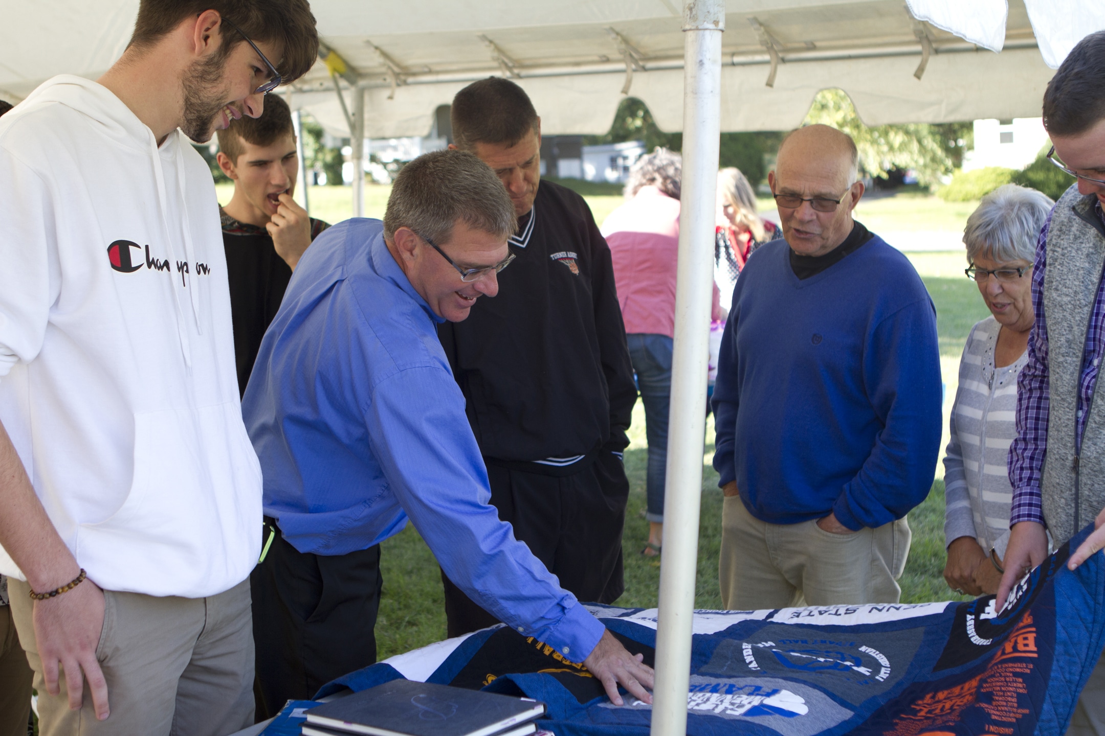 Booster Club presented a comforter made from old practice shirts and other favorite teams. Photo by Jack Zhao.
