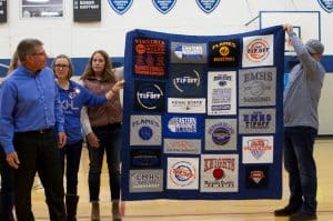 The Booster Club presented Bechler with a comforter made of practice t-shirts of his past teams and teams he follows, signed by past players. New basketball coach Chad Seibert presented a large white board playbook for the boys’ locker room dubbed the “Bechler Board,” purchased with alumni donations.