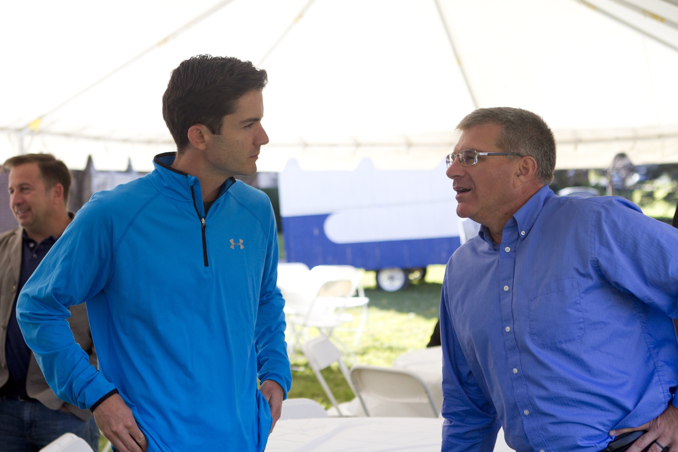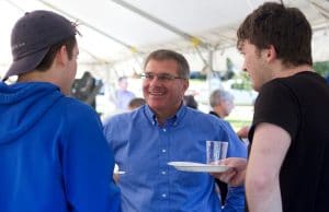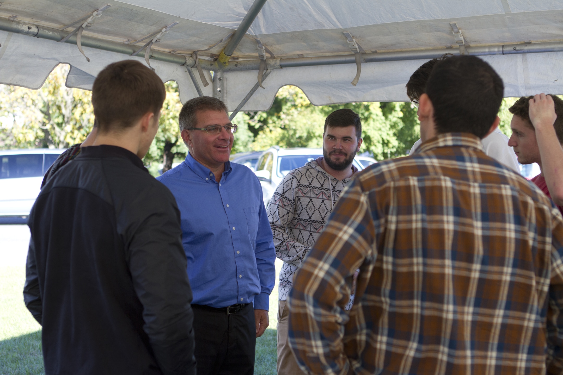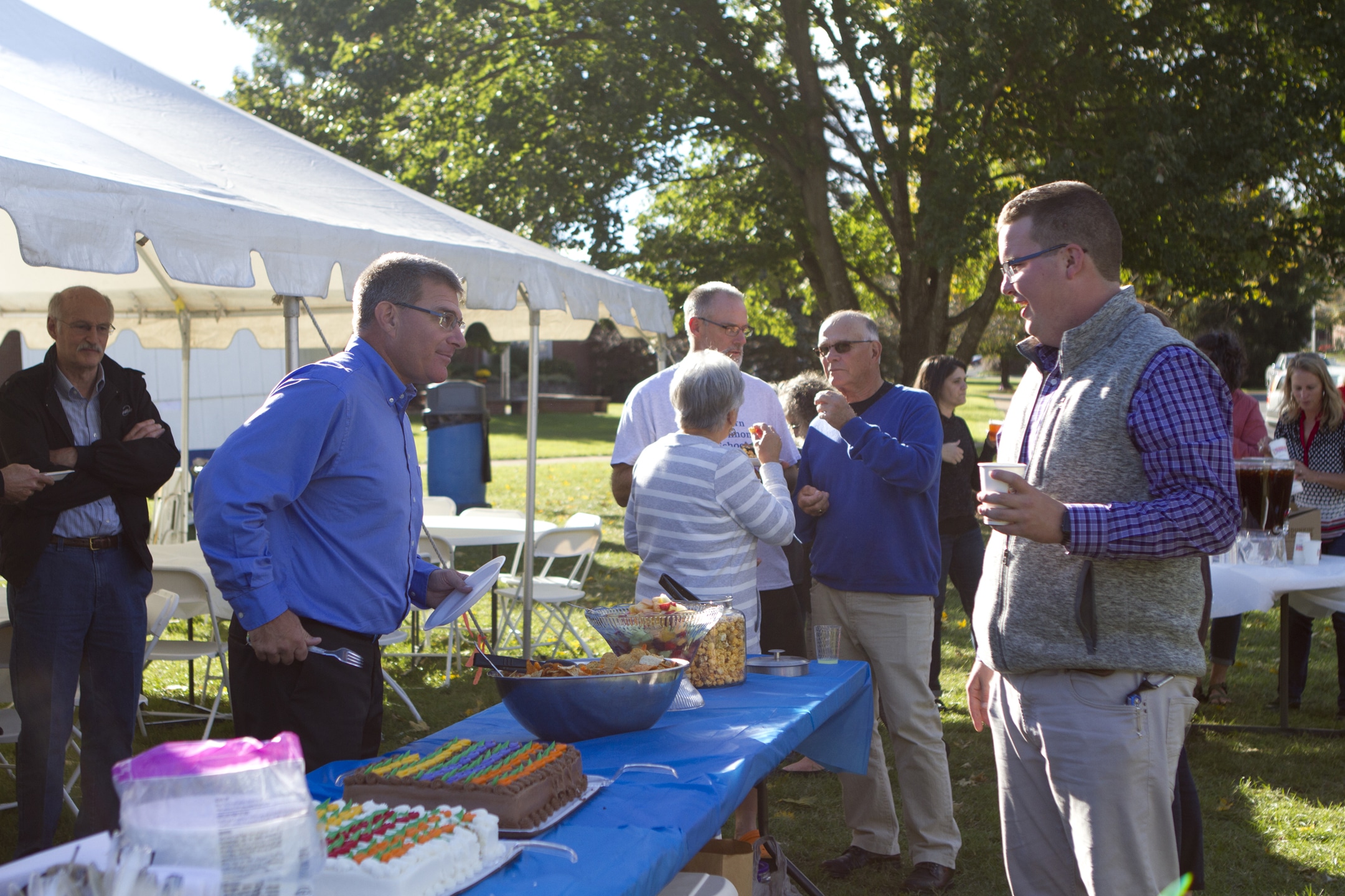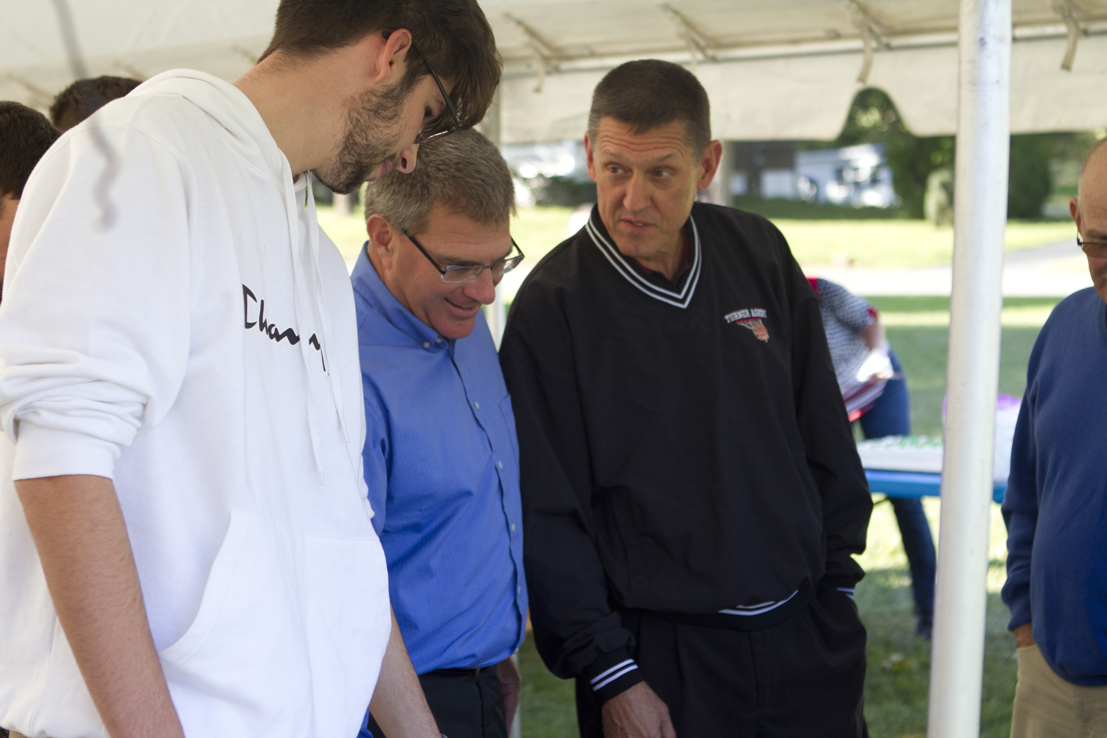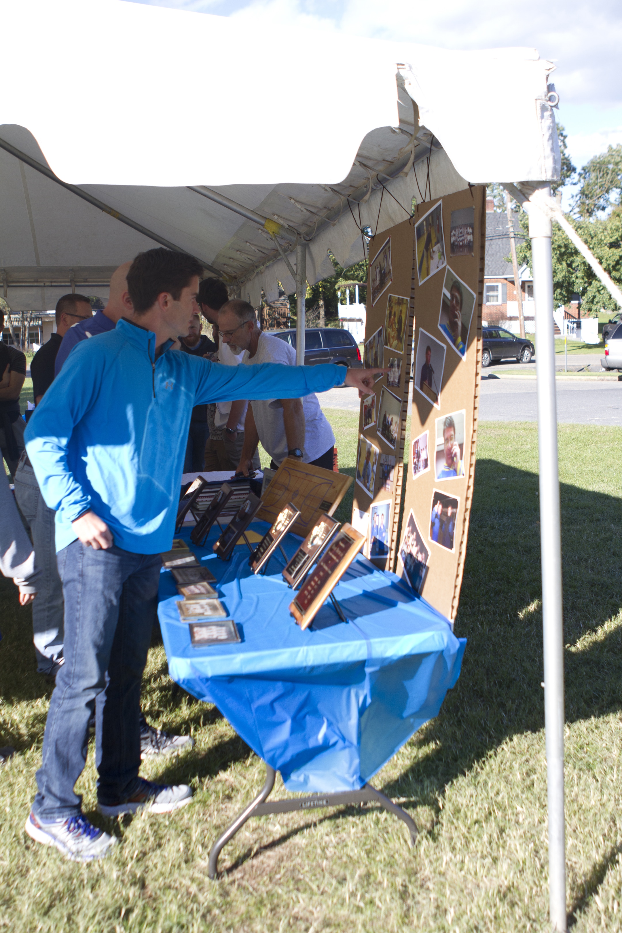 Catching up with former players at the homecoming weekend reception. Photo by Jack Zhao