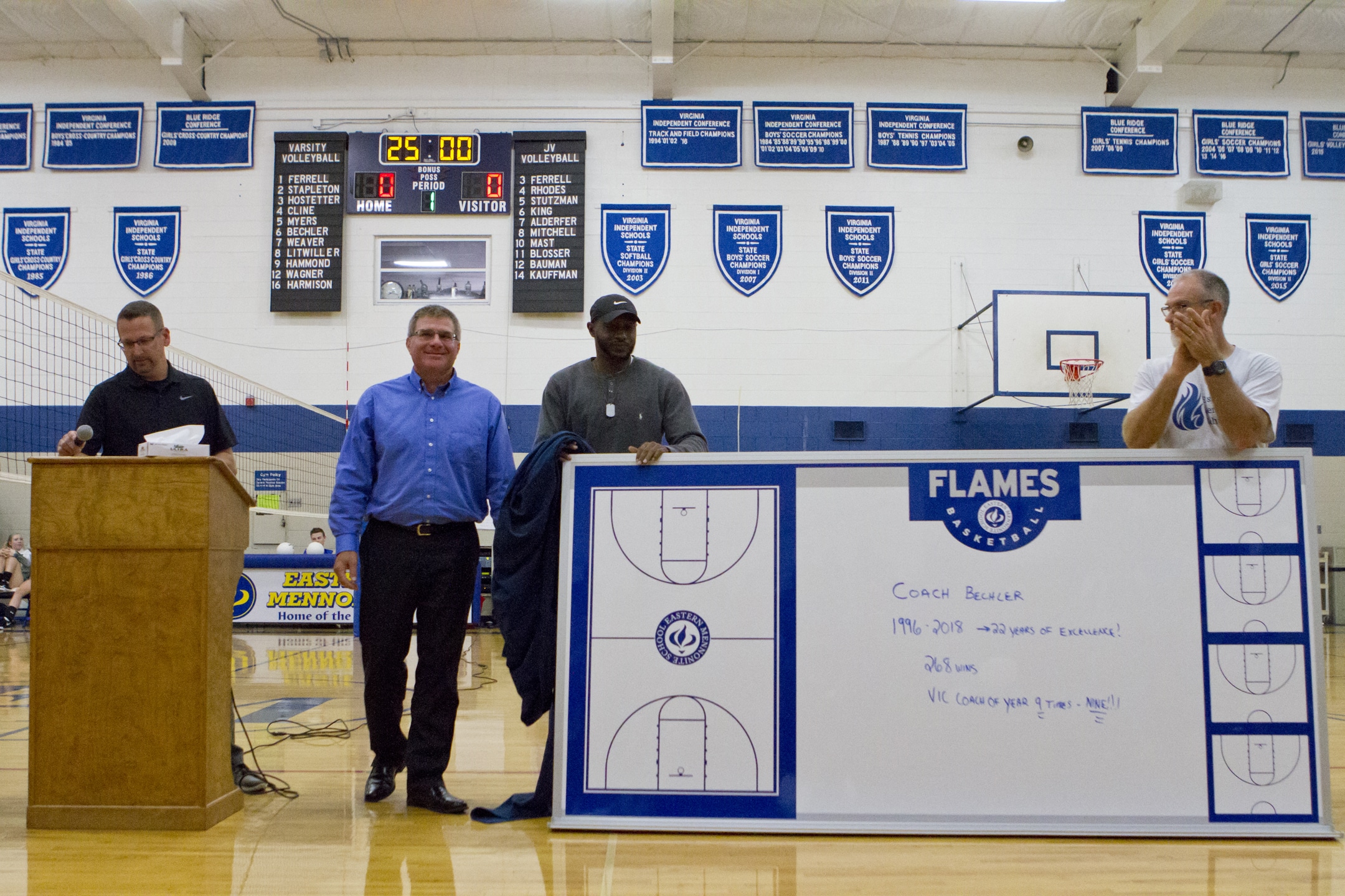 In his 22 years at EMS, Bechler earned “Coach of the Year” nine times. New coach Chad Seibert put Bechler’s accomplishment in perspective: “Coach K has five in his division,” he said. “Tony Bennett has five. And this guy here has done it nine times in 22 years.”
