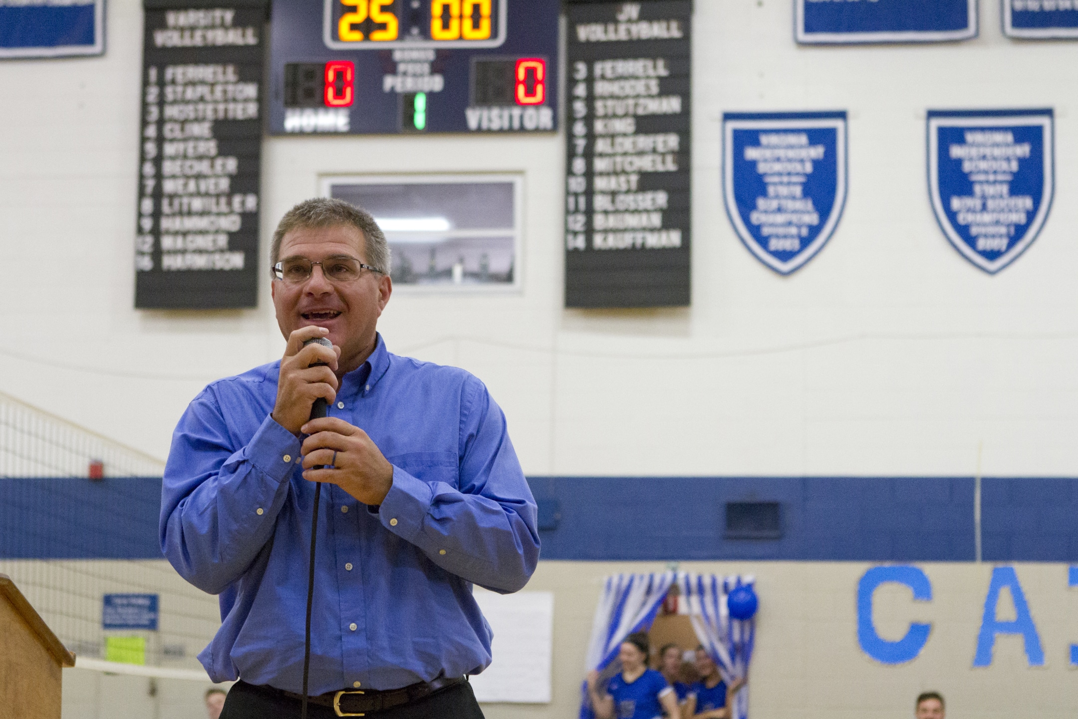 “Do one thing for me,” requested Dave Bechler to a packed Eastern Mennonite School gym. ”For the next two hours, this isn’t about me. It is all about our two volleyball seniors, and the Broadway and EMHS teams giving their all out here on the court.”