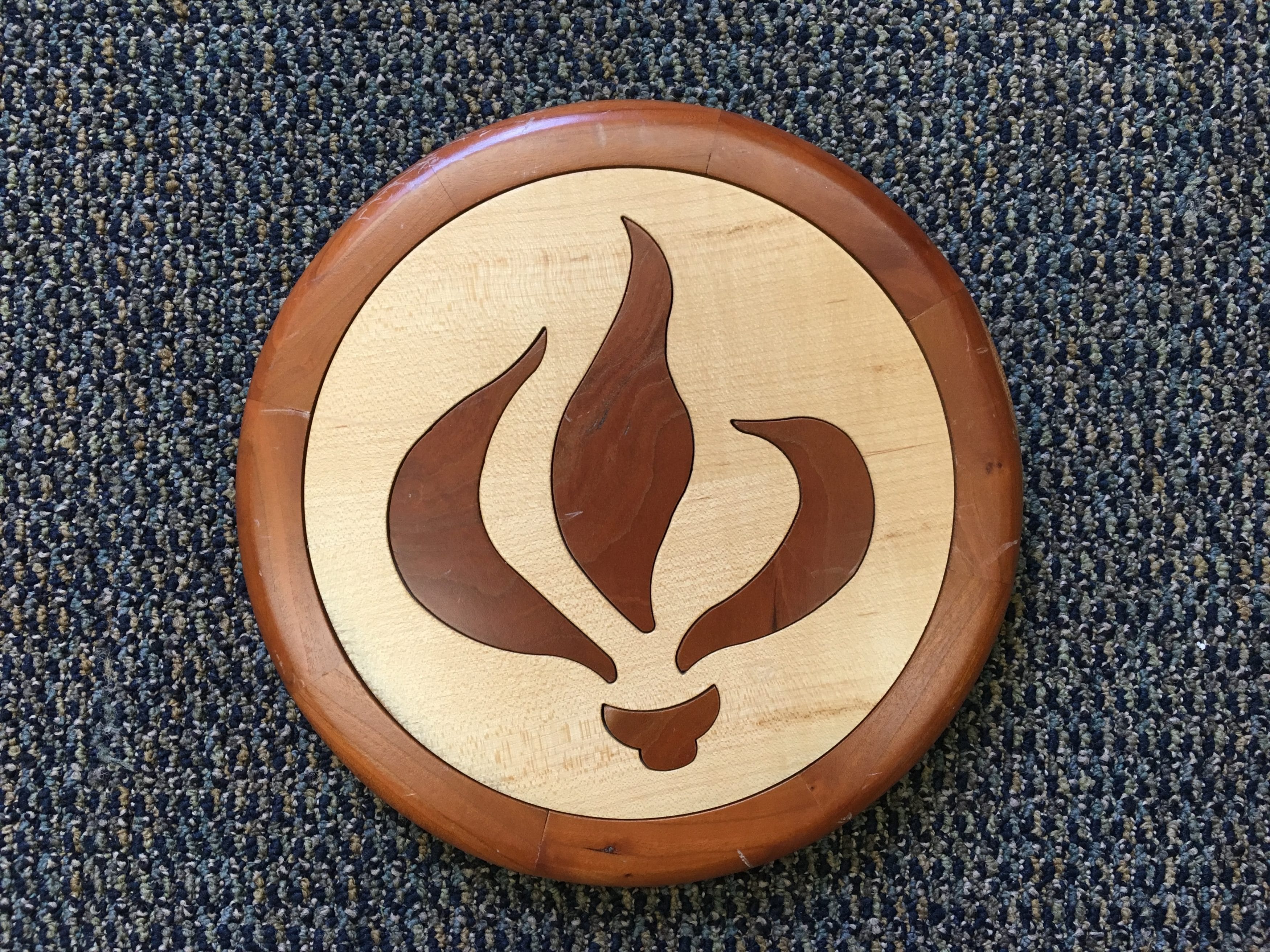 He built the podium with wood from property owned by some of the school’s long-time founding families, including Laban Peachy, Jean Fisher ’65 and Homer Mumaw. It is built in the shape of the auditorium’s roof line and, from 2005 to 2019, featured an in-lay of the school’s then flame logo.