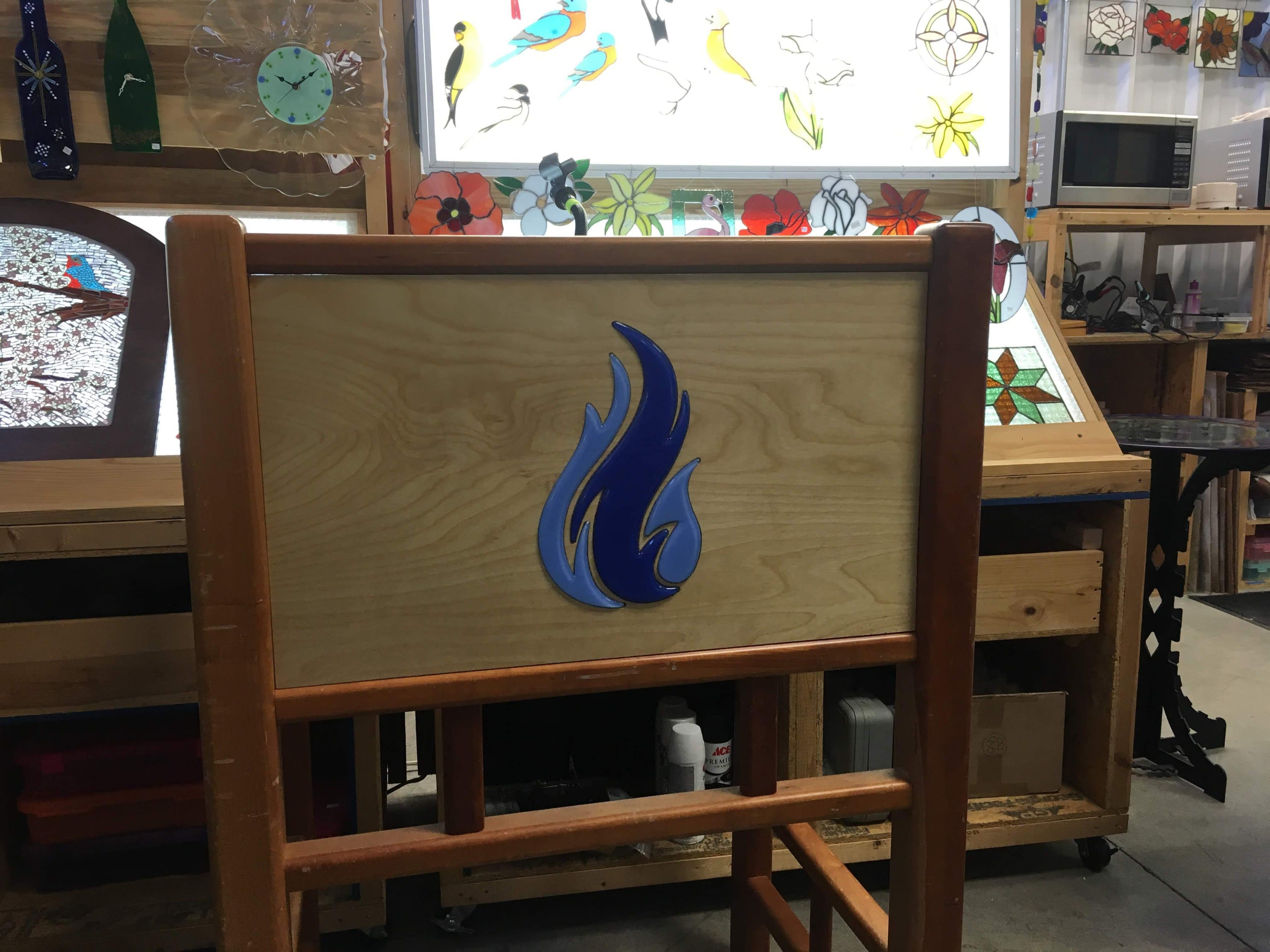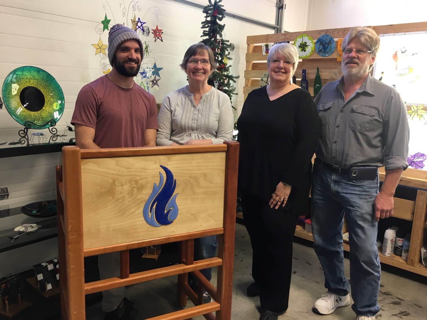 In 2019 the school updated its logo. Hartzler suggested reaching out to Steve Brydge ’79 for ideas on updating the podium logo design. Jay had made the original logo and Steve did the inlay. Steve and his wife Becky own and operate Brydgeworks, just north of Park View. They use a water jet to cut inlays and glass. Steve and Becky recommended stained glass for the update. The new logo on the podium is a quarter-inch stained glass inlay.