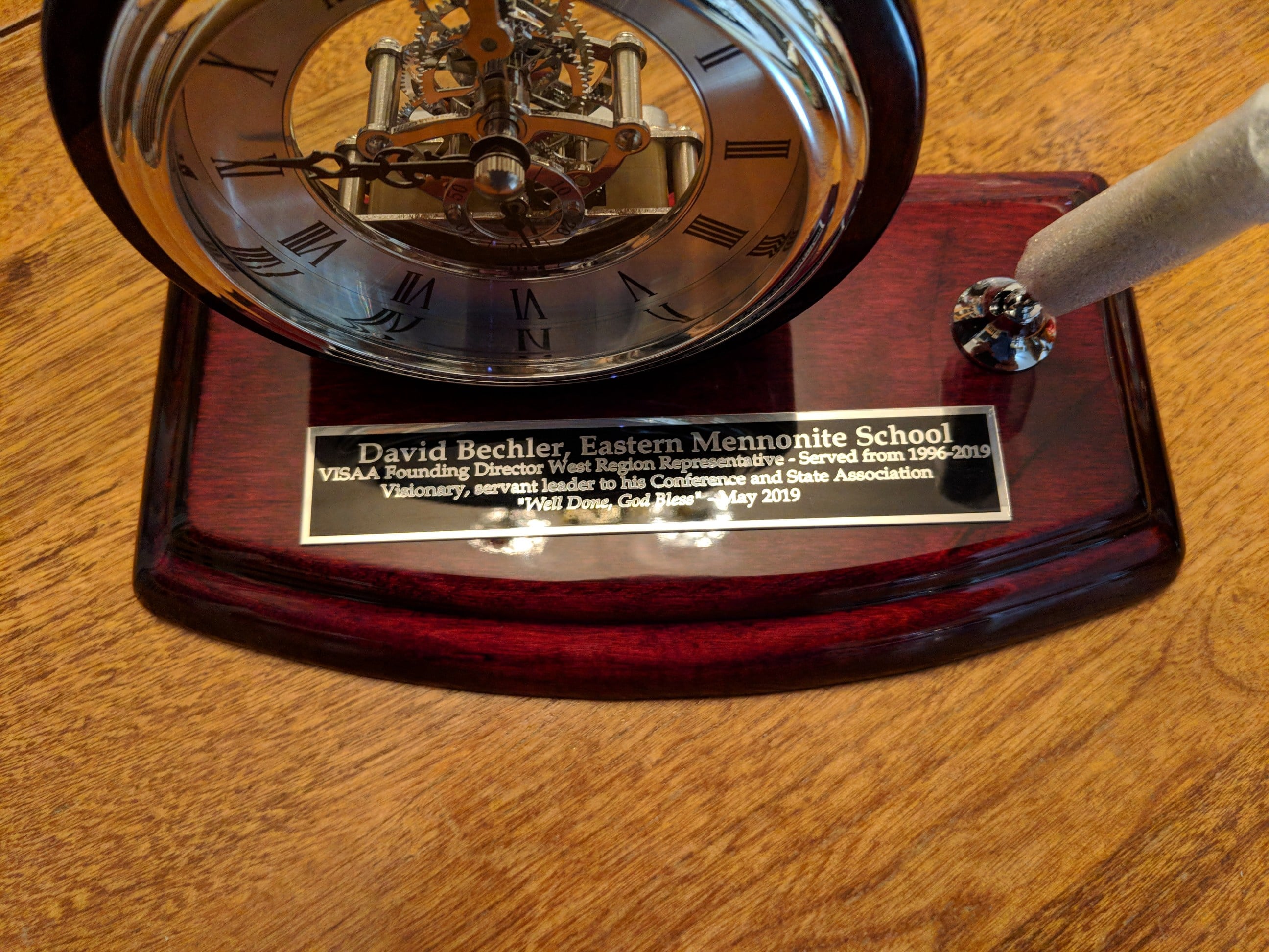 At the May 6 VISAA executive committee meeting in Richmond, the group presented Dave with a clock and pen set. The gift recognized Dave’s role as a founding director of the western region of VISAA in 1996. “That clock is pretty special,” reflected Dave. “That’s a group of colleagues I really respect and will miss. We’ve accomplished a lot together.
