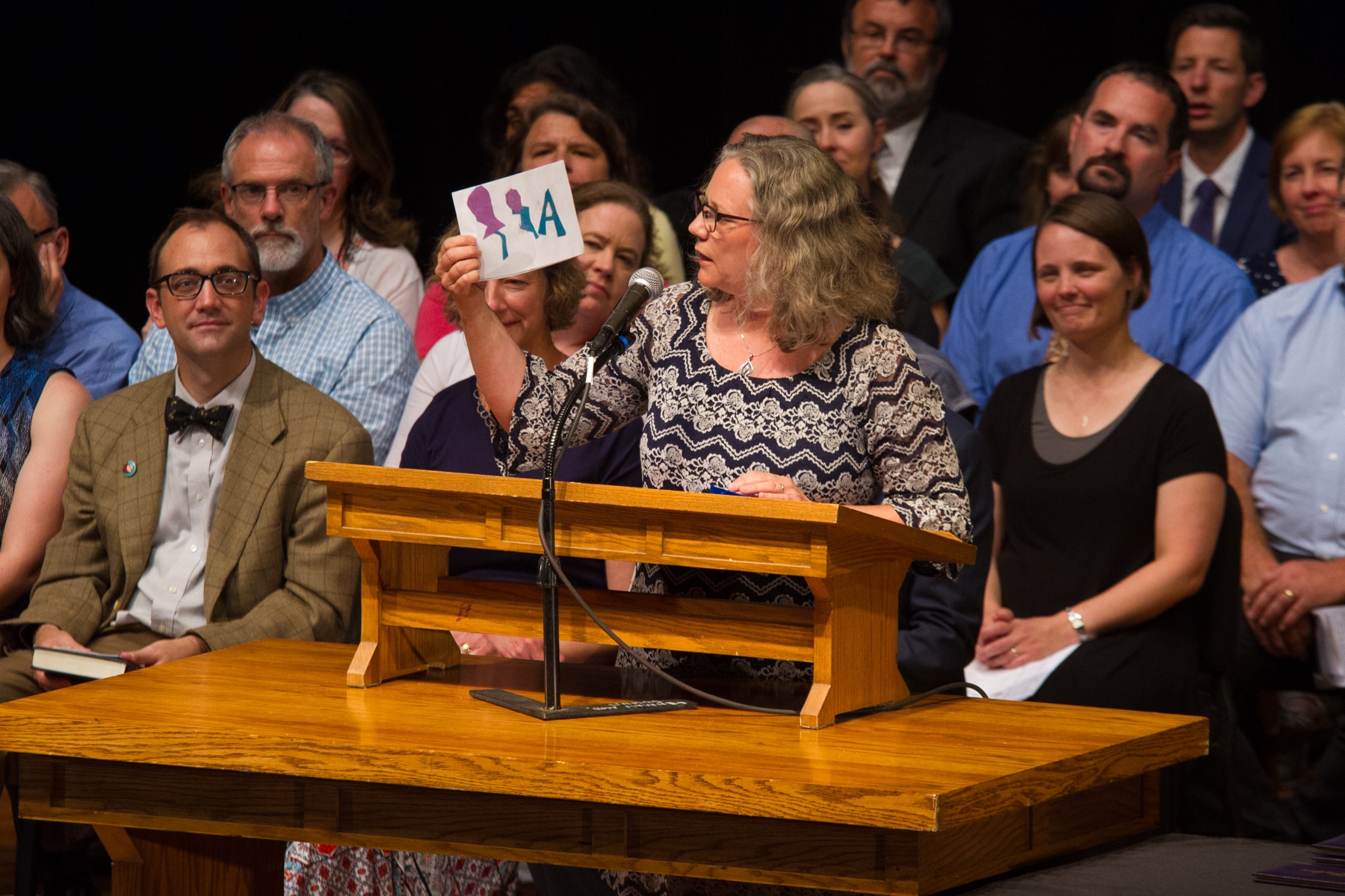 “Even in kindergarten, the story of you, had begun, your personalities were developing,” she noted, holding up three cards created by kindergarten students in the school year 2006-7; those three students were part of Eastern Mennonite Elementary School’s first kindergarten class and were part of the class of 2019 on Sunday. Read her full presentation.