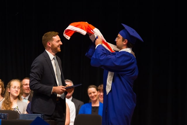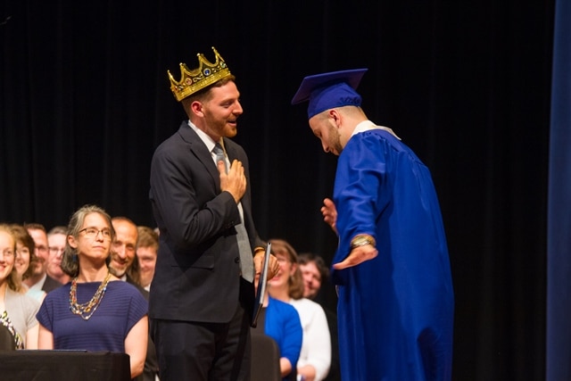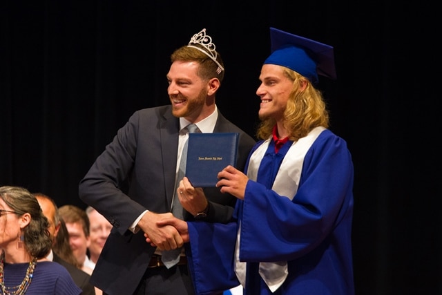 In keeping with tradition, graduates handed Justin King, high school principal, a “gift” as they received their diploma. Final graduate Felicity Zimmerman explained… building blocks and bricks of various sizes represented their support for the bridge project, while regalia memorized King’s first year as principal.
