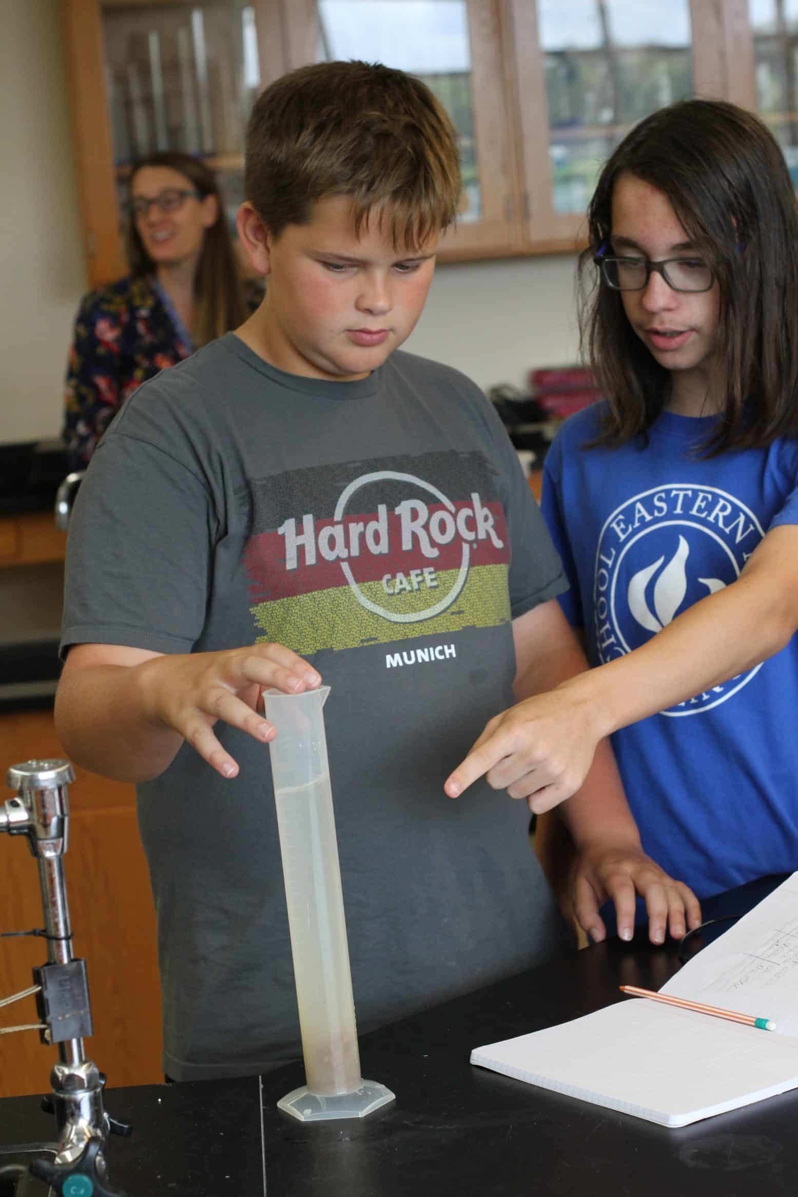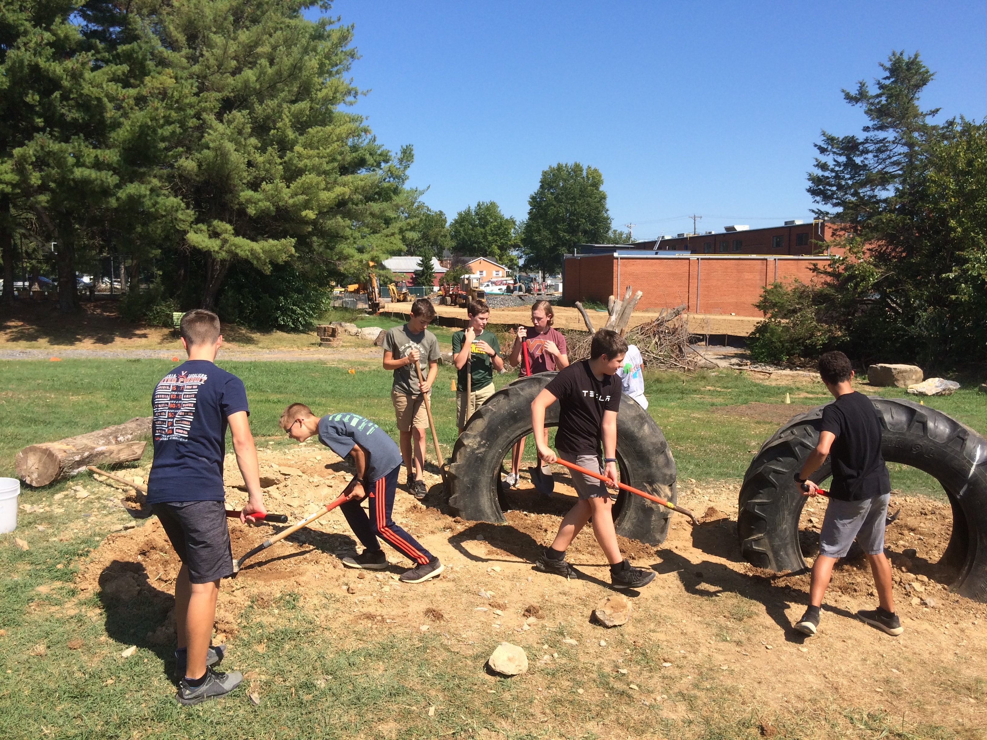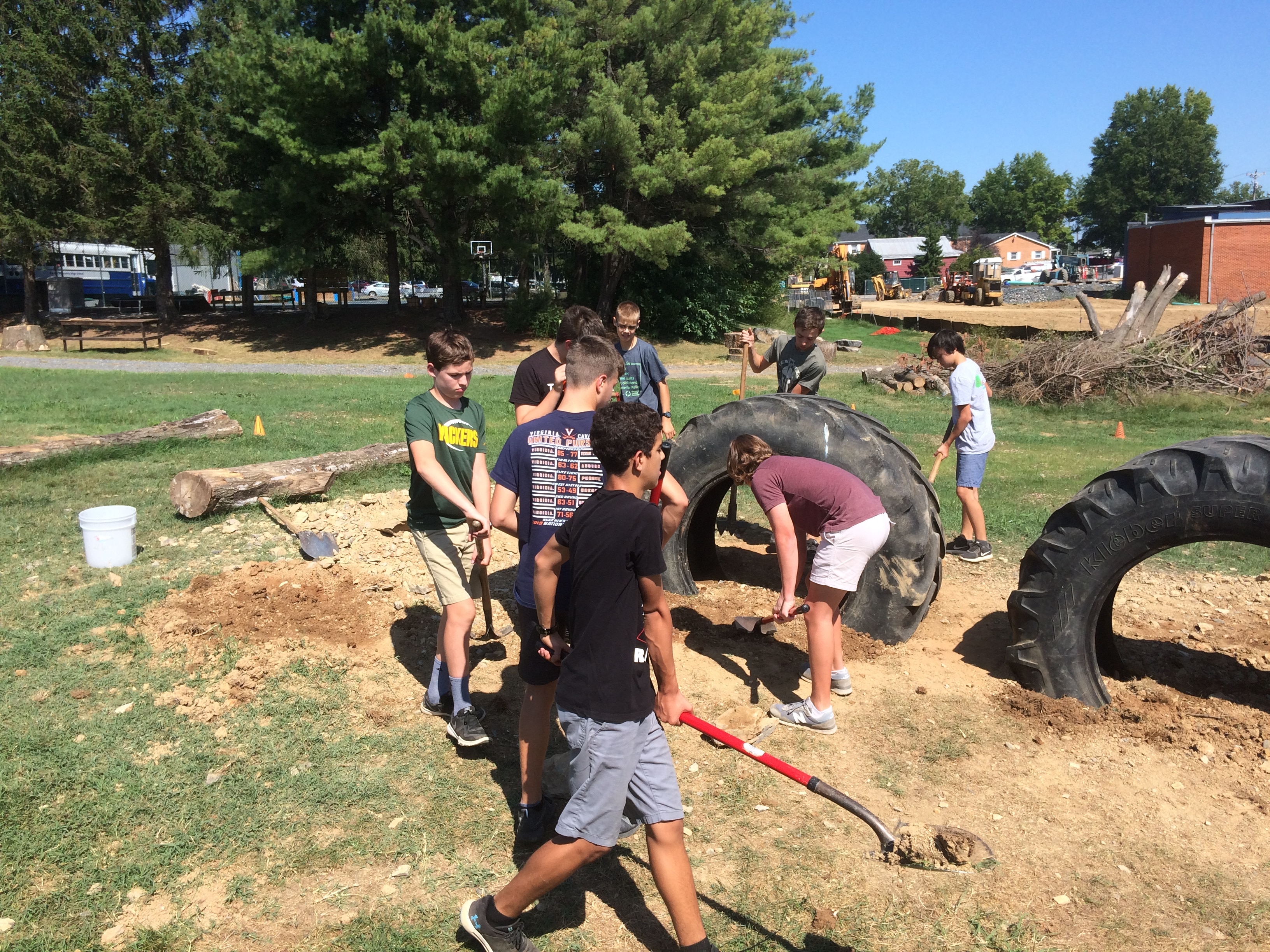 Eighth grade physical science students dug holes, examined rocks, weighed and measured inside and outside the school building in recent weeks to help install donated oversize tractor tires for a new elementary climbing structure.