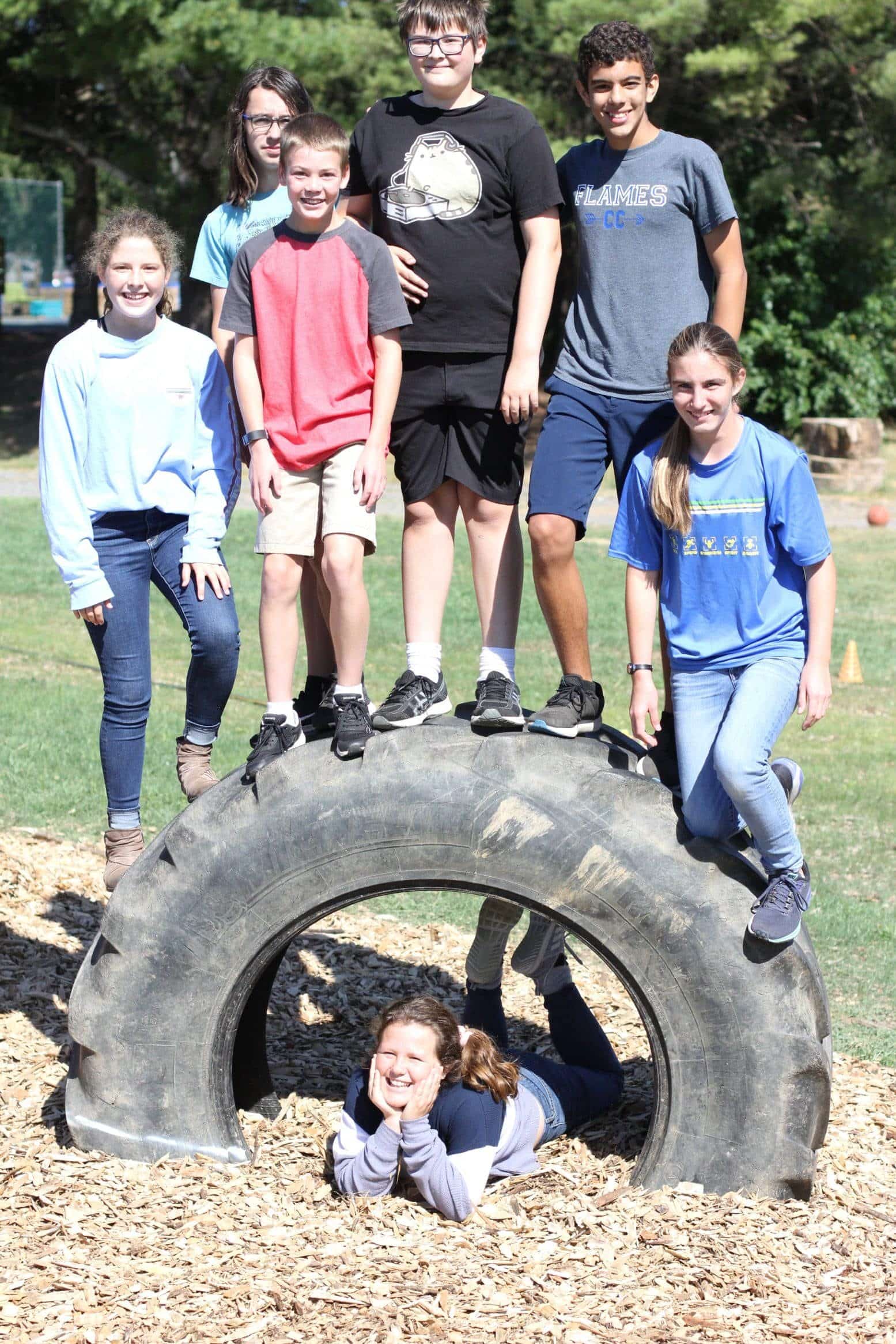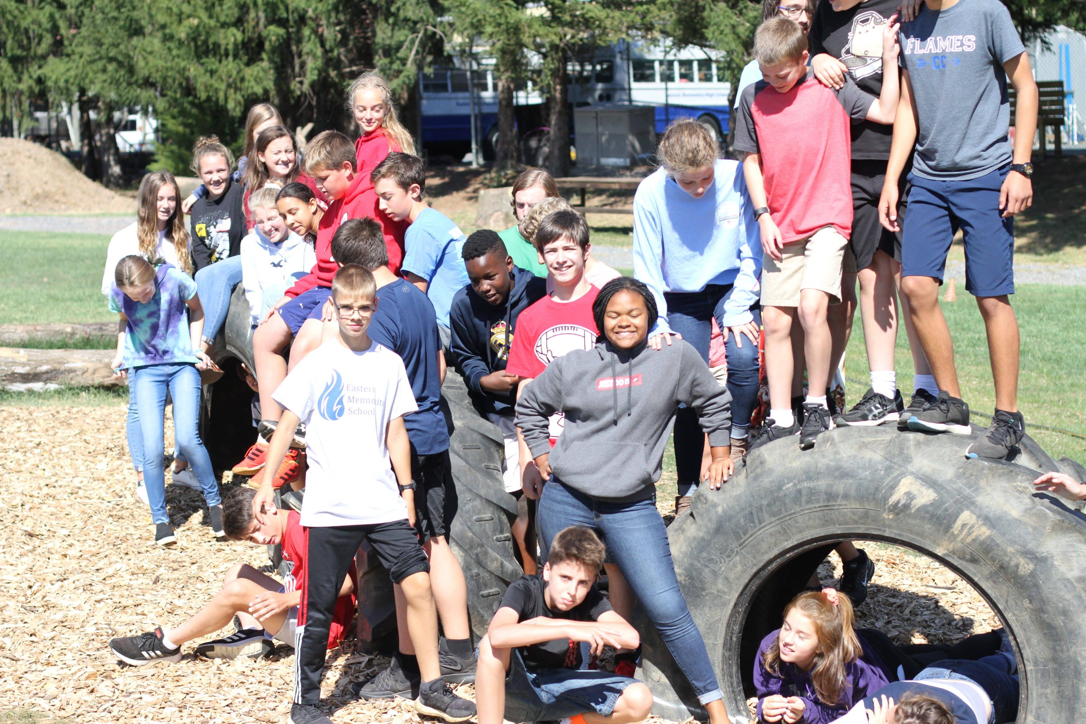 After the tires were installed, the full eighth grade class had the opportunity to climb on their accomplishment and celebrate on a beautiful fall day.