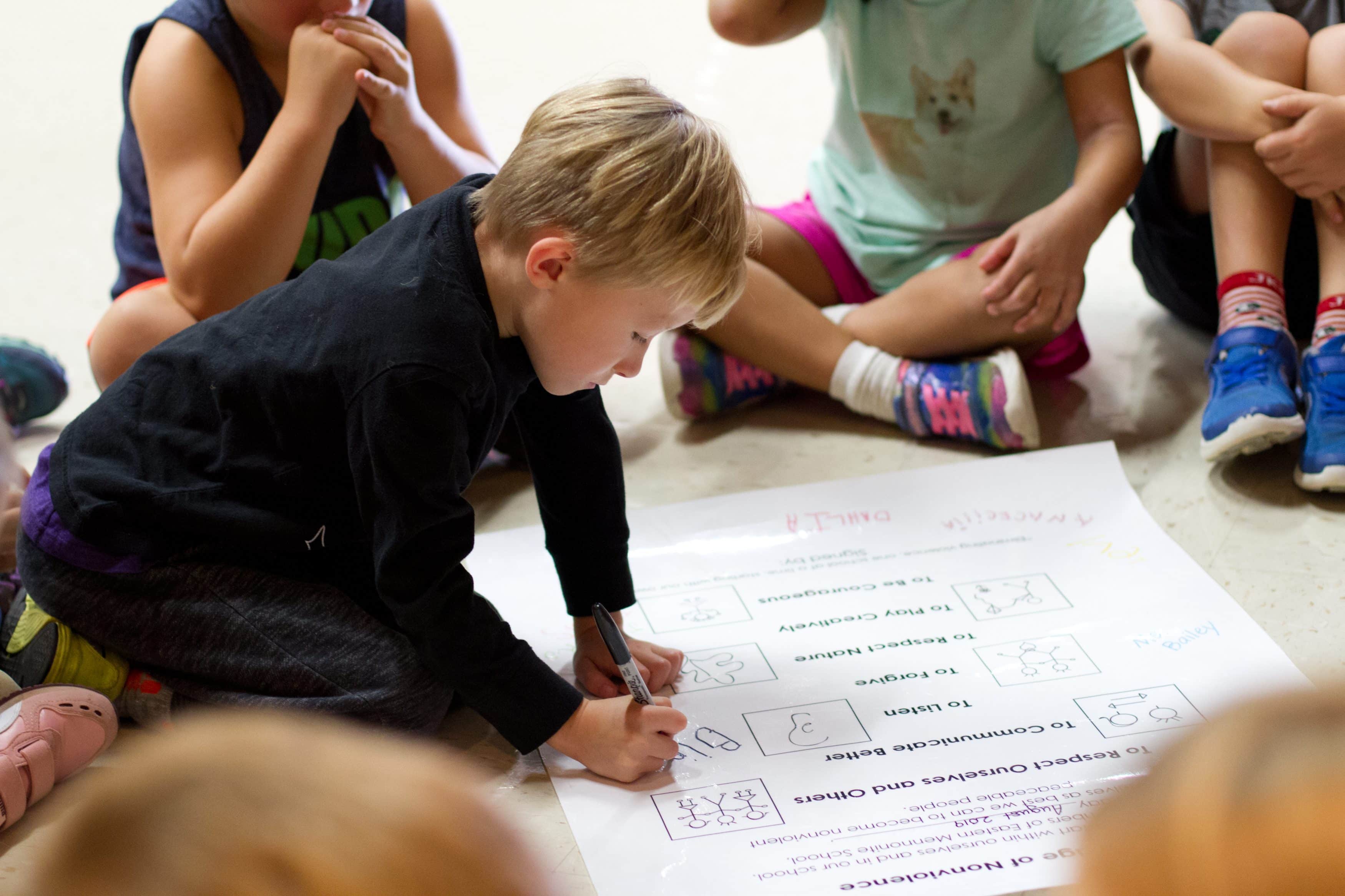 After they created their classroom cairn, students reviewed and signed the pledge of nonviolence.