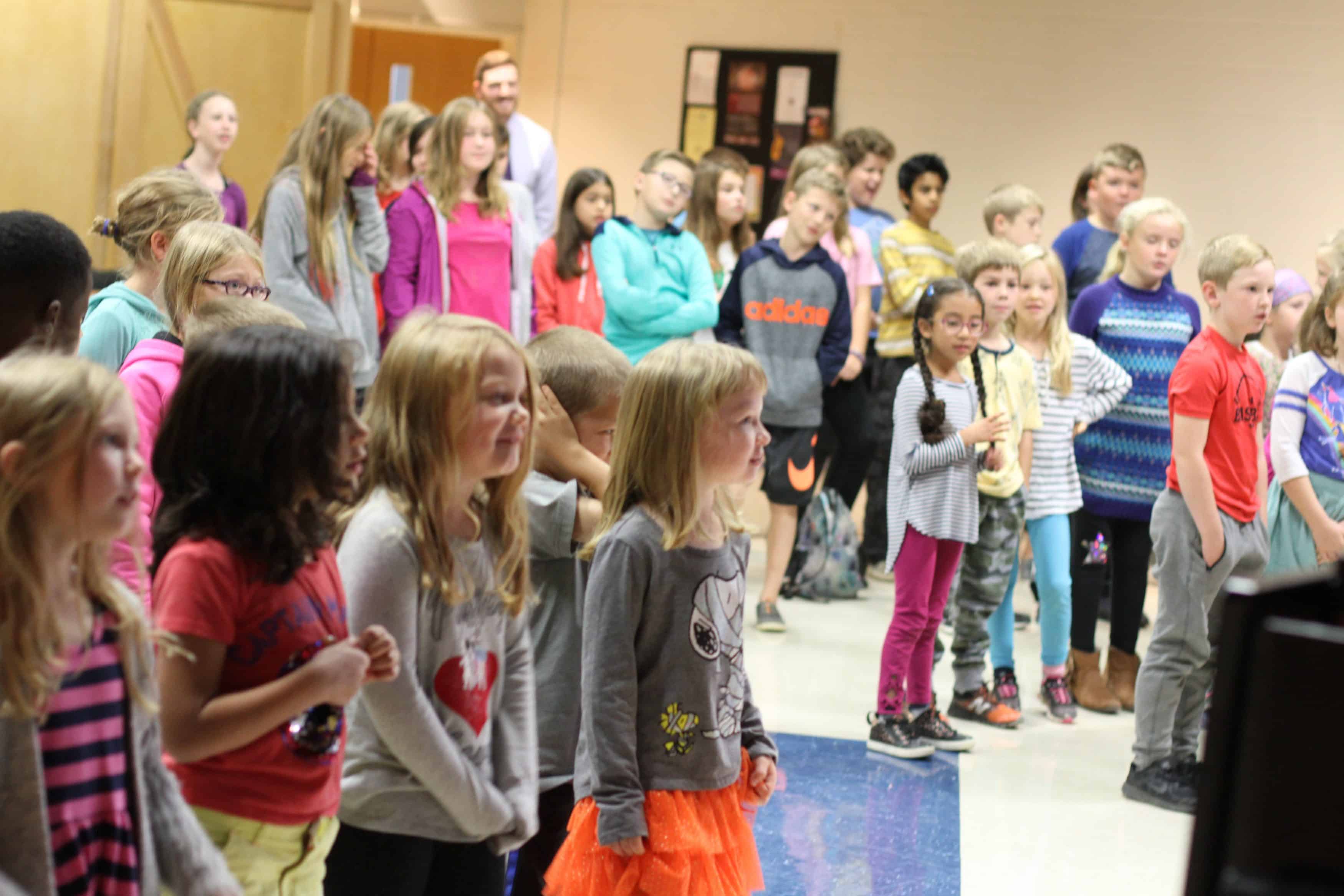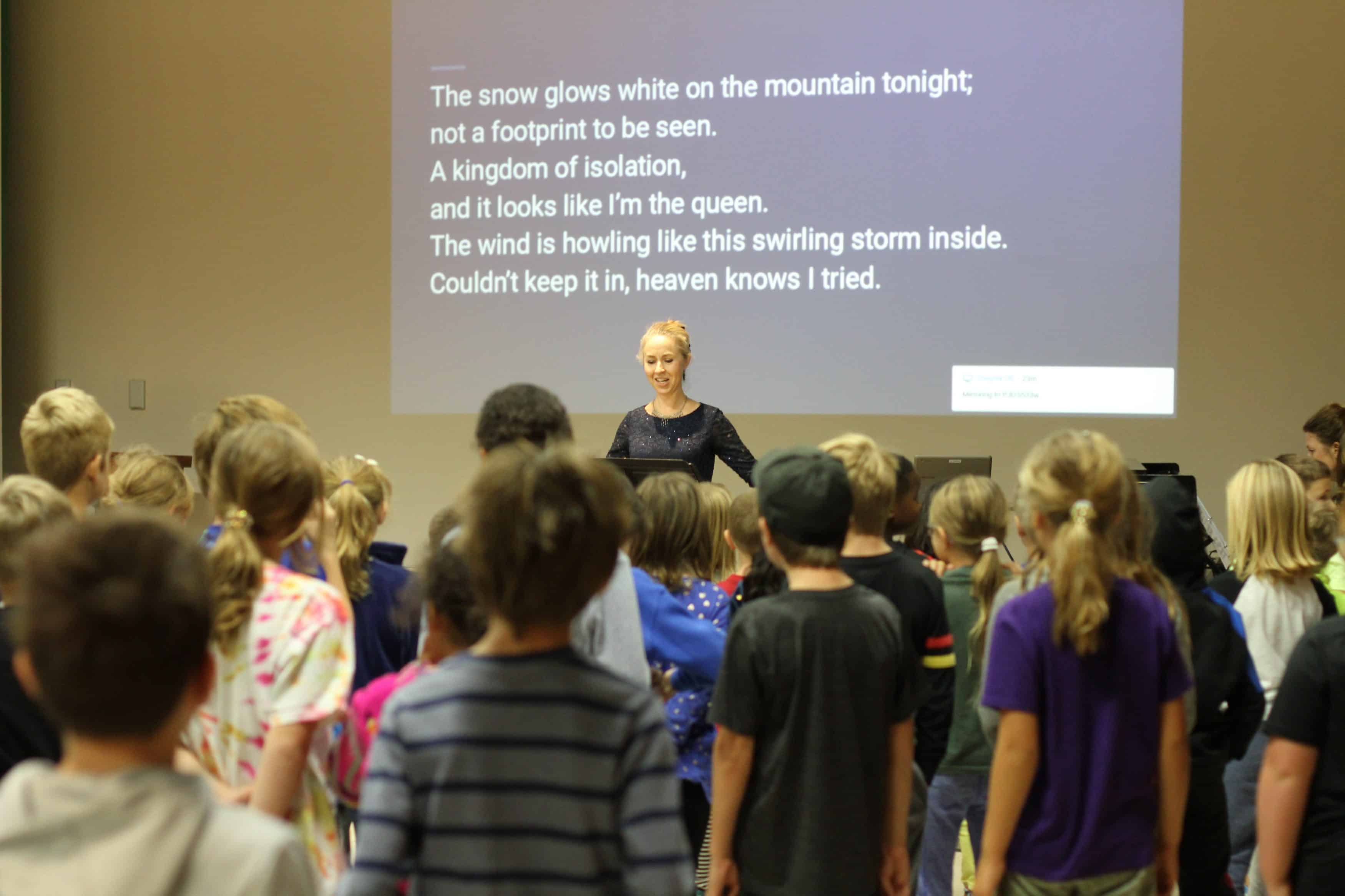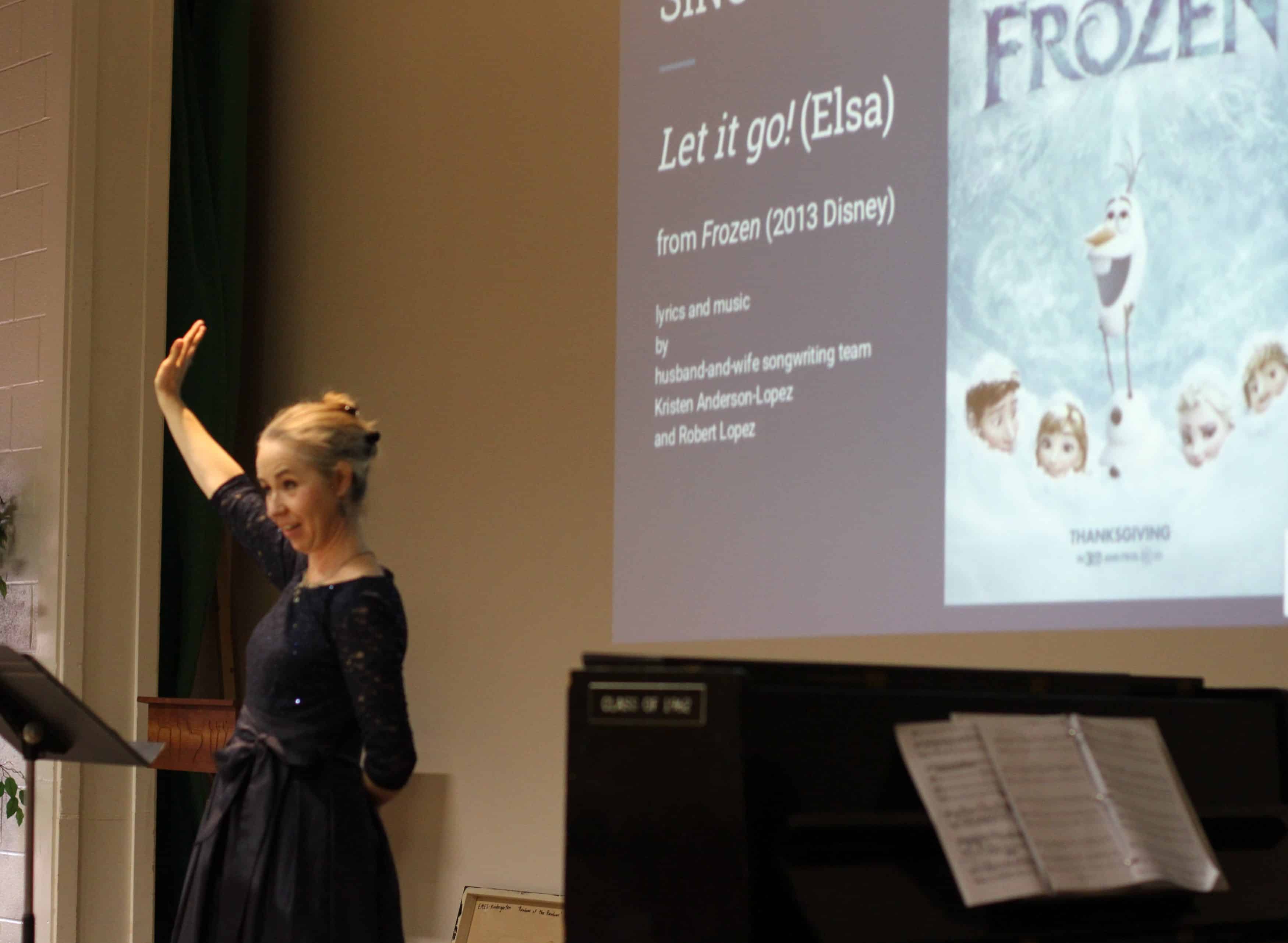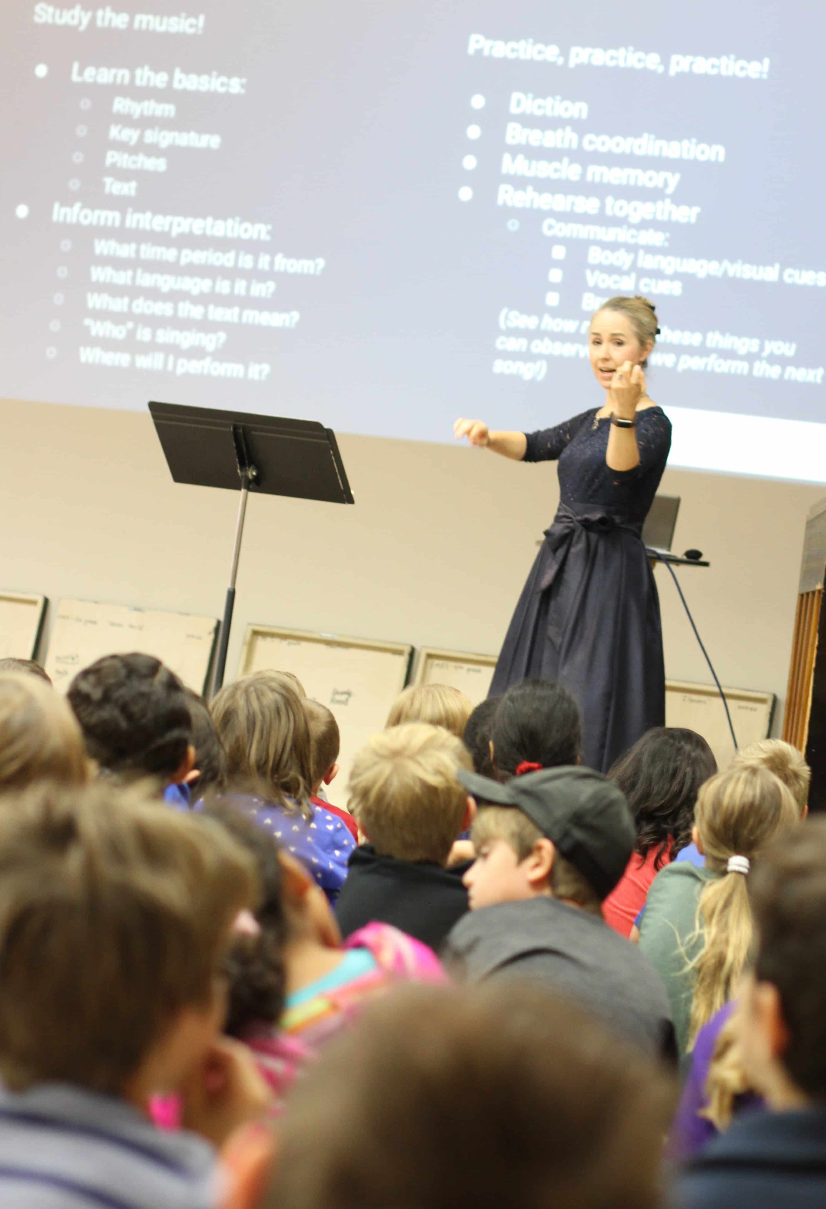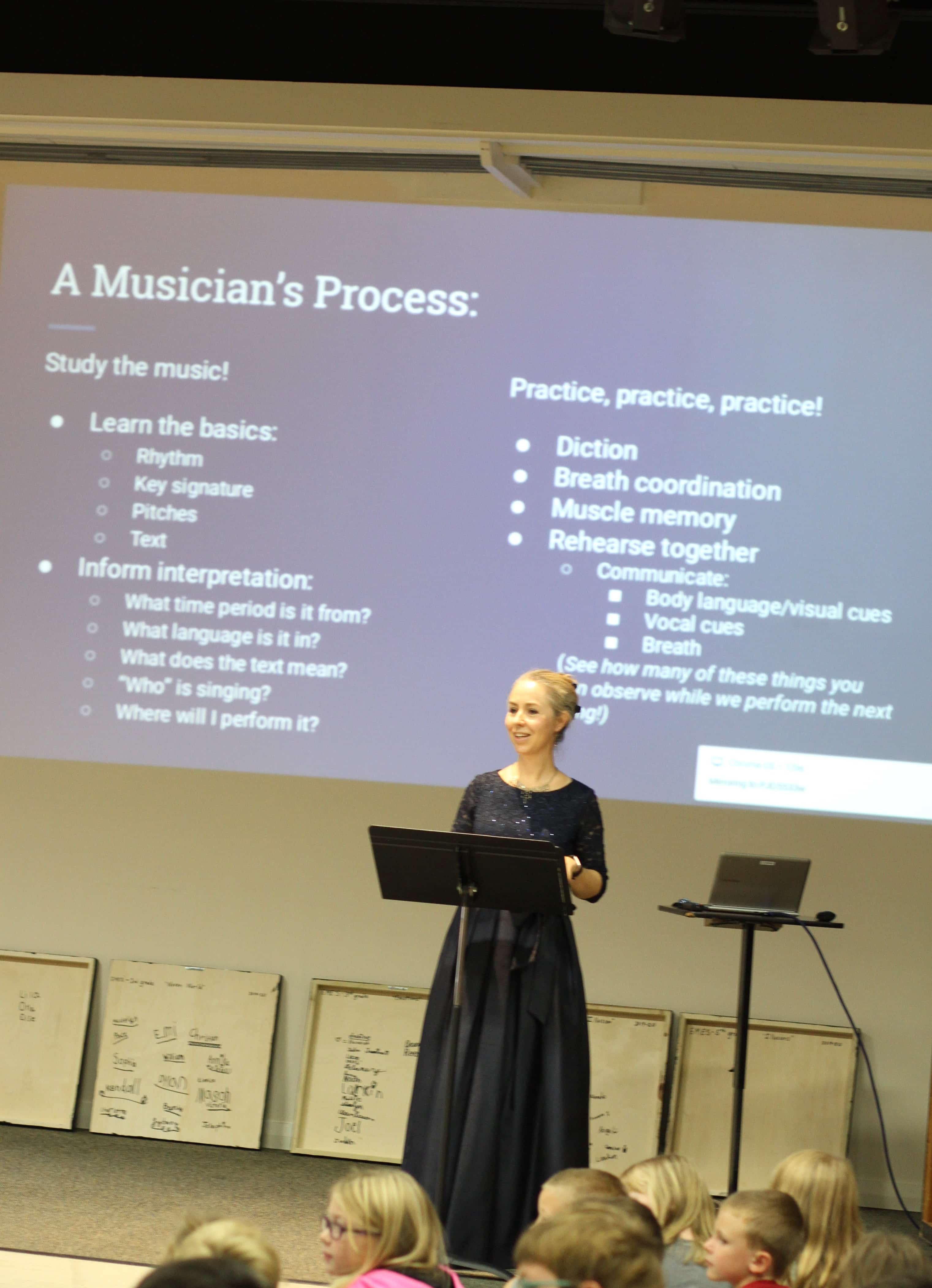 In the Wednesday morning Gathering, K-5 students heard about the discipline and commitment involved in becoming a professional musician. Christine Fairfield, soprano, shared insights and performed, accompanied by Kathryn Schmidt, PhD, a piano instructor at Eastern Mennonite University. Mrs. Fairfield works in the EMS Front Office and is mother of three EMS students and one graduate, all who study an instrument and sing.