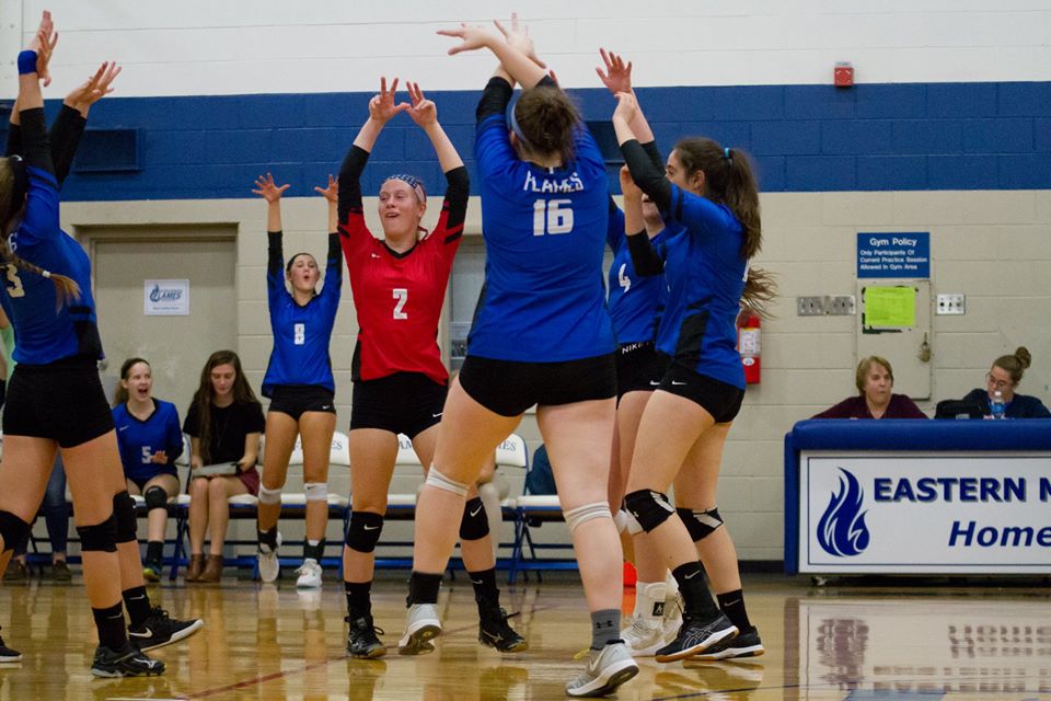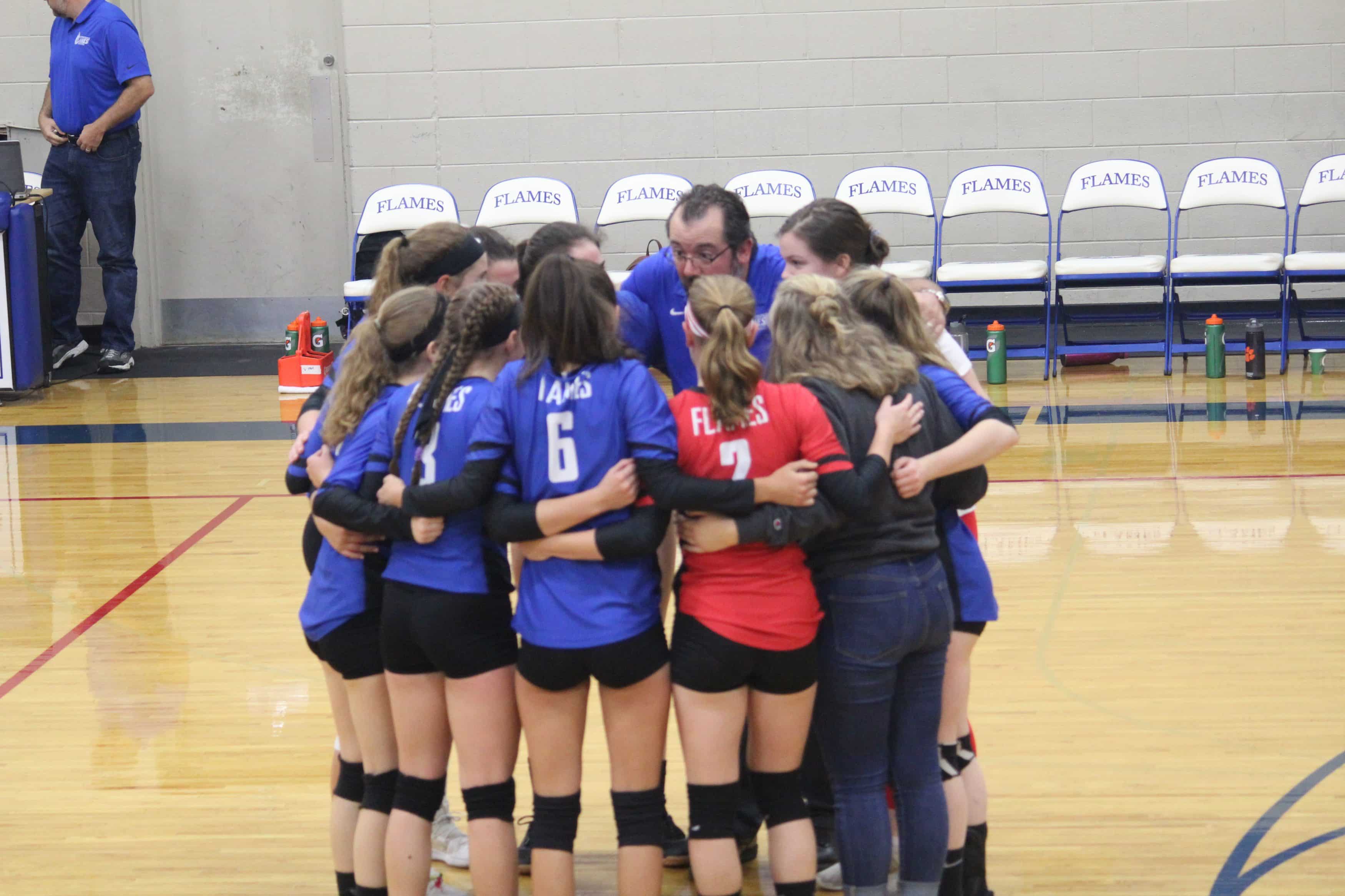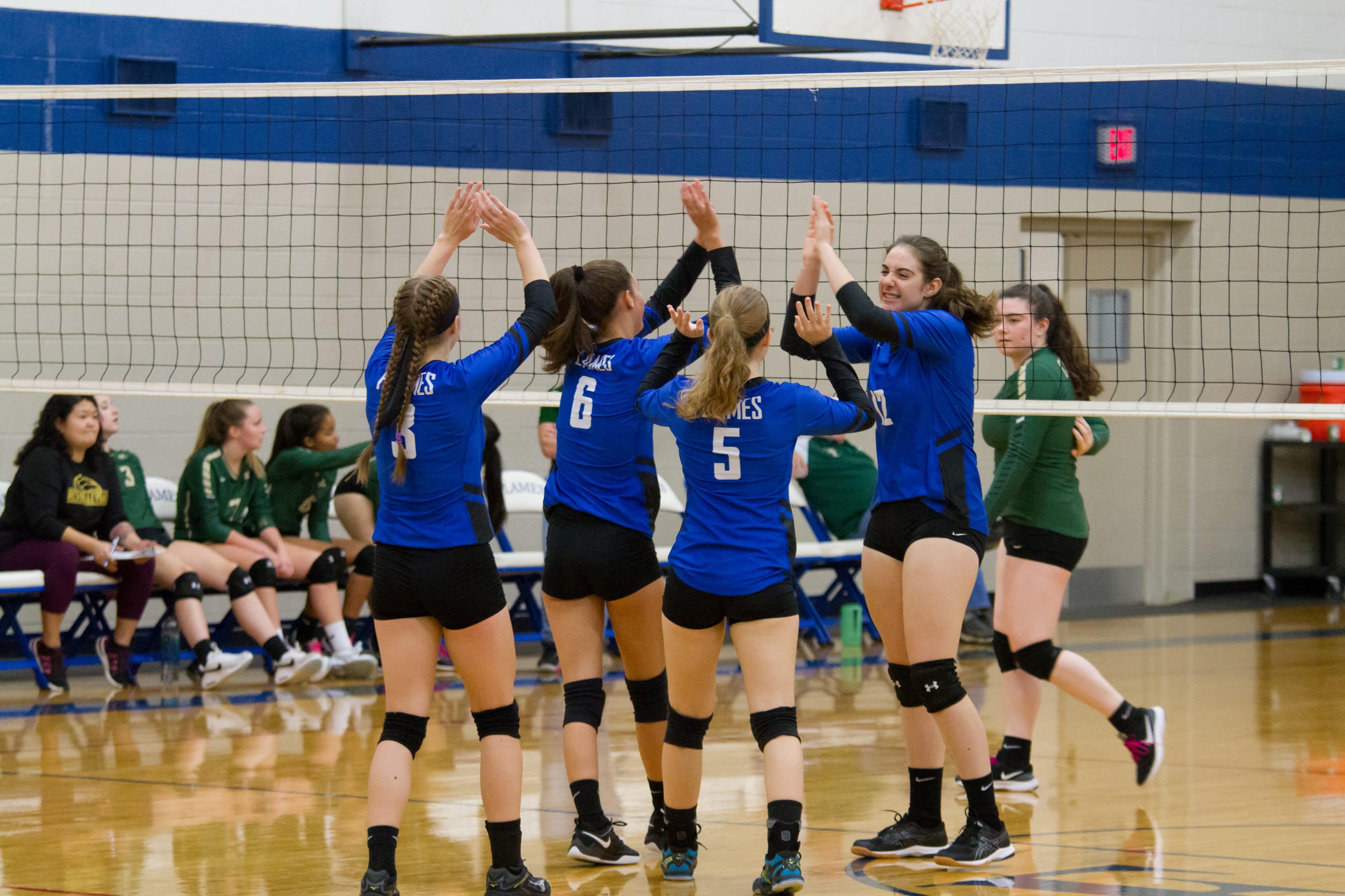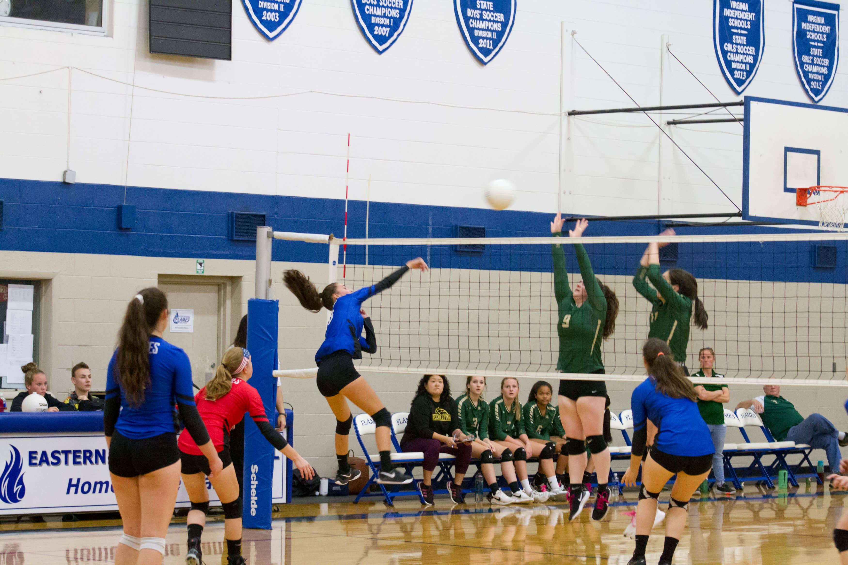 In the Virginia Independent Schools Athletic Association Division III quarterfinals, EMHS had home court advantage on Nov. 6 when the Flames rallied from a two-set deficit to defeat sixth-seeded Guardian Christian Academy 23-25, 25-27, 25-15, 25-21, 15-5. Rowdy fans of all ages filled the house for the thrilling outcome.