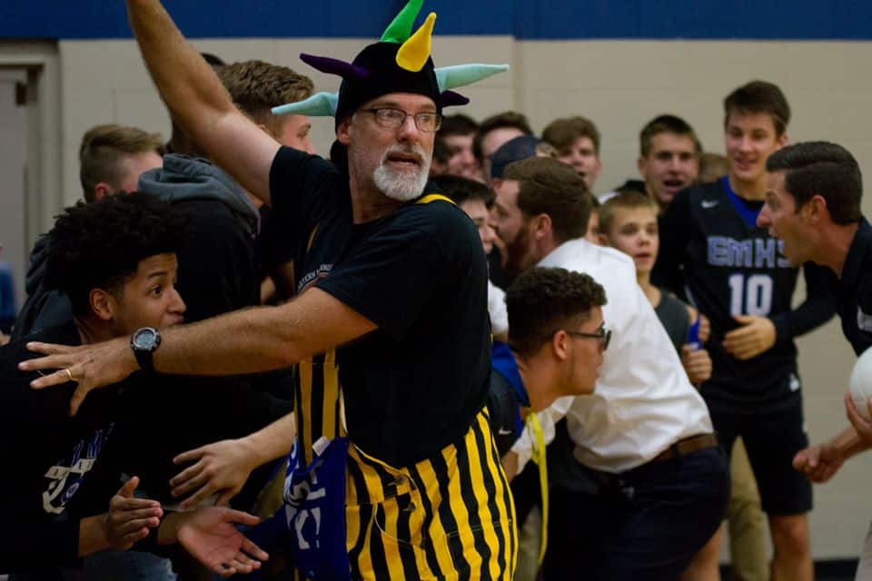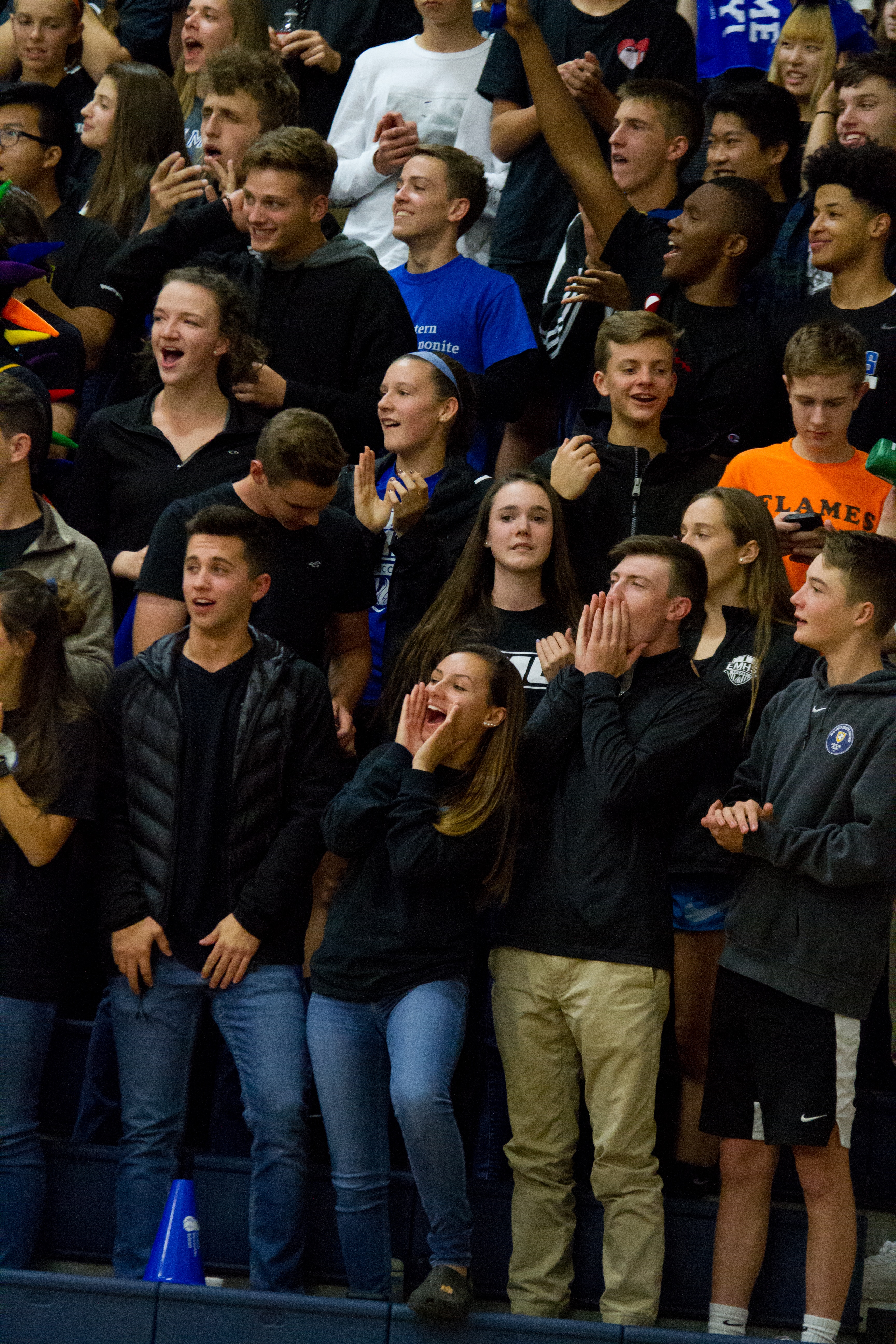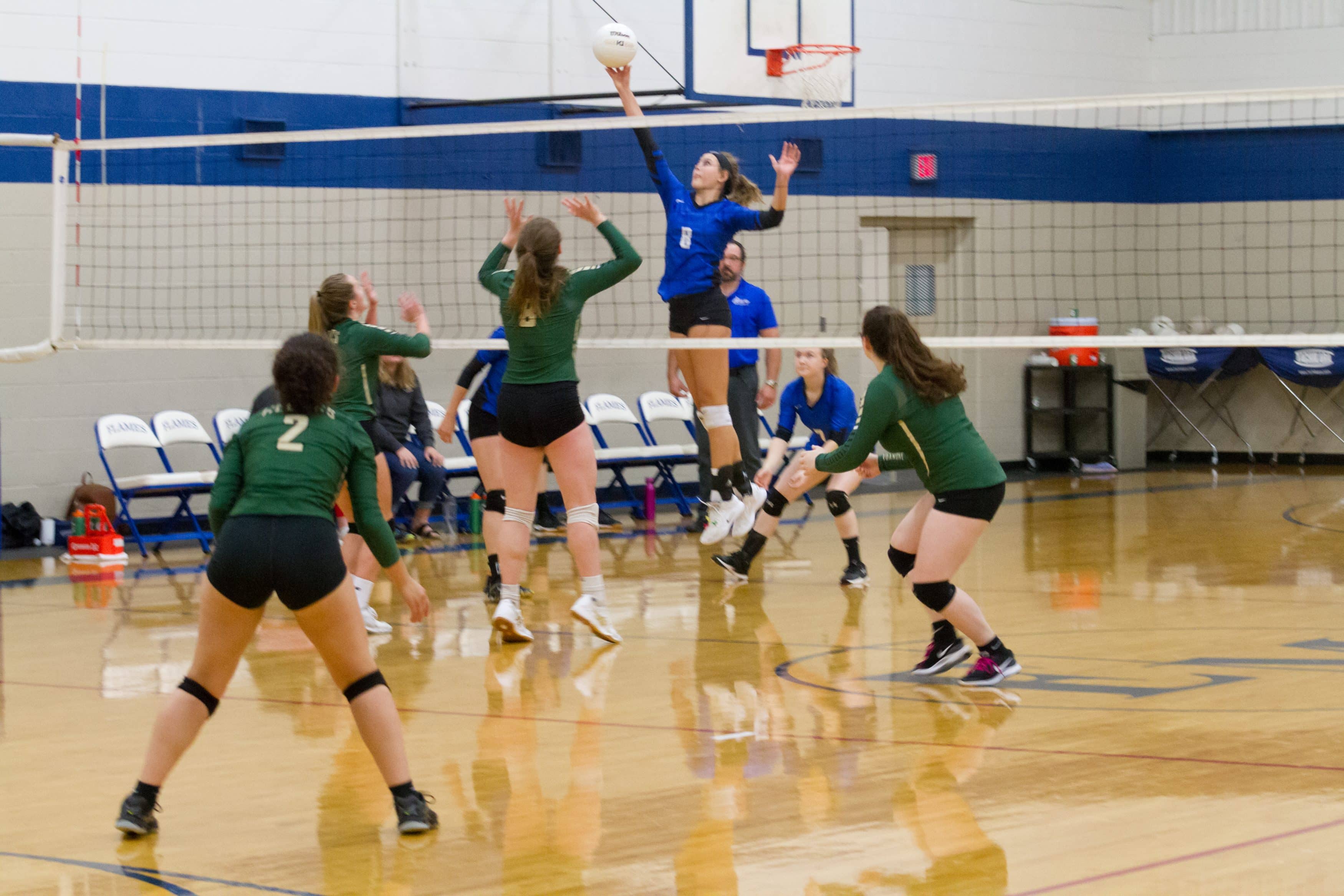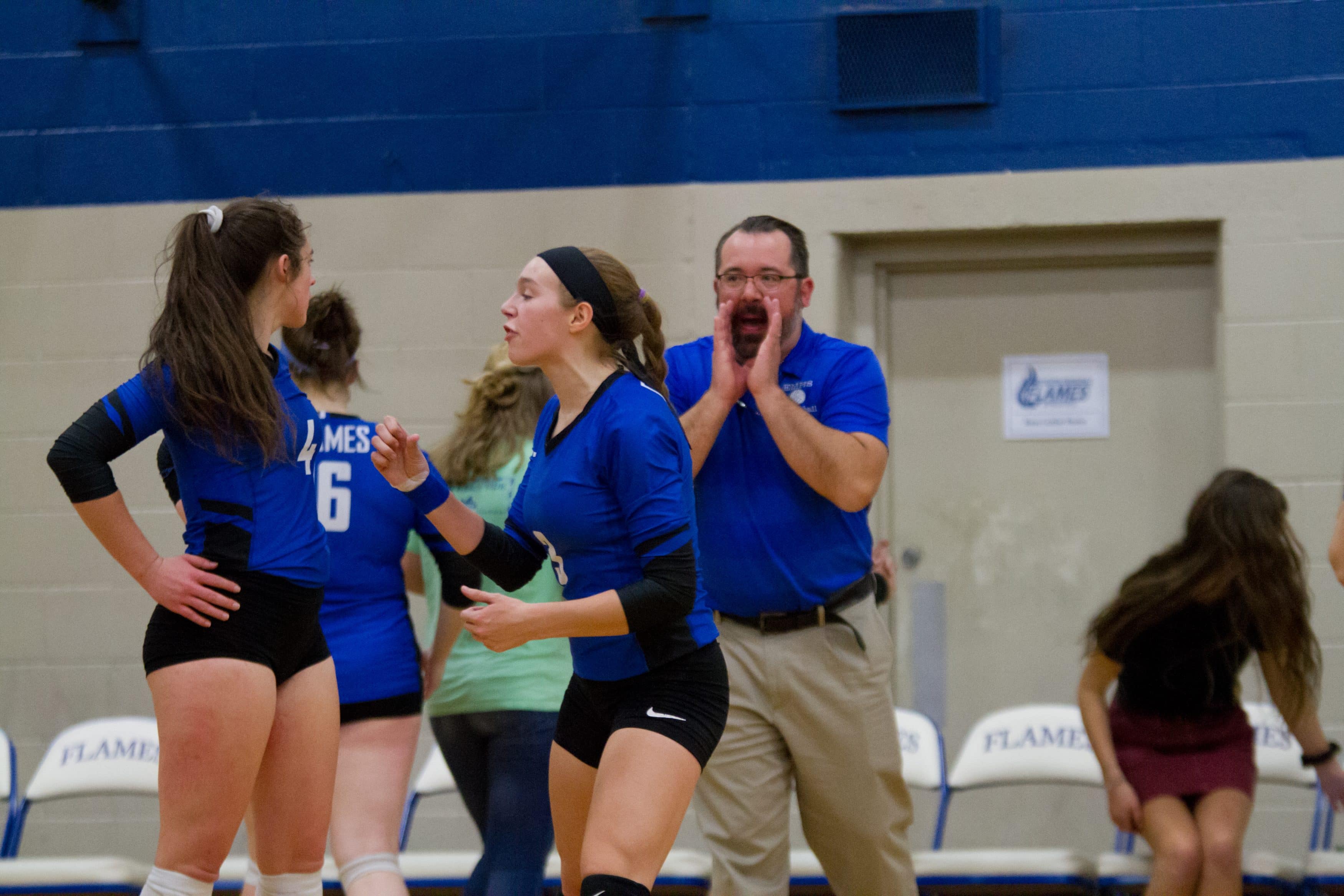 In the Virginia Independent Schools Athletic Association Division III quarterfinals, EMHS had home court advantage on Nov. 6 when the Flames rallied from a two-set deficit to defeat sixth-seeded Guardian Christian Academy 23-25, 25-27, 25-15, 25-21, 15-5. Rowdy fans of all ages filled the house for the thrilling outcome.