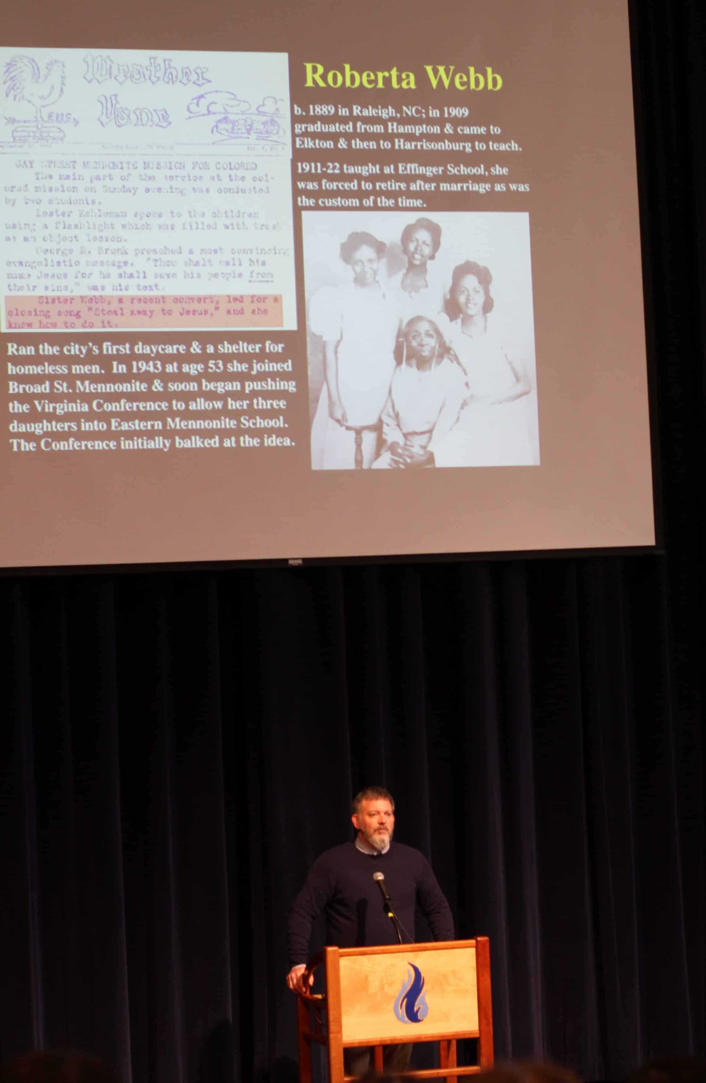 Mark Metzler Sawin, PhD, told the story of Eastern Mennonite School’s (and later college and university) history with integration. Peggy Webb, daughter of legendary African-American community leader and educator, Roberta Webb, was denied entry to Eastern Mennonite School in 1945. She reapplied in 1952 and gained admission, graduating from EMS one month before the Brown v. Board of Education ruling that declared segregation in public schools unconstitutional.