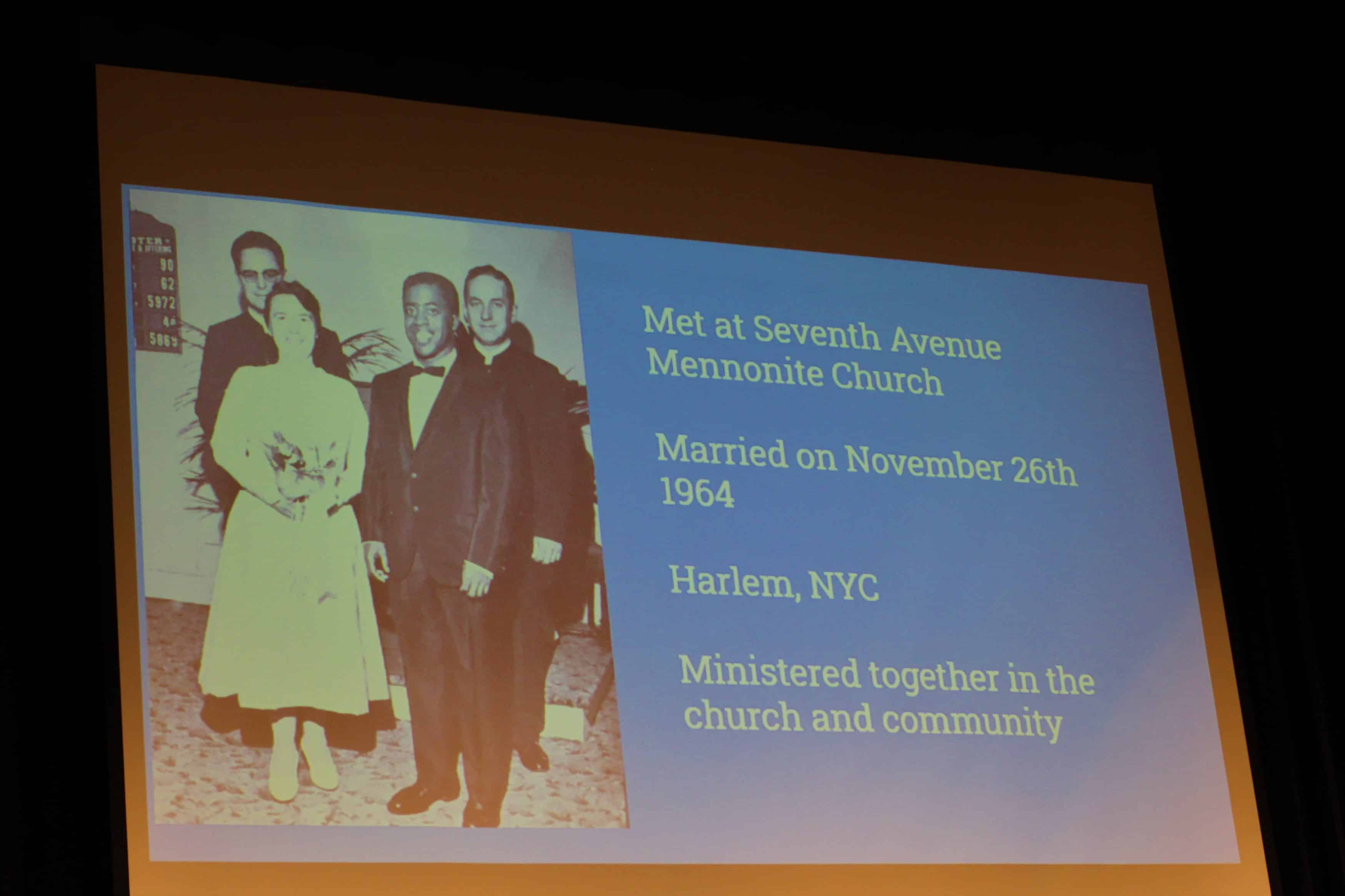 Melody Pannell, MSW, MDiv. and MACE, shared about the marriage of her white mother — one of 17 children from a conservative Mennonite family in Elizabethtown, Pa. — and her African-American father, from Coatsville, Pa. The two met in Voluntary Service at Seventh Avenue Mennonite Church in Harlem, and married in 1964.