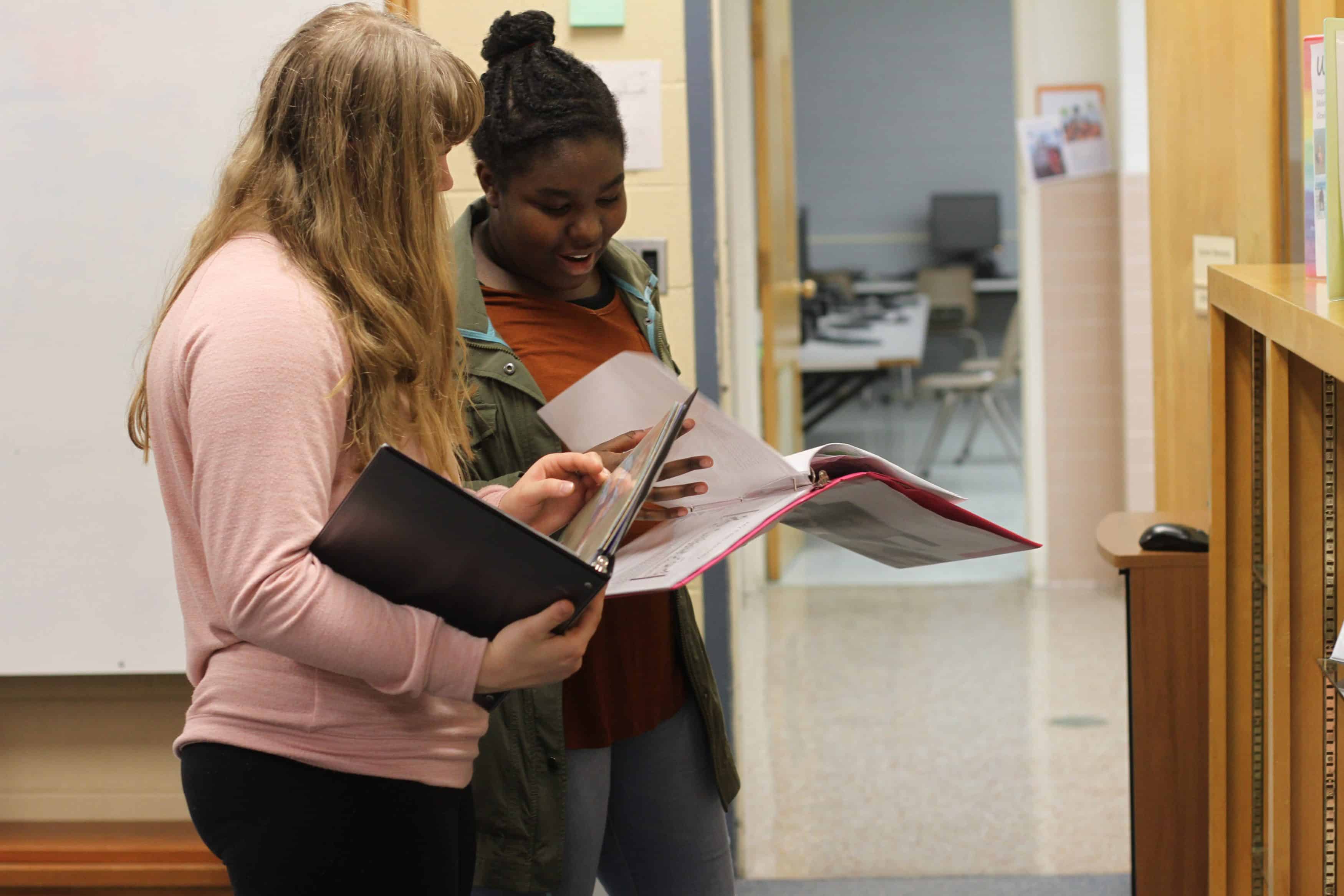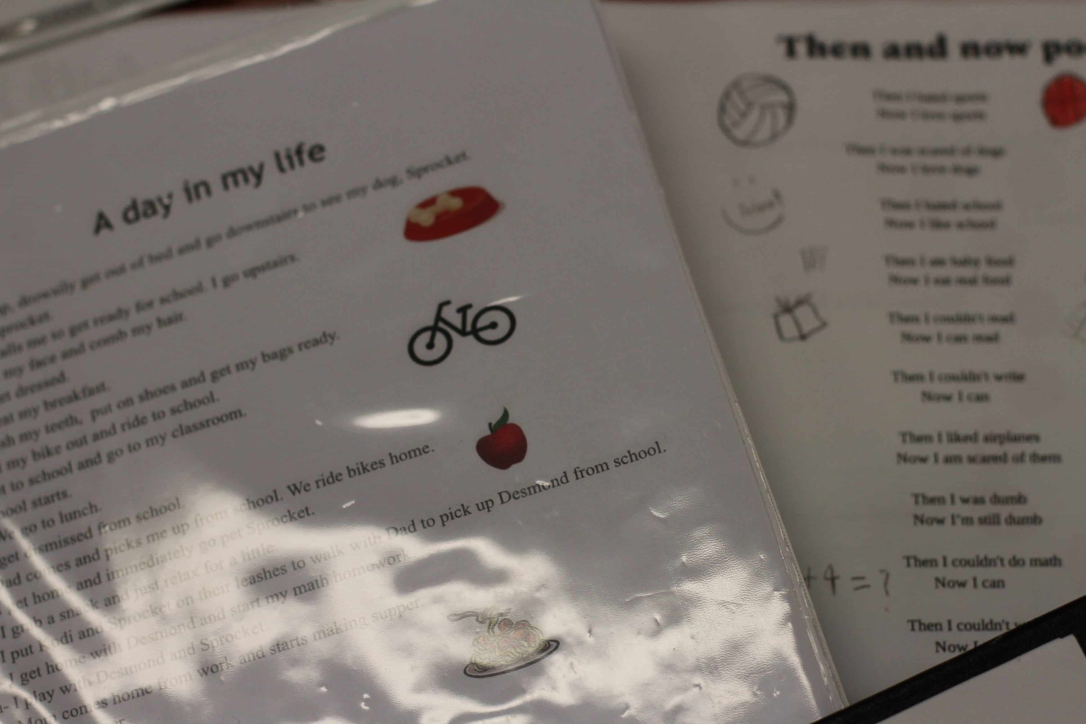 The notebooks on display showcase students’ personal style. Pages in sleeve protectors feature poems, prose, artwork, photos, free-hand lettering, computer-generated graphic design, scrap booking skills, and stickers.