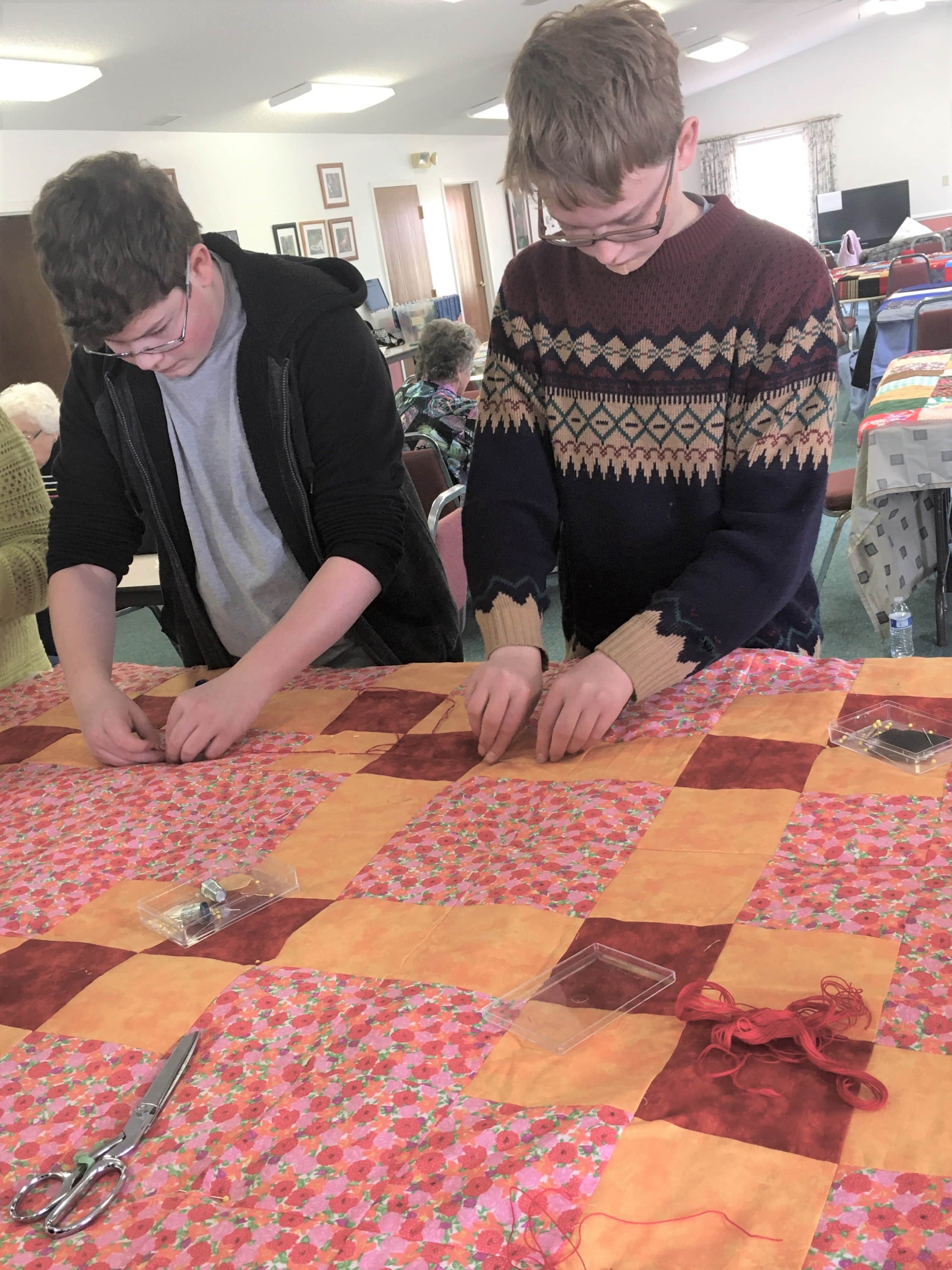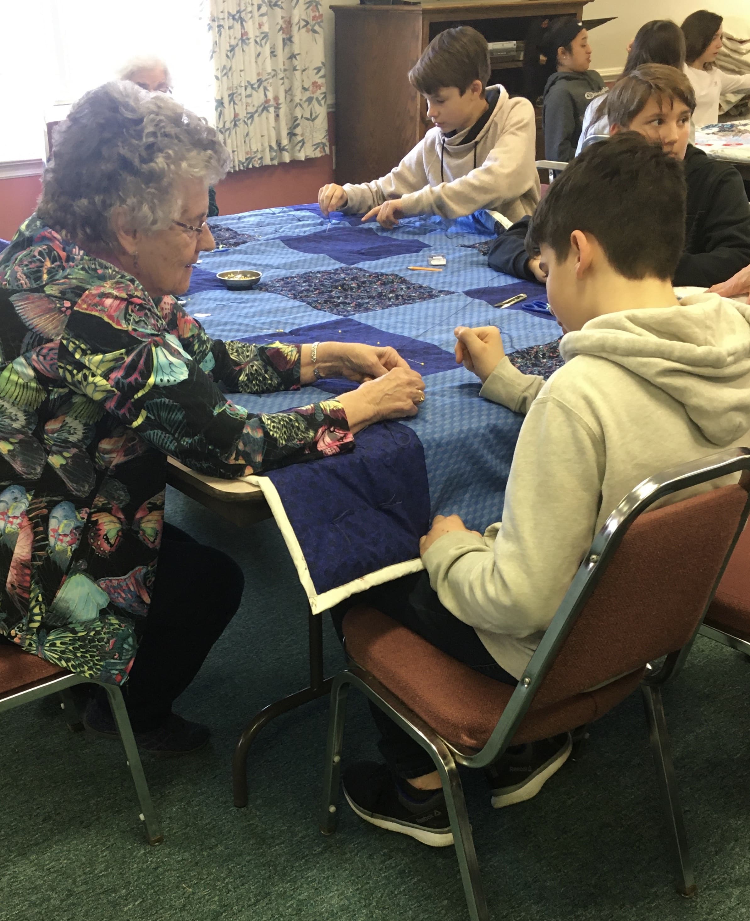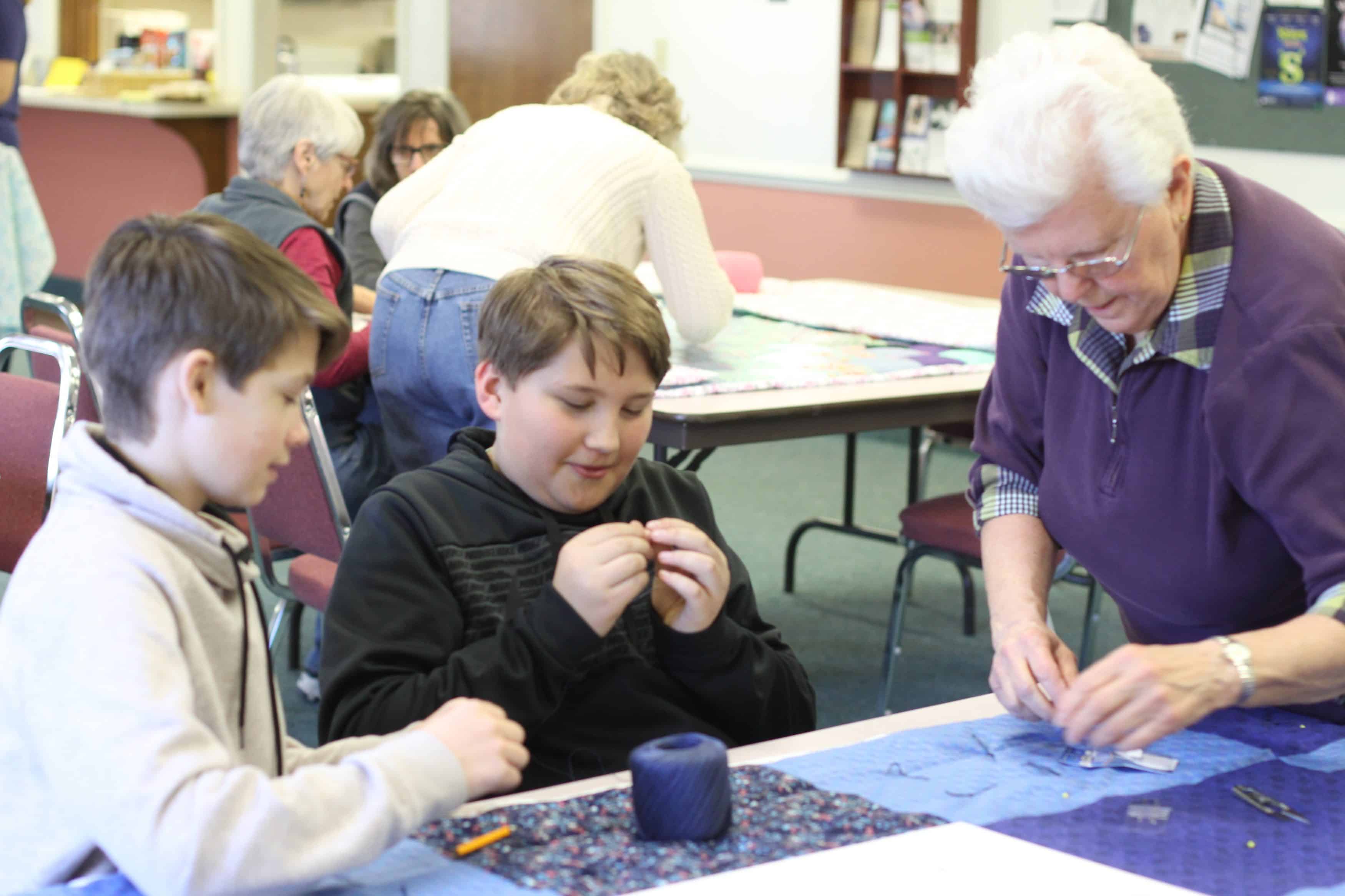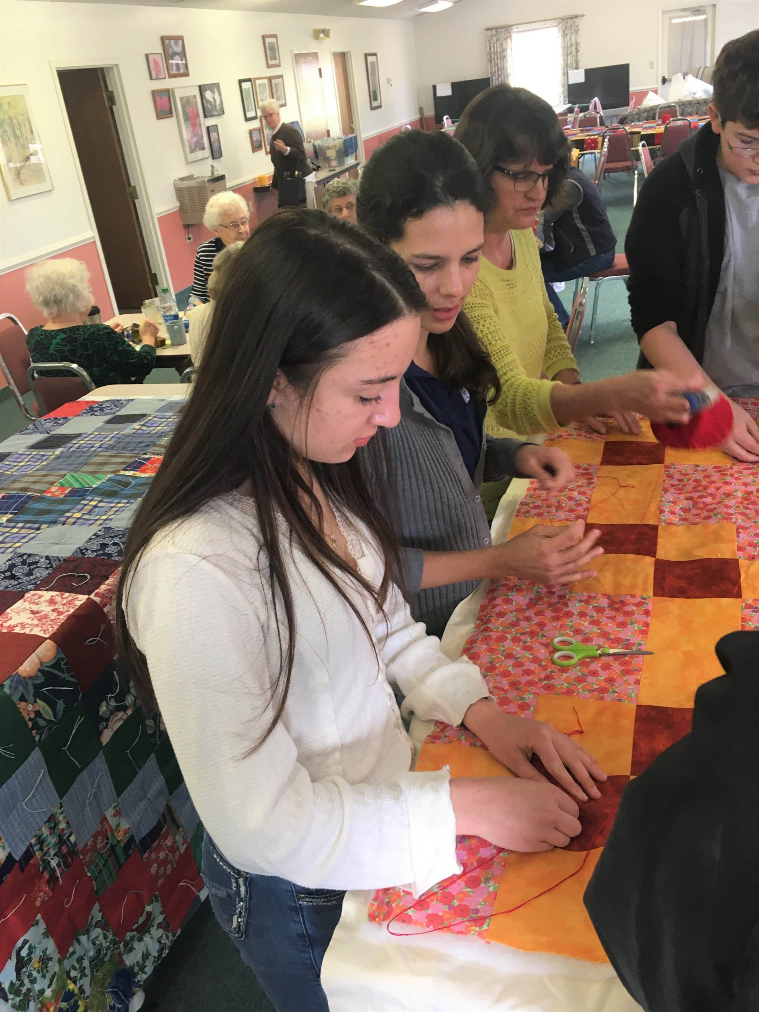 This was a wonderful shared event with the students. Priceless conversation flowed between the generations and getting 40 comforters made for MCC over the two days was a record for our group. Thank you for joining us.