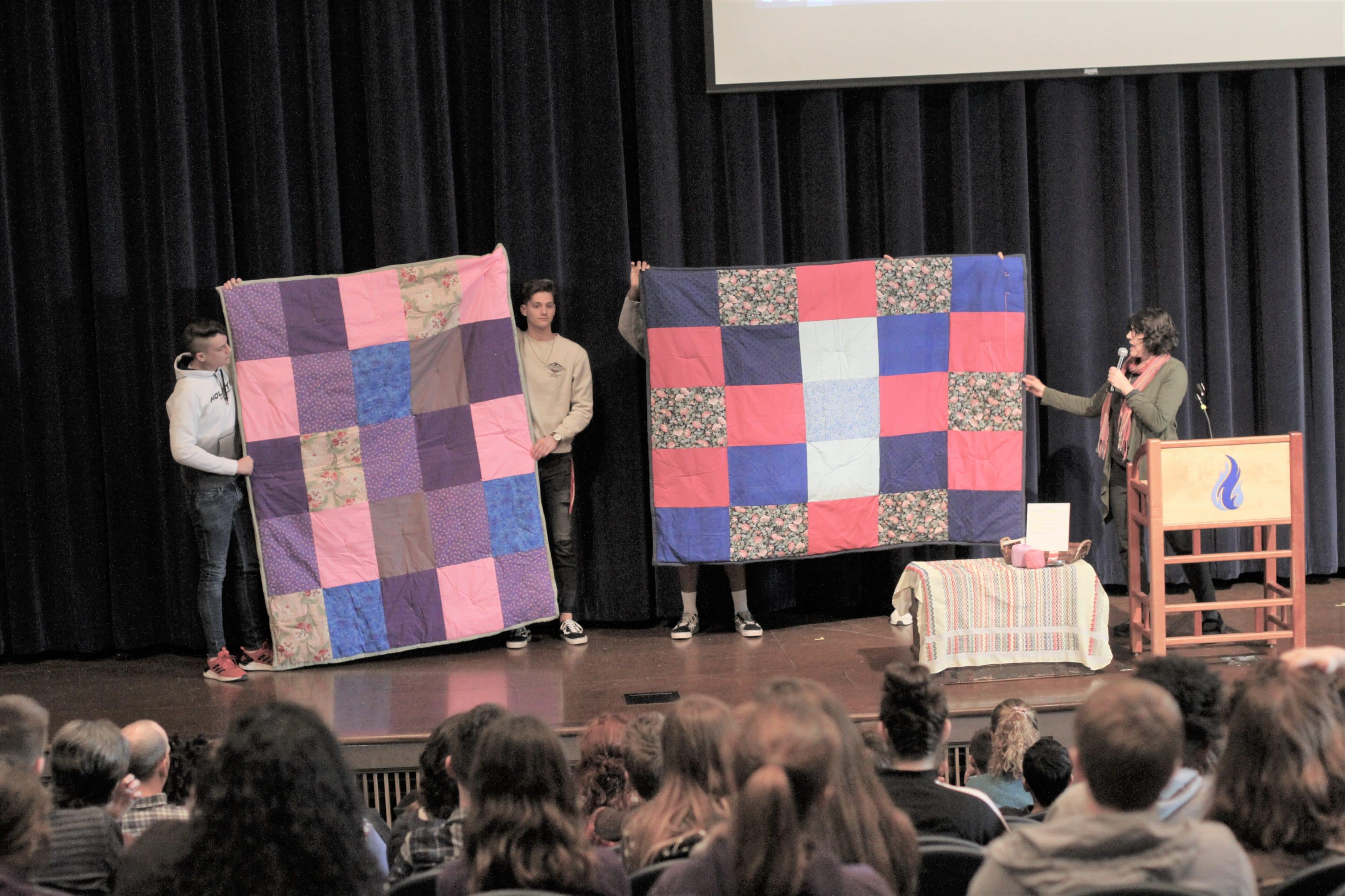 In chapel, students grades 6 to 12 and visiting kindergartners learned that MCC sent more than 53,000 handmade comforters to people lacking basic necessities last year. See video.
