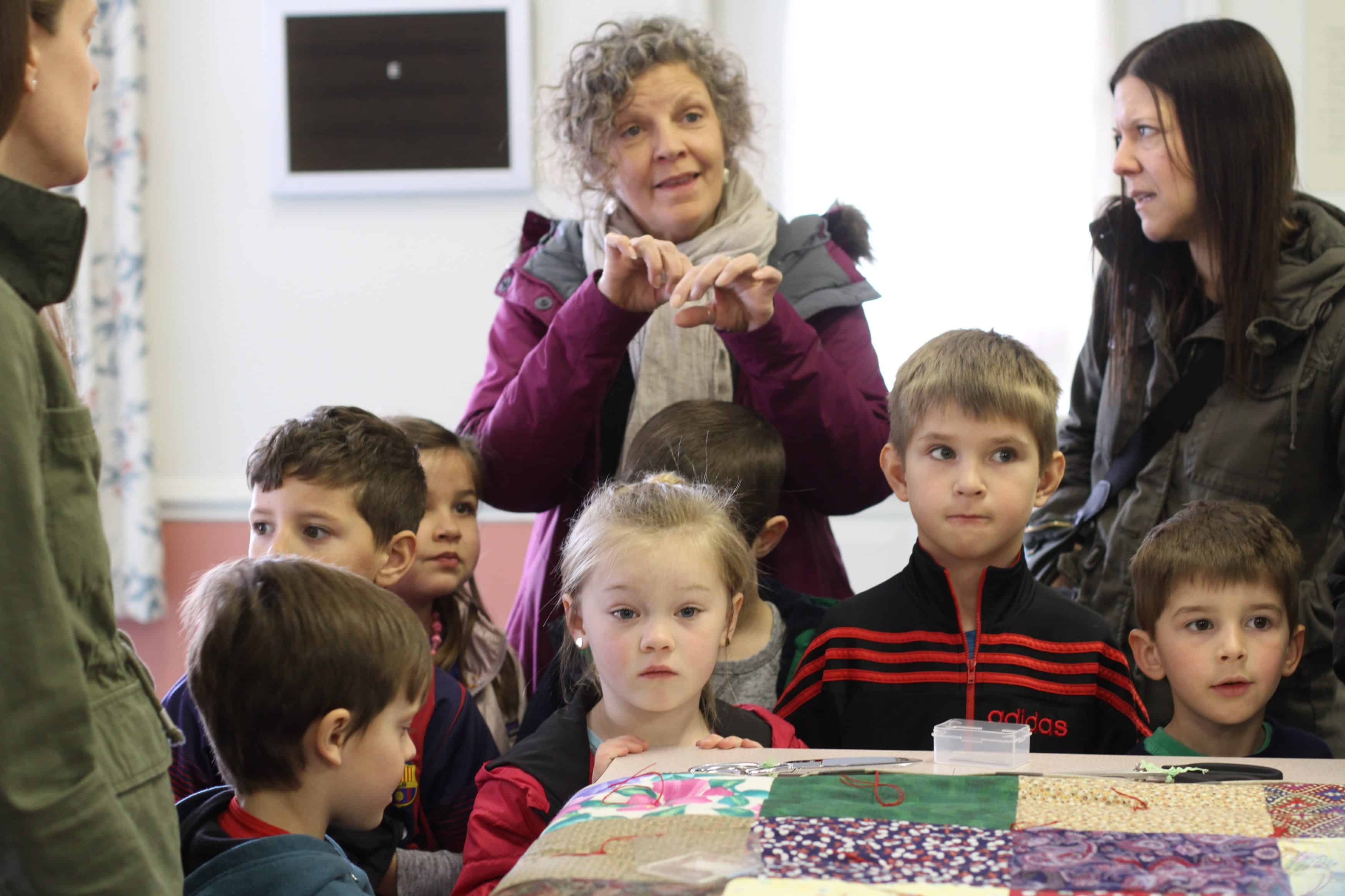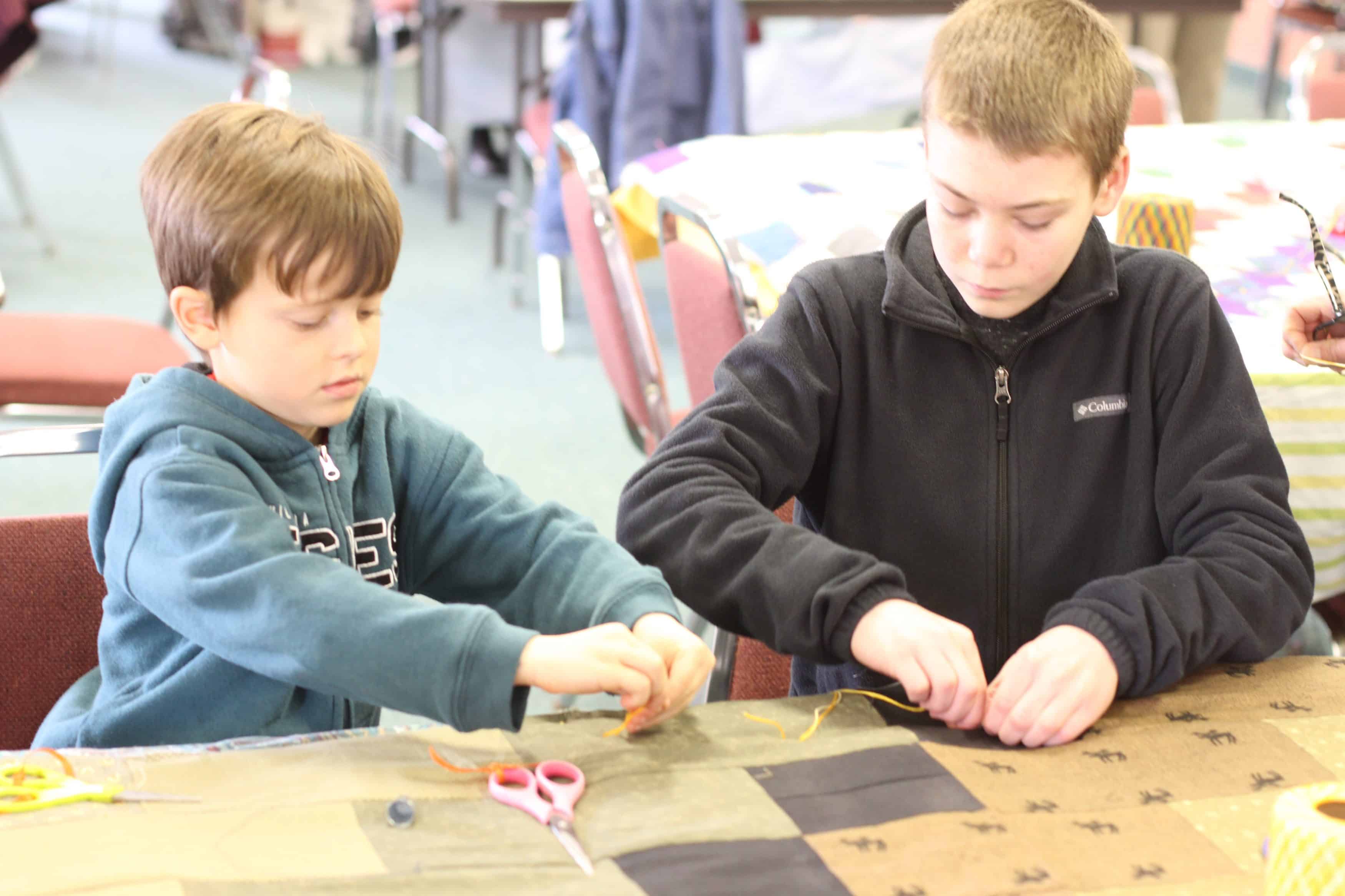 EMS students of all ages added knots to pieced comforters March 5 and 6; the blankets will be shared in the United States and around the world by Mennonite Central Committee (MCC) with people who are displaced by war or natural disaster.