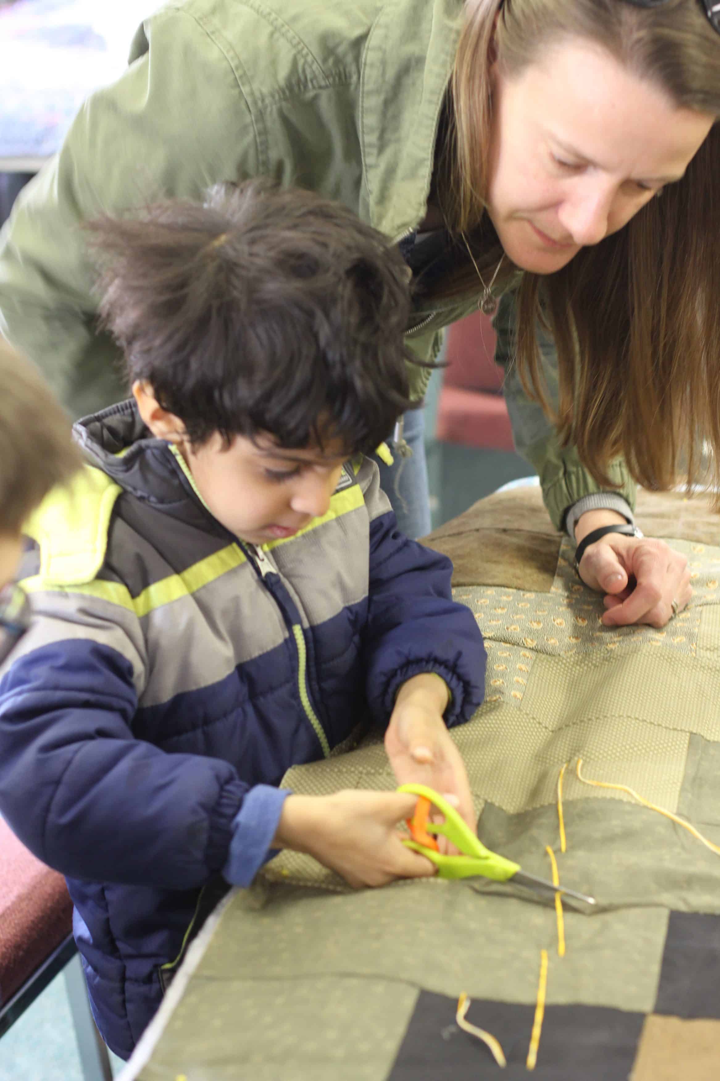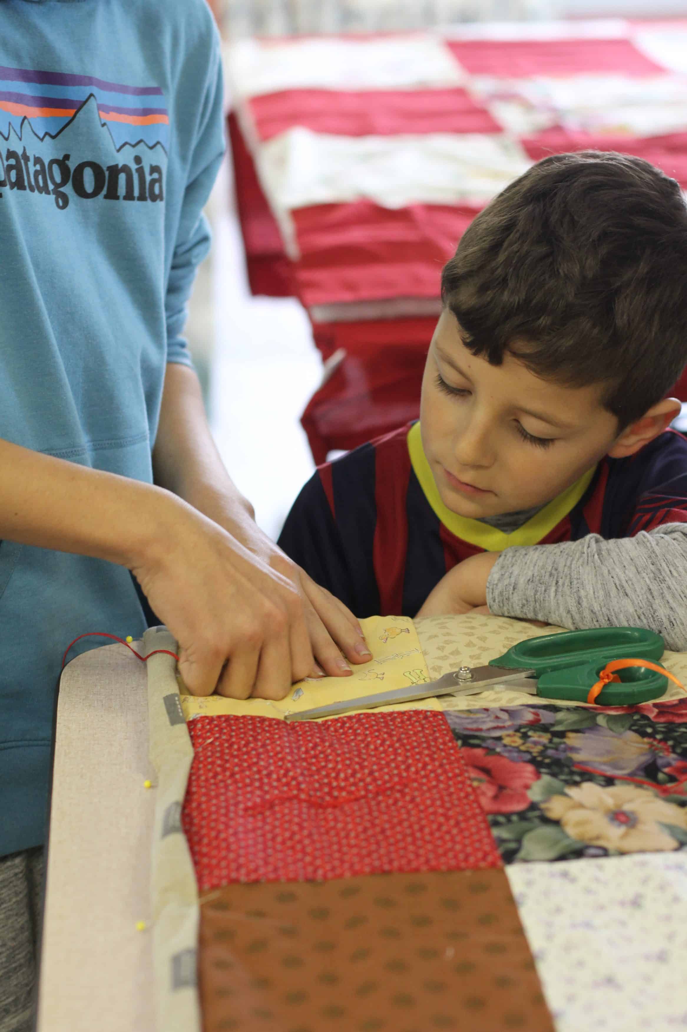 On Friday, the kindergarten class joined 8th graders where they paired up to sew, snip and tie. The rest of the elementary school will have their own blanket “blitz” in their building with parent and grandparent support in the coming weeks.