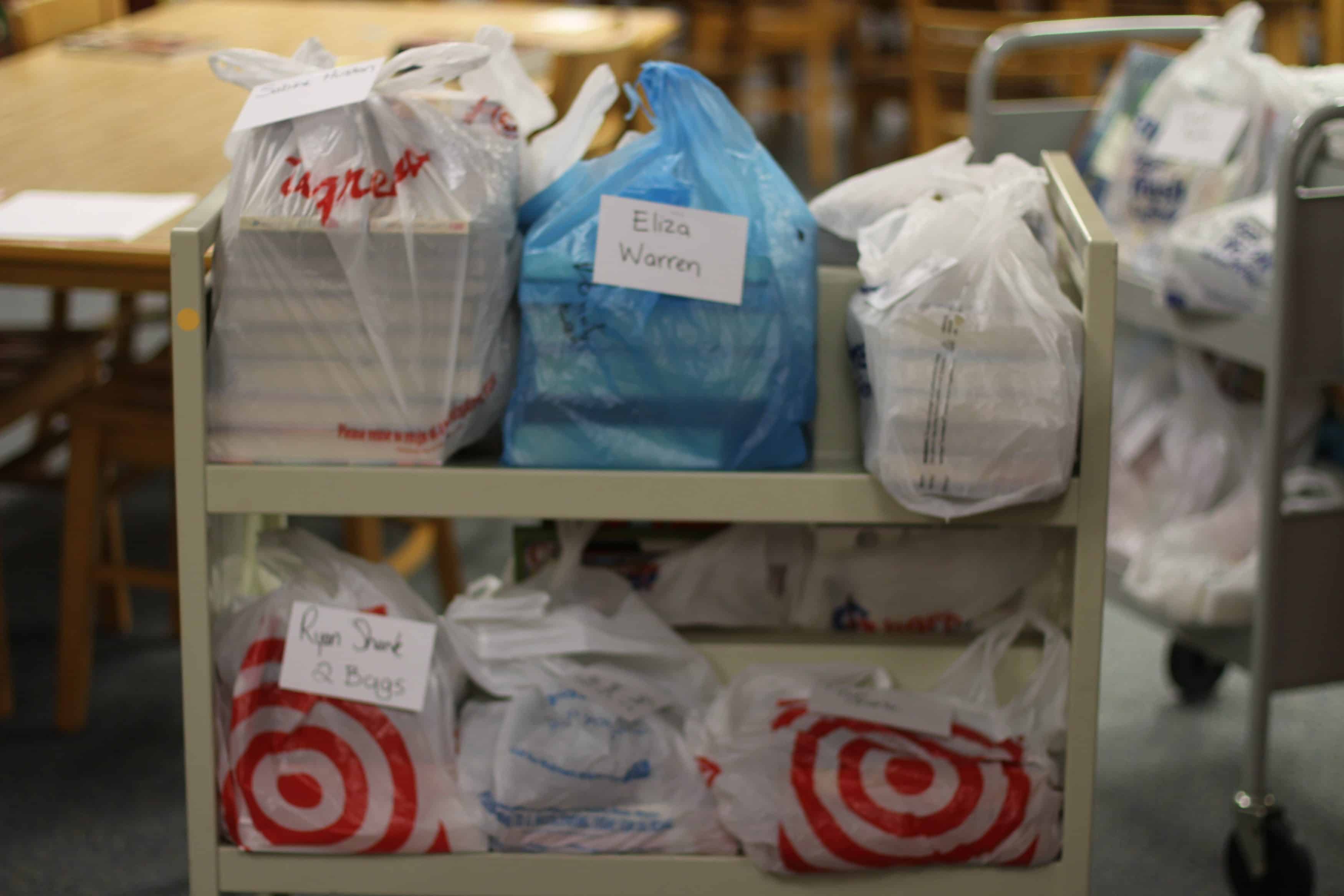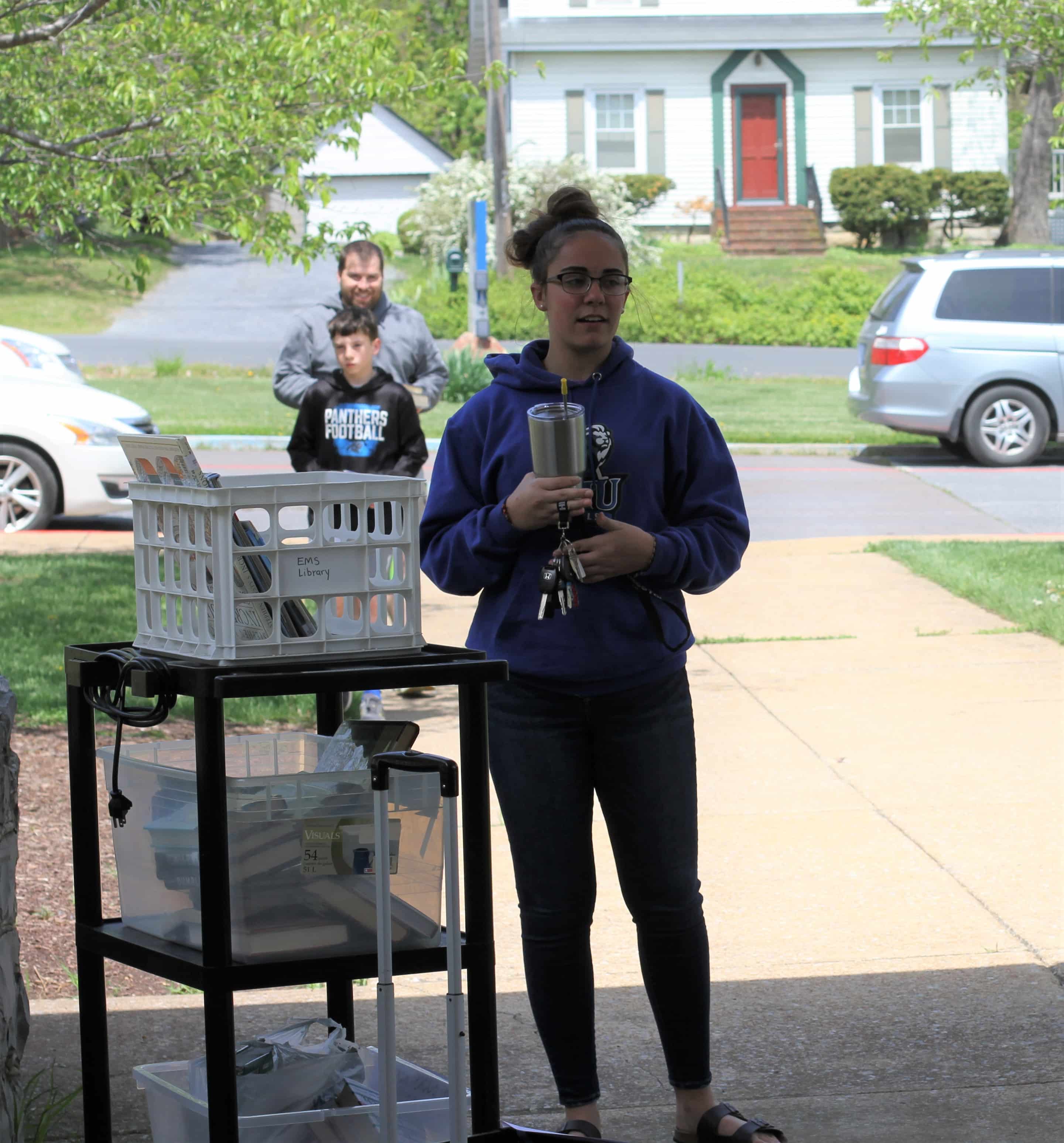 Ross had invited students — and families — to look at the school library‘s online catalog and list the books they wanted to pick up on a Google doc. She pulled and bagged the titles and had them ready for students to pick up at a safe distance at the appointed time in front of the school.