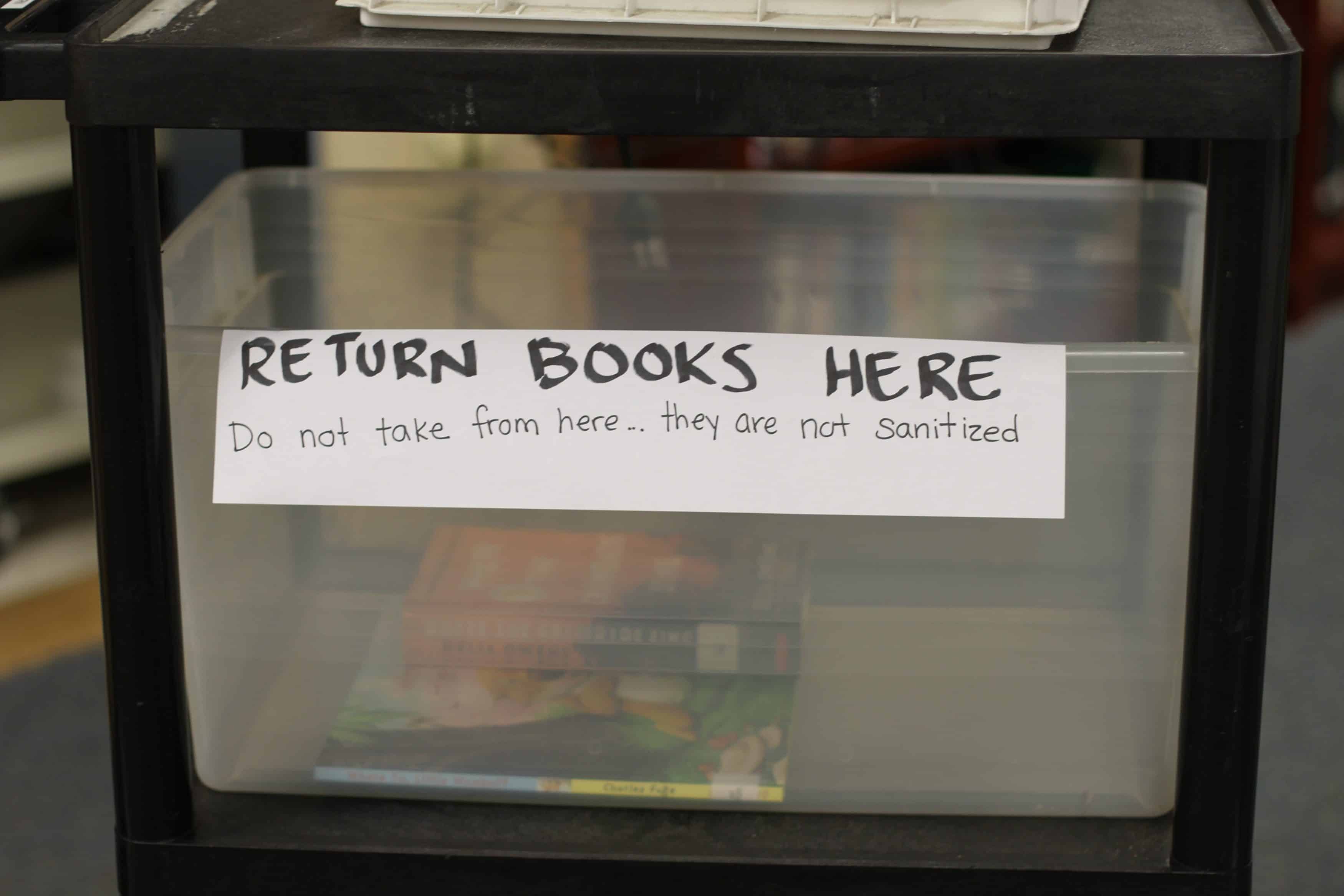 Returned books that had been checked out on the day students gathered items to prepare for distance learning were returned to a box to sit for at least 72 hours before being re-shelved.
