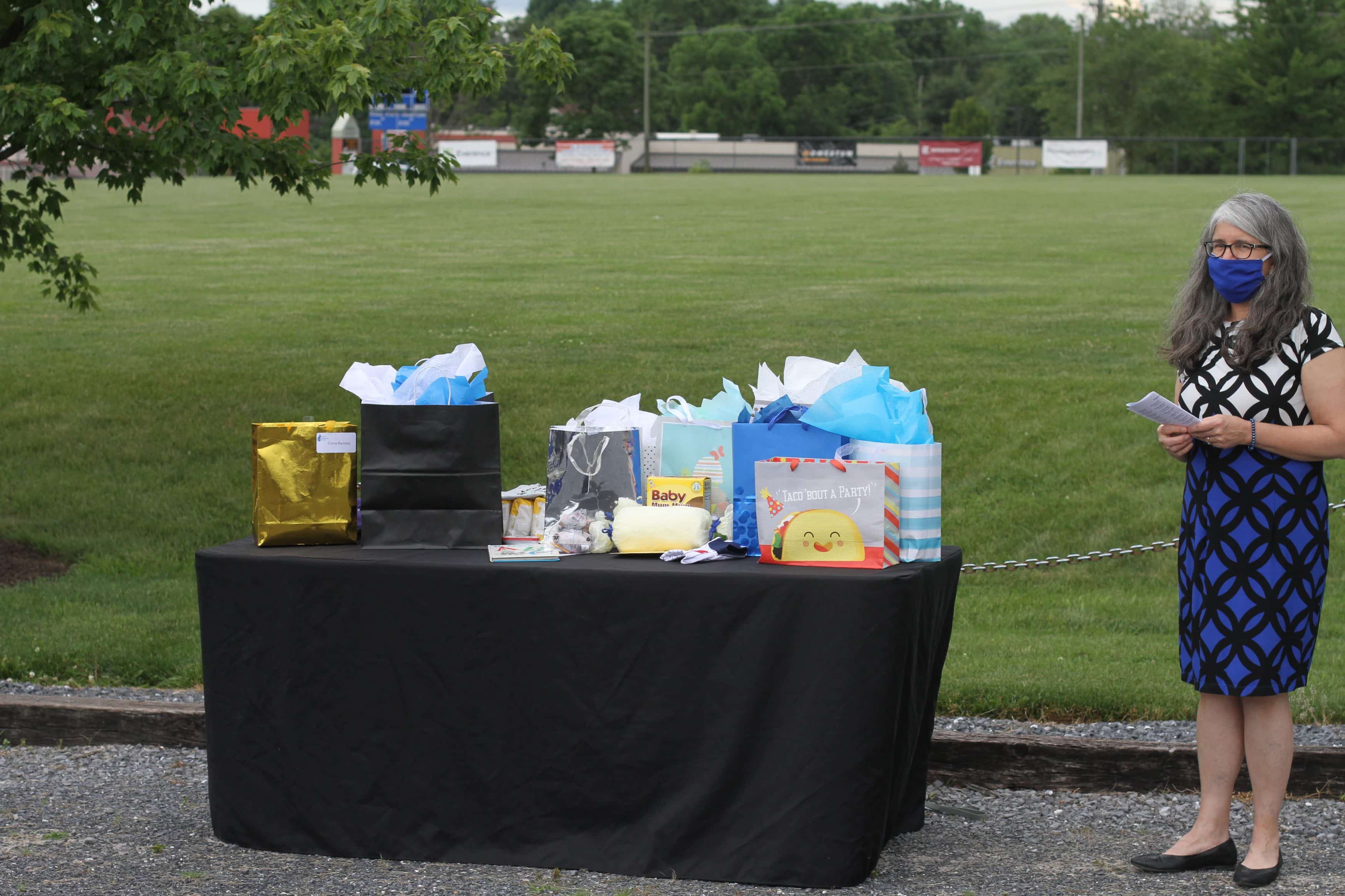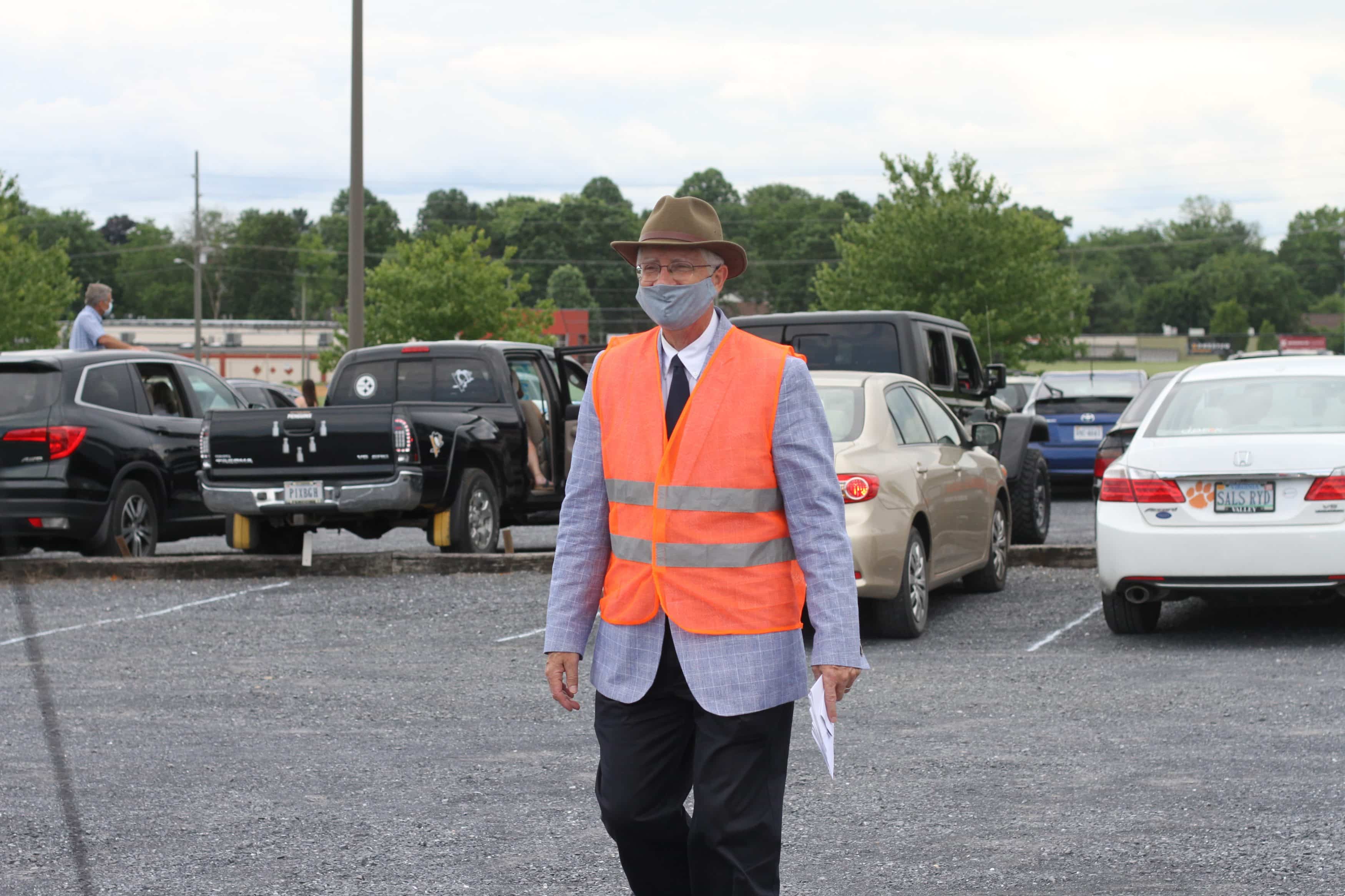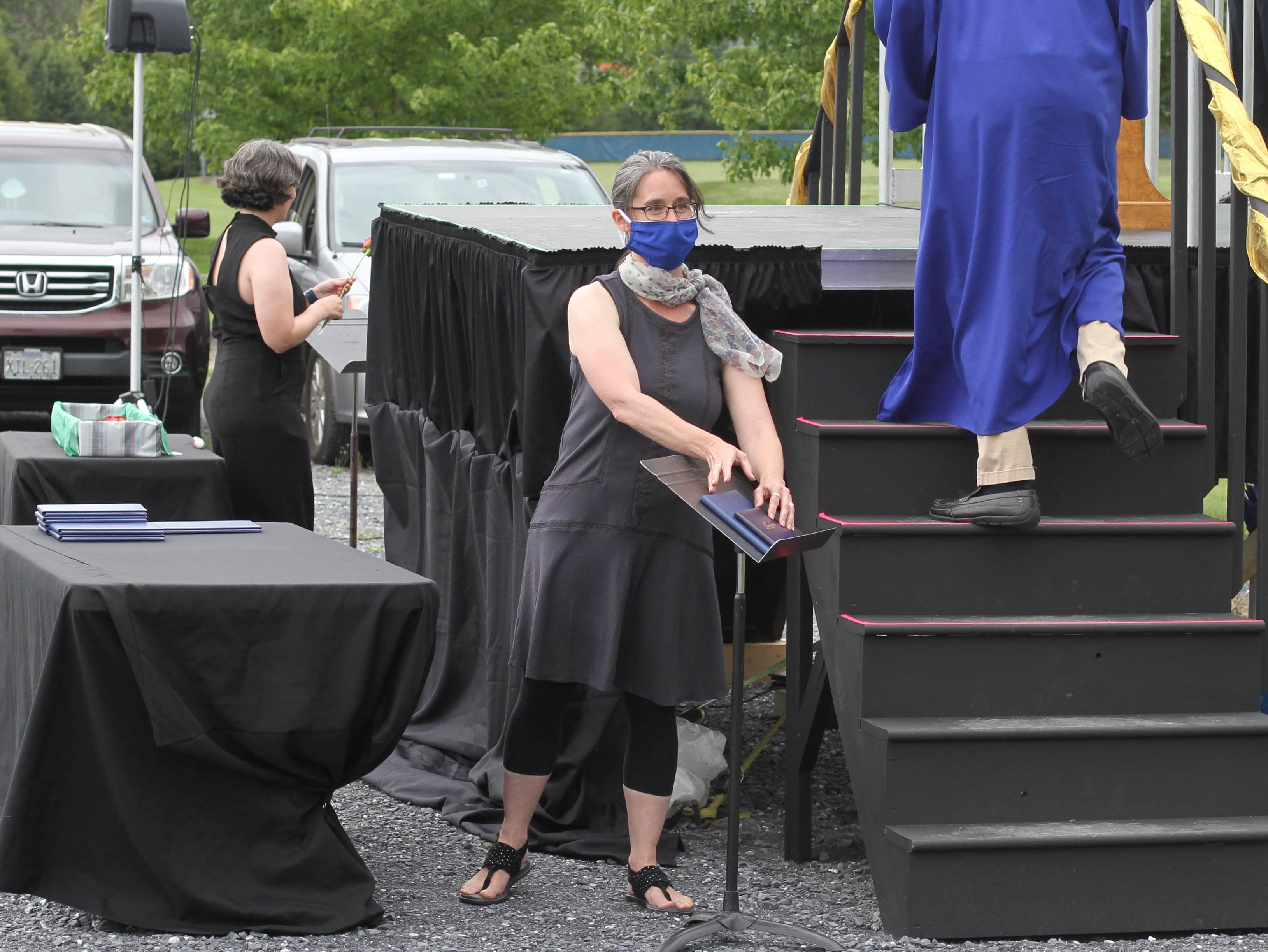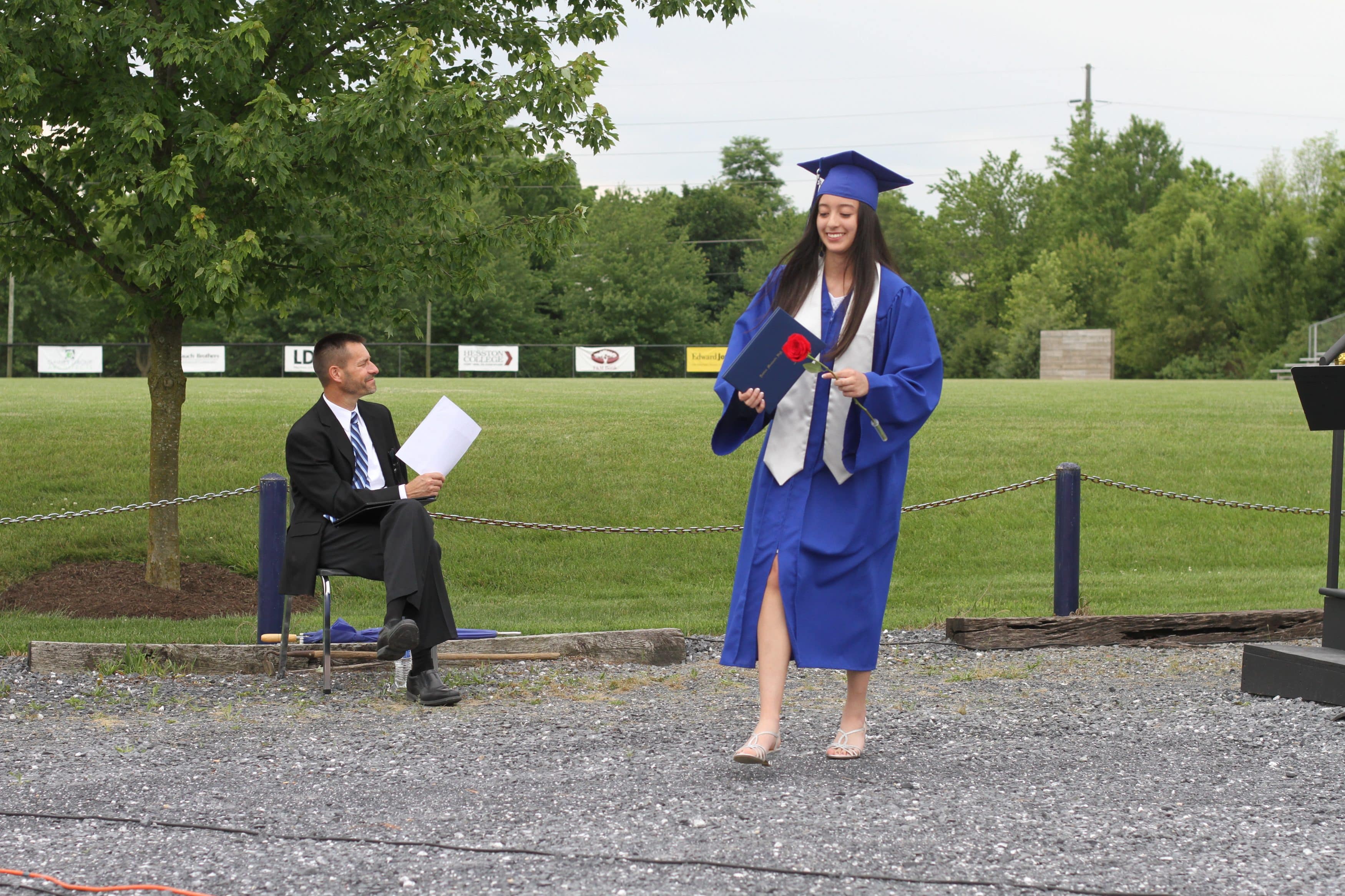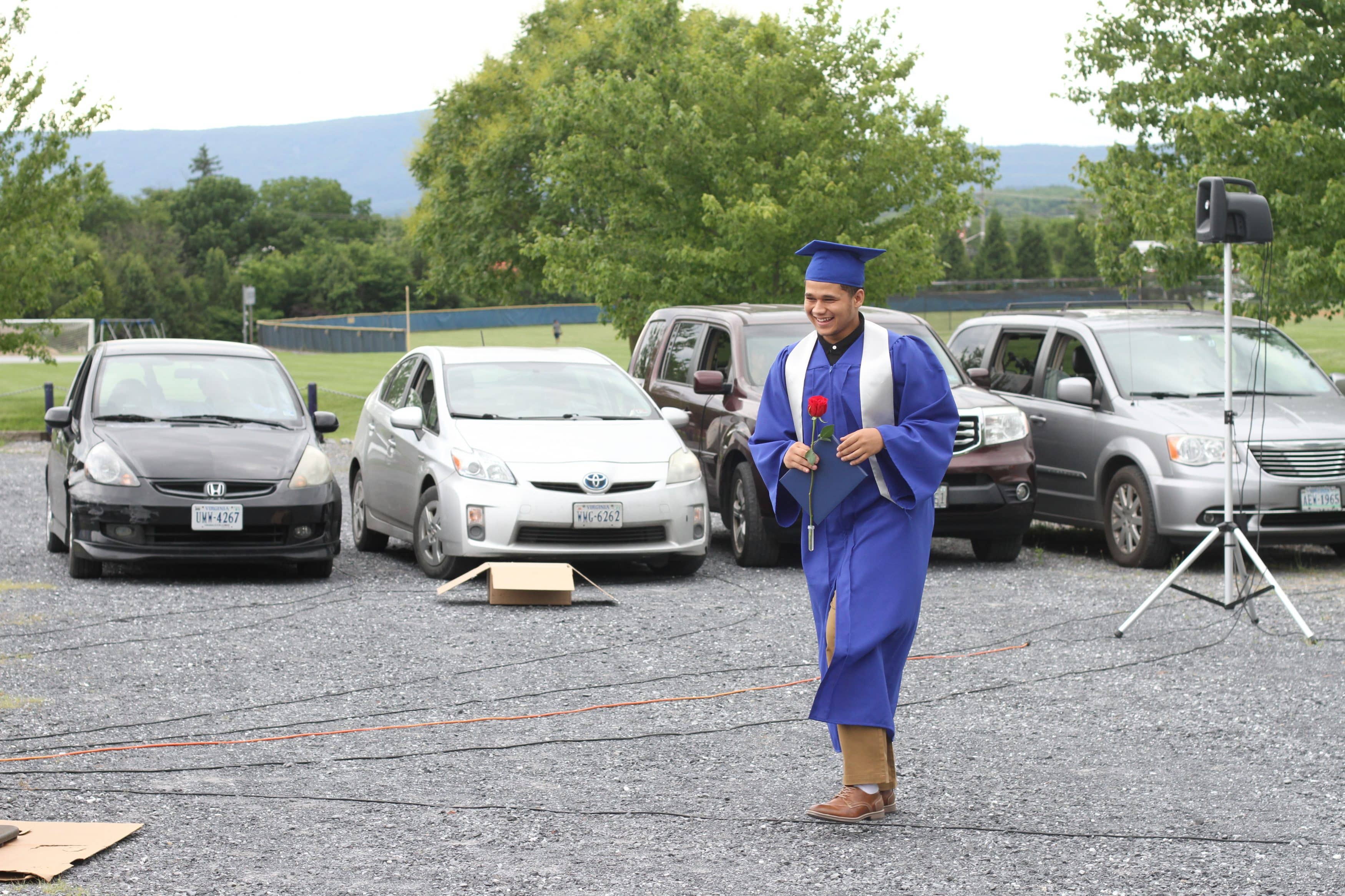 Justin King, high school principal, called each graduate to the front, one by one, exiting their cars and making their way across the parking lot. They picked up their diploma as they climbed up to the stage and paused for a distanced picture with Mr. King, and descended to receive the traditional rose, picked up with no touching.