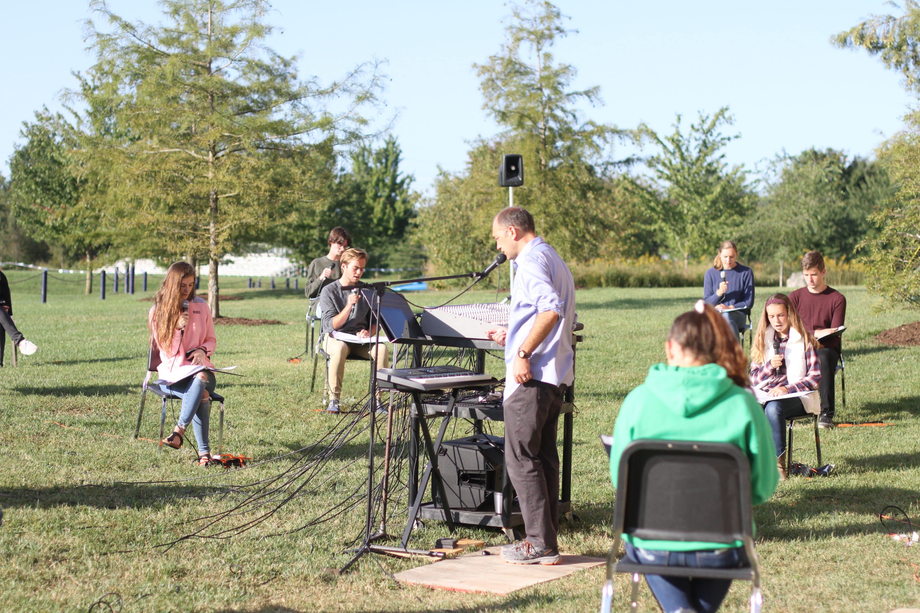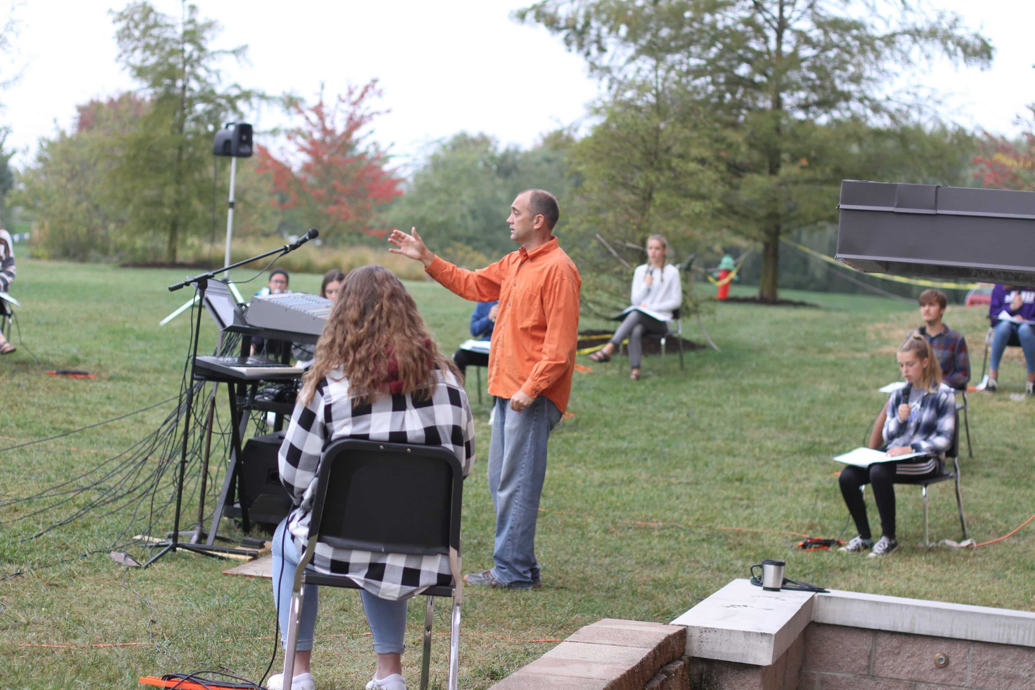 “That this works as well as it does is a tribute to the skill and perseverance of (y)our students,” wrote Stutzman in a recent letter to Touring Choir parents. “They (and I) have had to relearn entirely how to listen to each other through a sound system, how to modulate and balance their voices through a microphone, how to tune to each other. Many singing techniques and rules of thumb that work indoors are reversed outside, and it can be very counter-intuitive. But they are making music at a high level and making the best of this opportunity.”