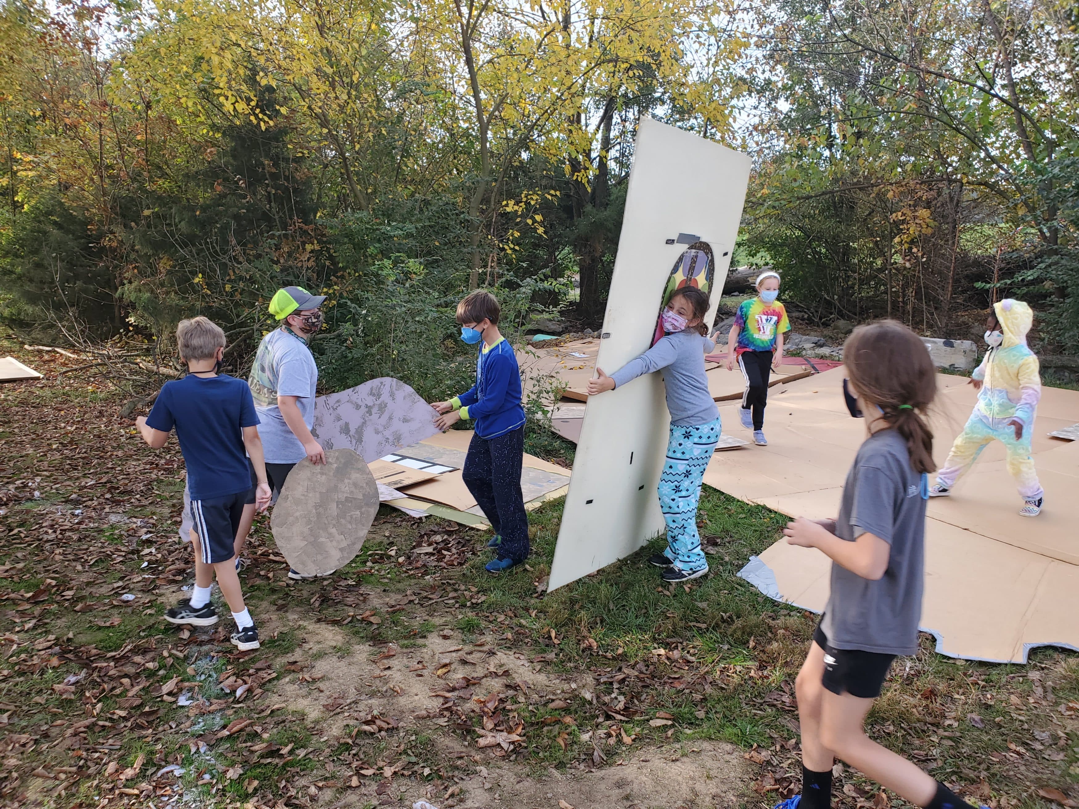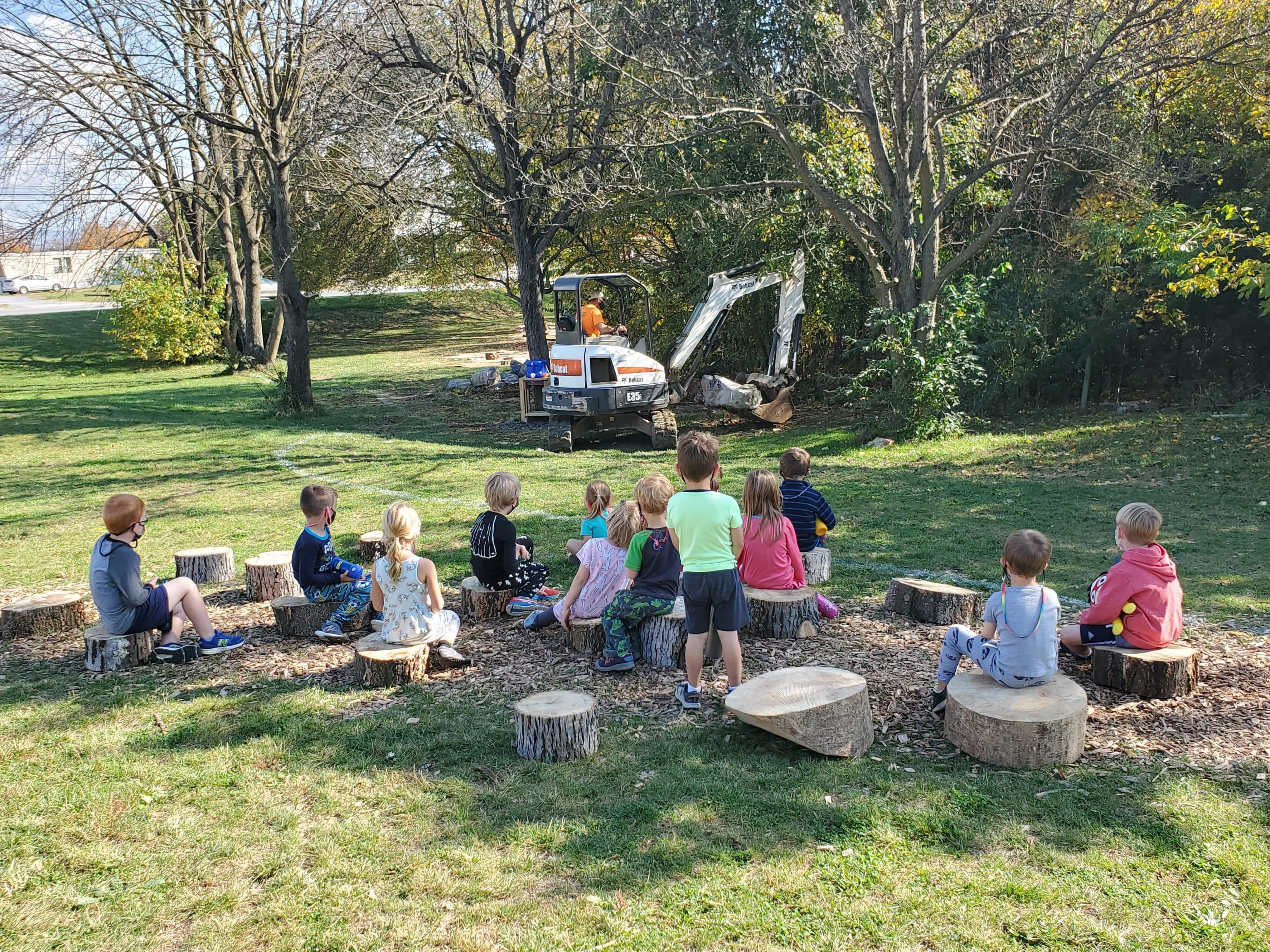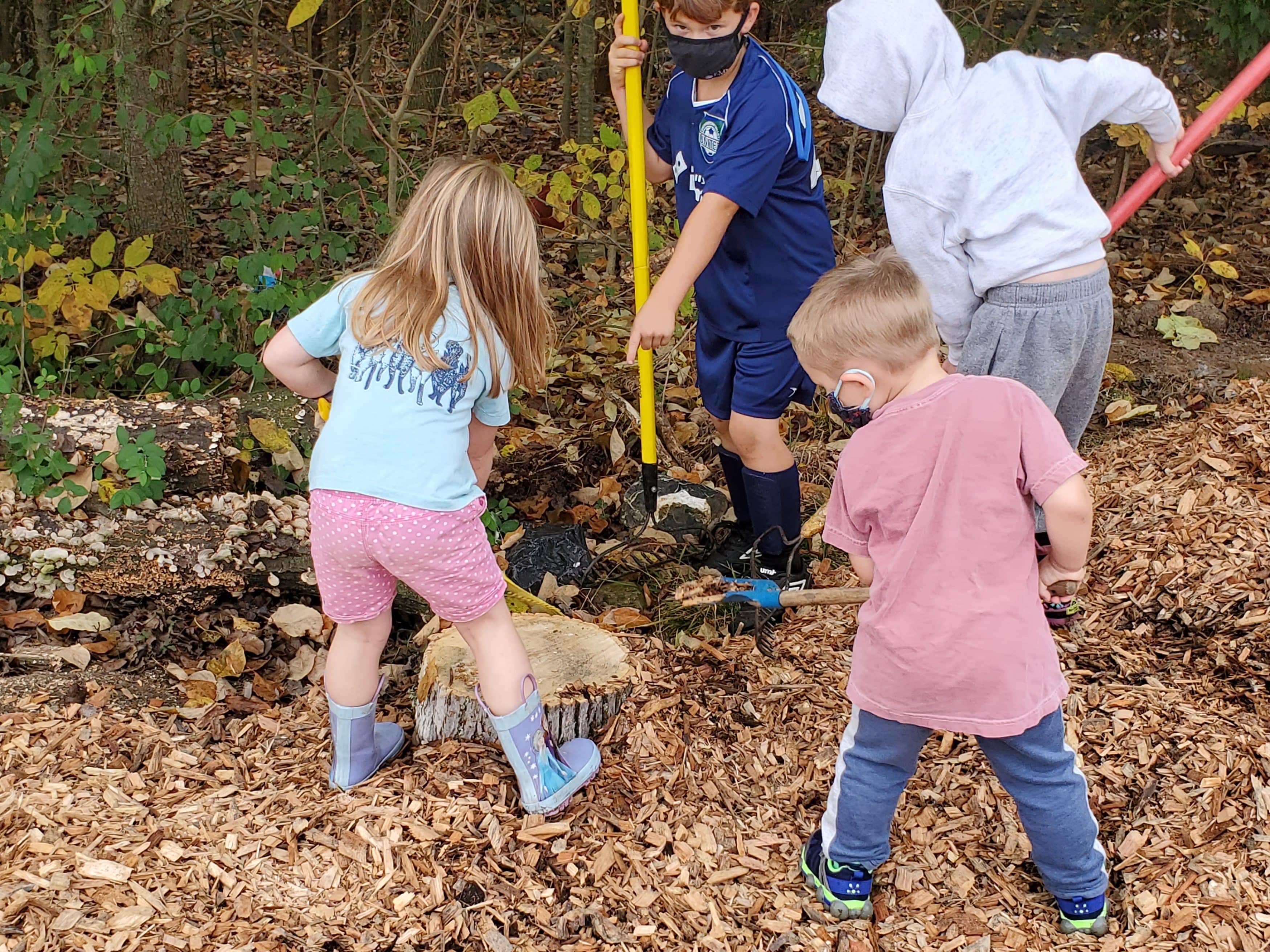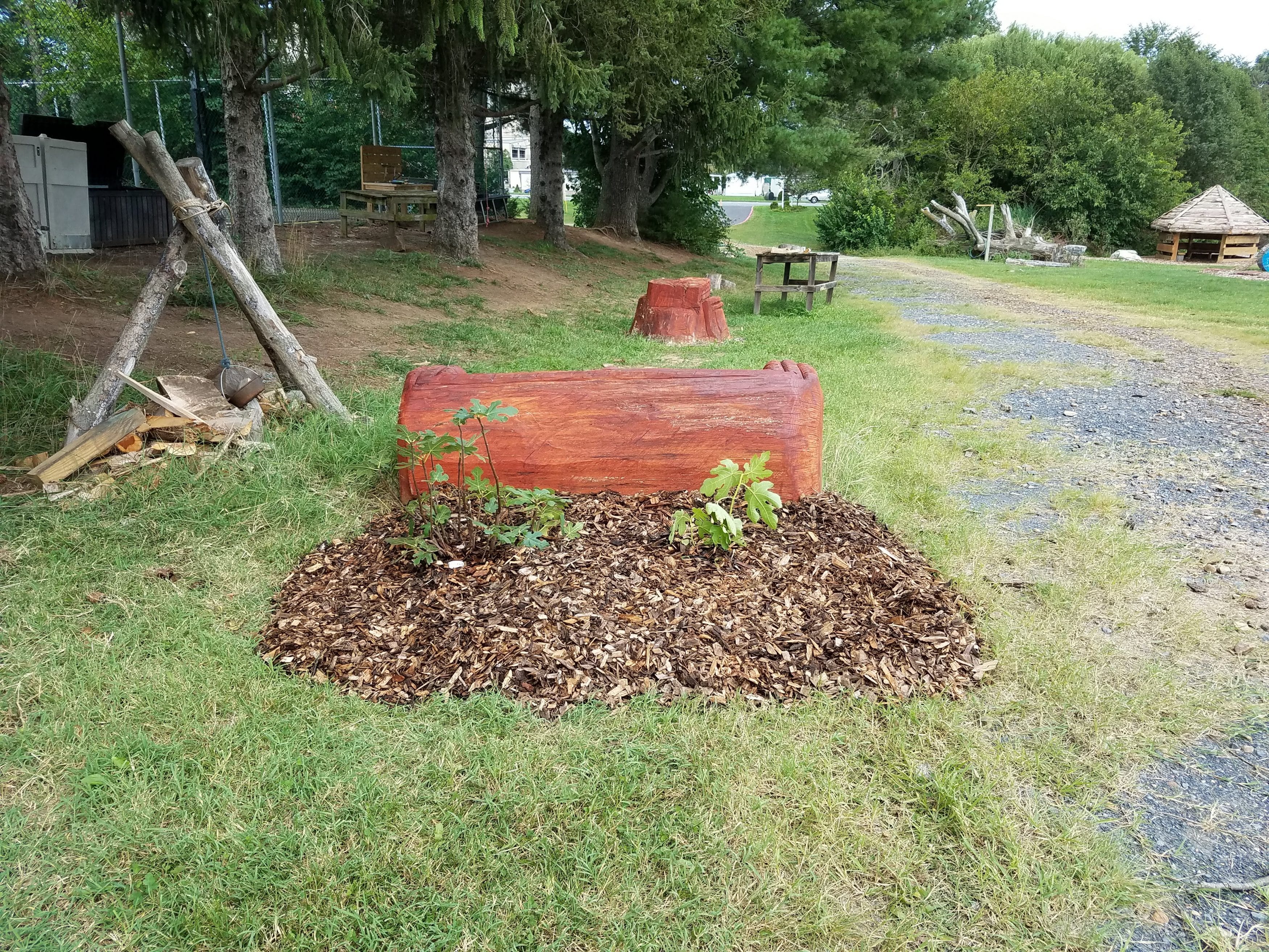 Earlier outdoor learning and play spaces were completed incorporating lessons and labor by middle school students to create climbing and jumping equipment made of logs, stumps and recycled tractor tires.