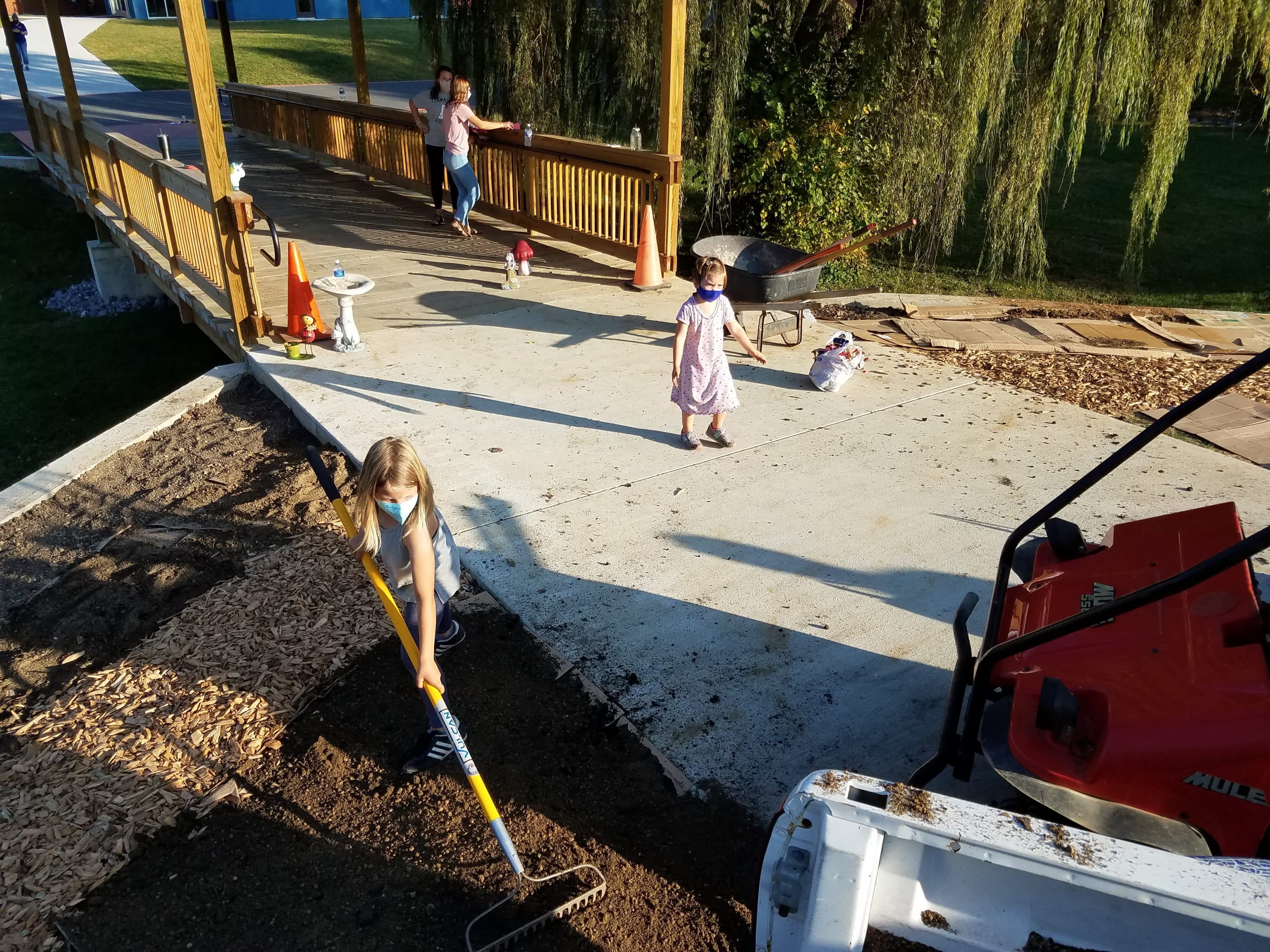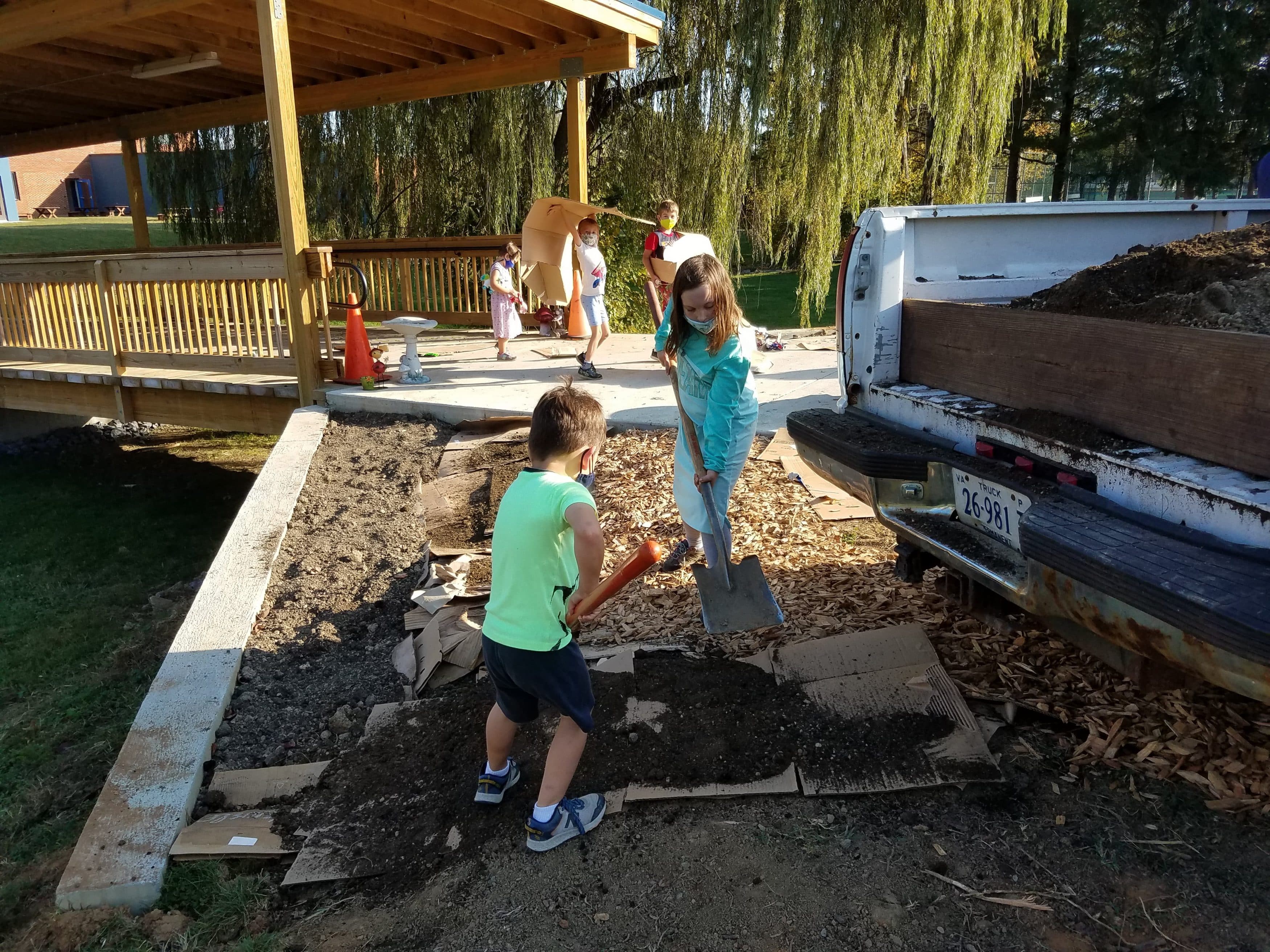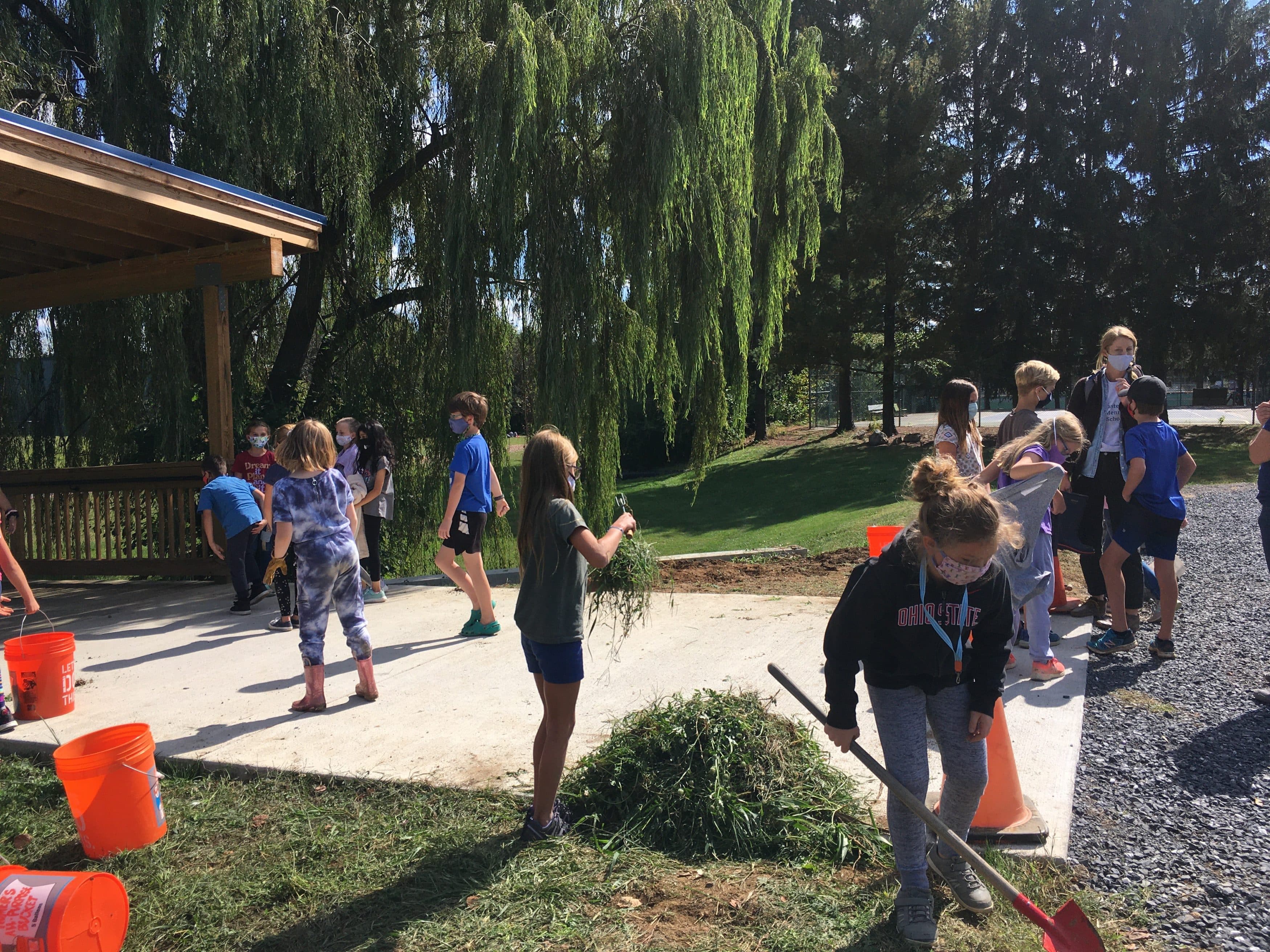 Thanks to more than 30 volunteers putting in dozens of hours over a recent weekend, learning in the outdoors is flourishing at Eastern Mennonite Elementary School. Outdoor classrooms are established and a bridge garden is ready for student gardeners. It’s all part of implementing the master plan for the renovated building which the school occupied inside early in 2020.