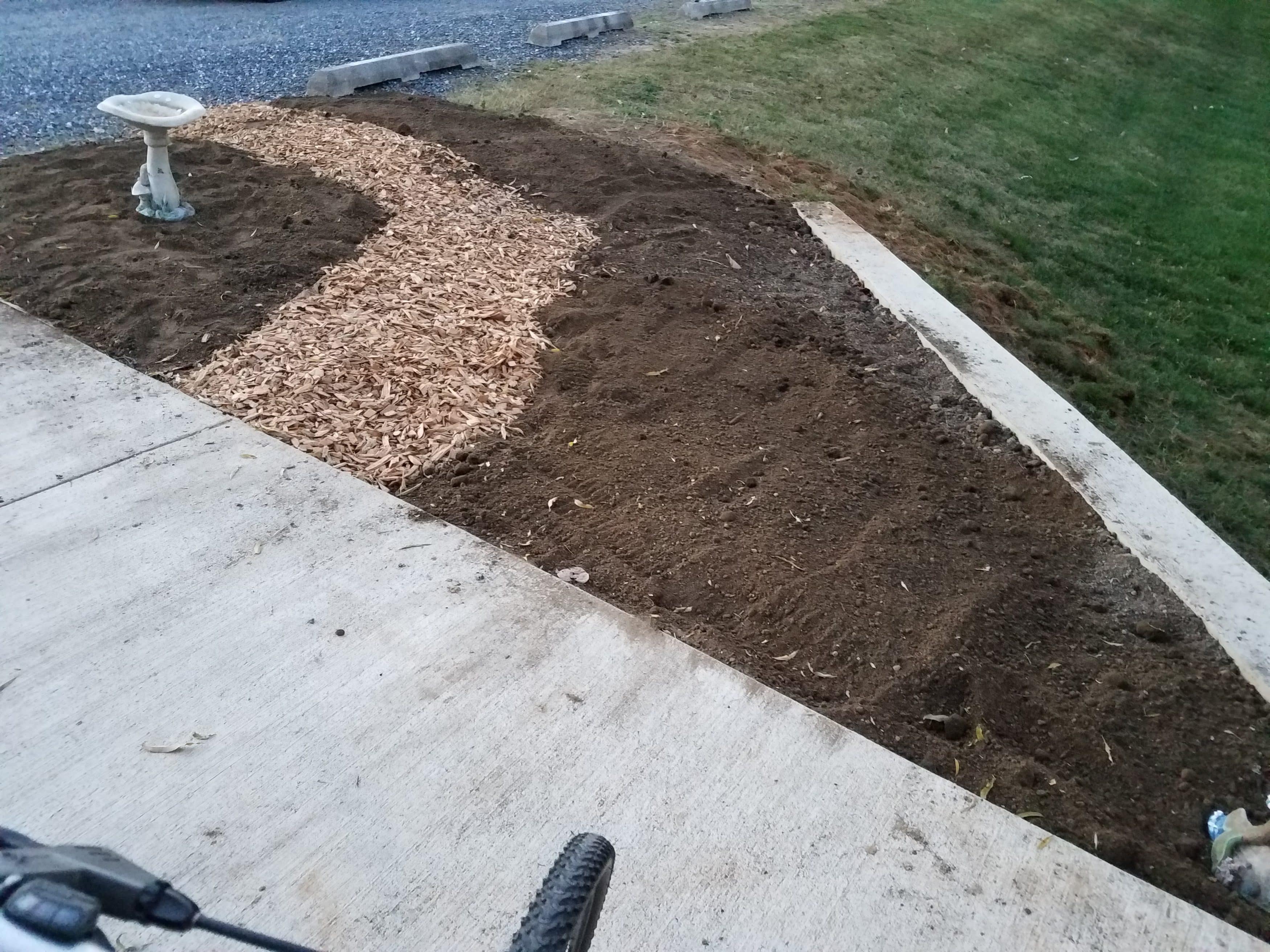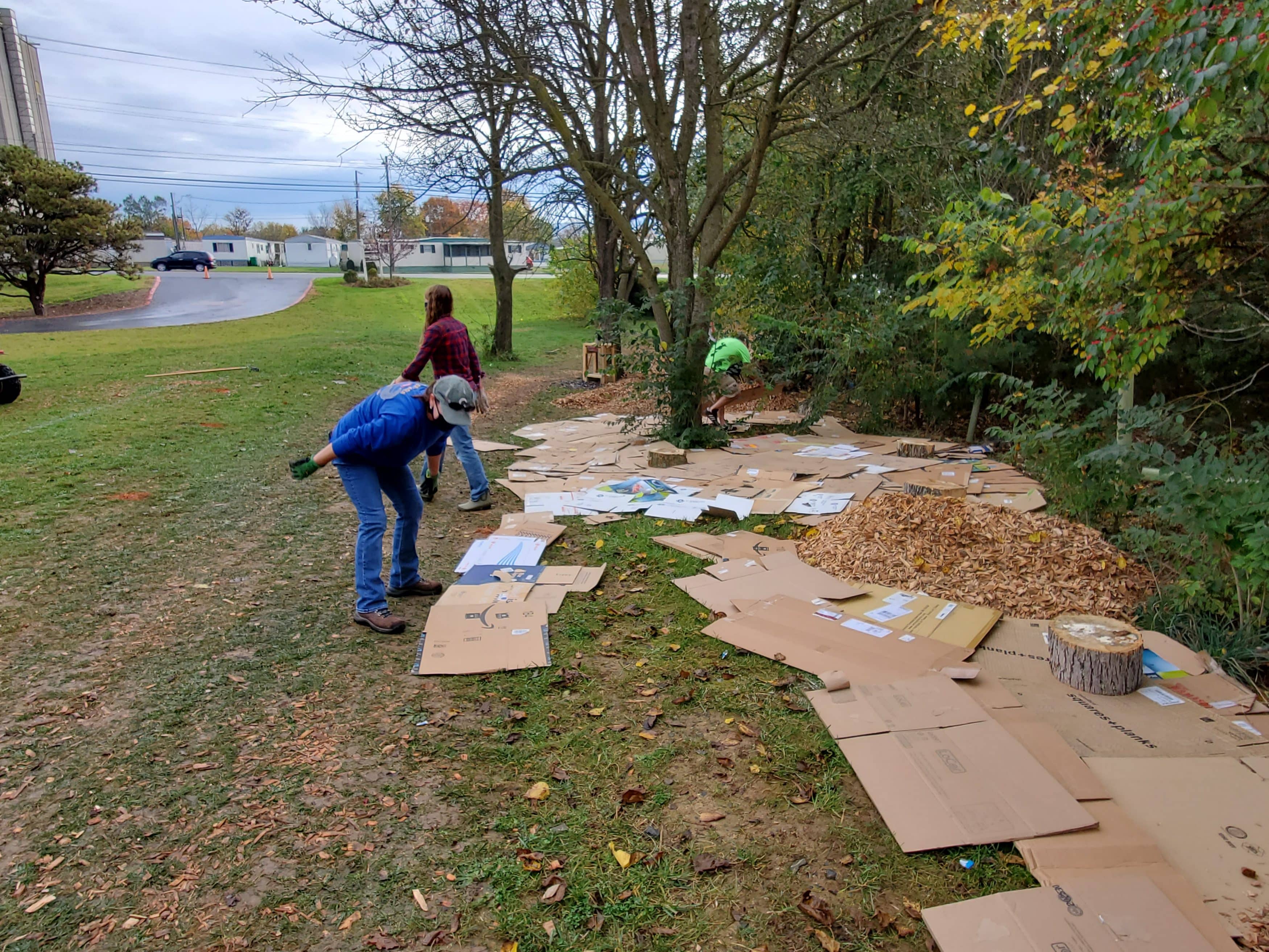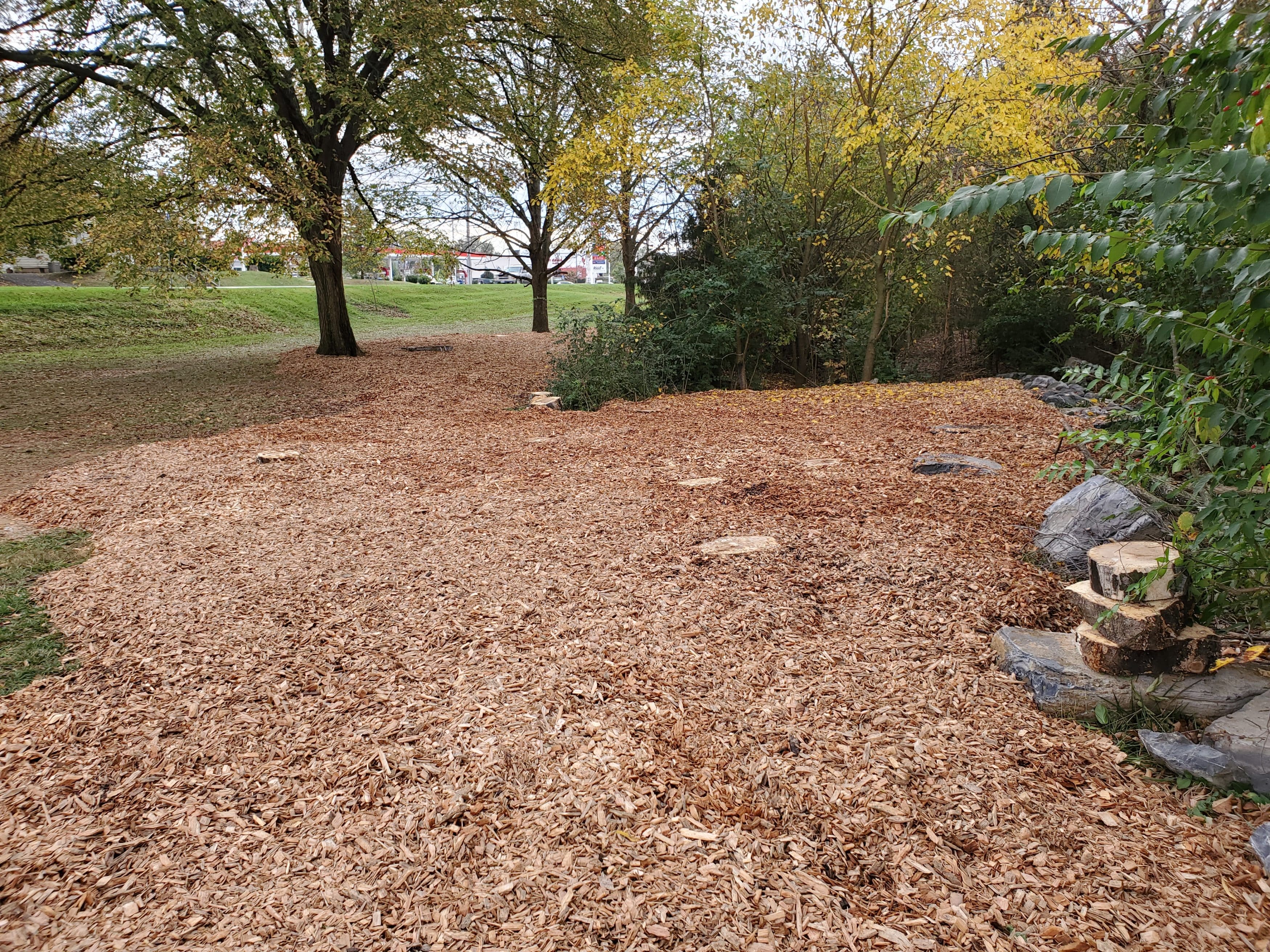 On Friday, October 25, Saturday, Dan Sandburg, EMS dad, brought his excavating equipment to prepare the spots that had been planned by teachers with student input. A first evening shift of volunteers began spreading wood chips while Bauman worked with children in the After School Program and other parents and students worked on the bridge garden. Saturday, a new crew of volunteers finished the jobs.