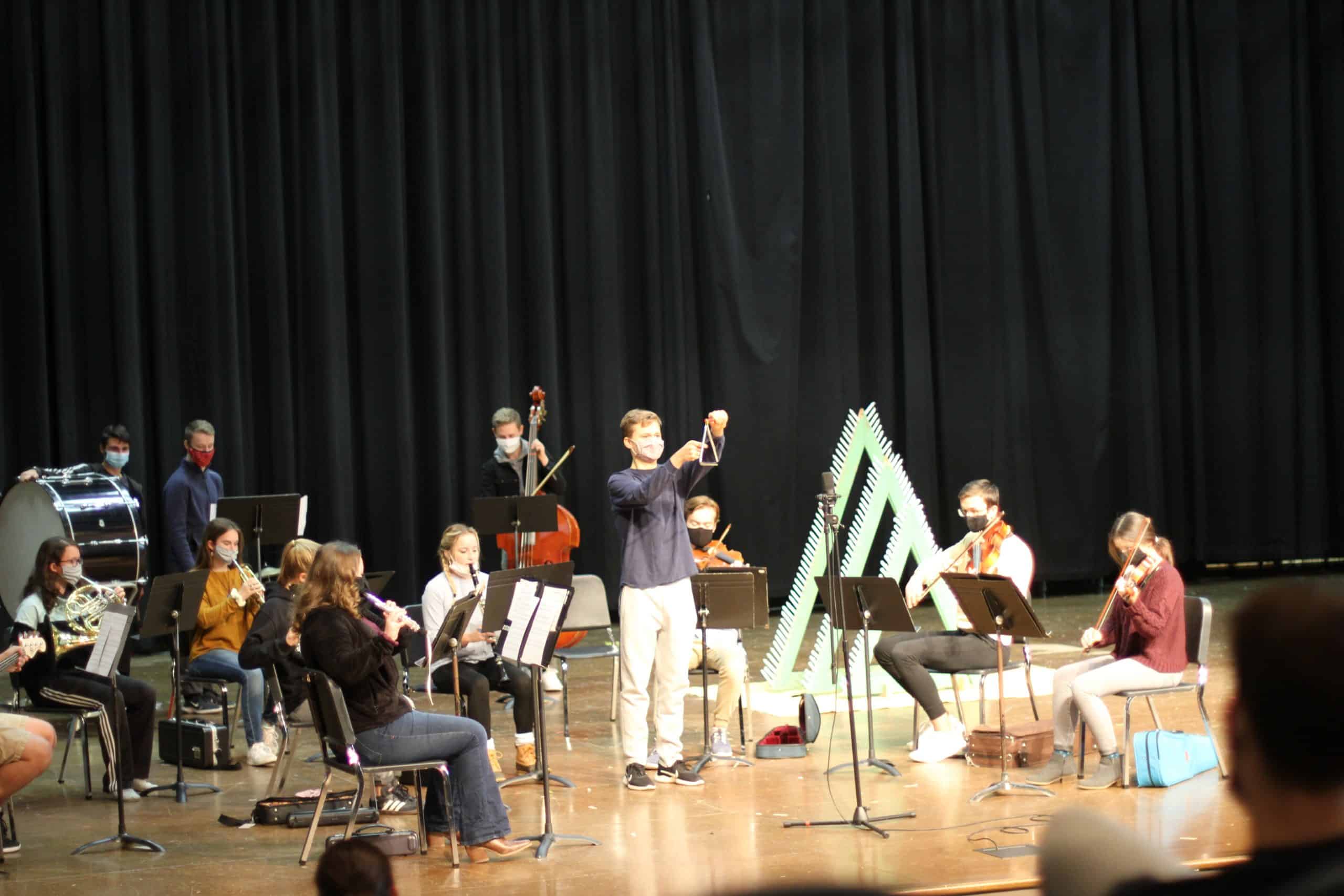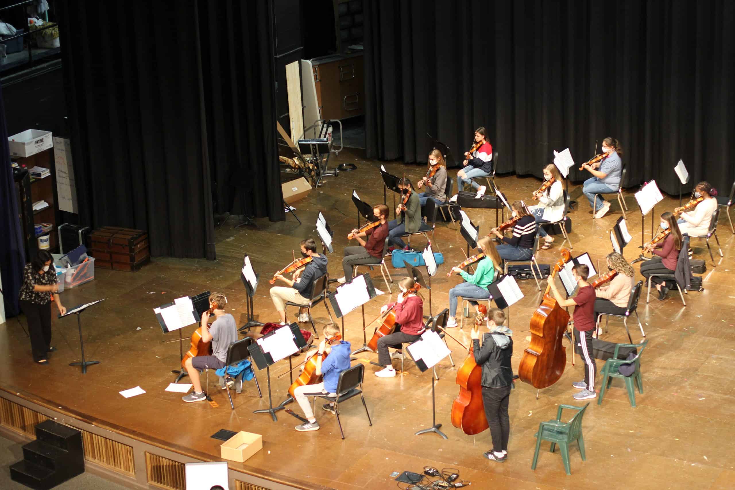 With the possibility of a formal program for parents and public eliminated, orchestra students performed for faculty and staff, scattered in the balcony, on November 23 after school. Enjoy “A Christmas Festival” by Leroy Anderson © Woodbury Music Company LLC (ASCAP) See a video.