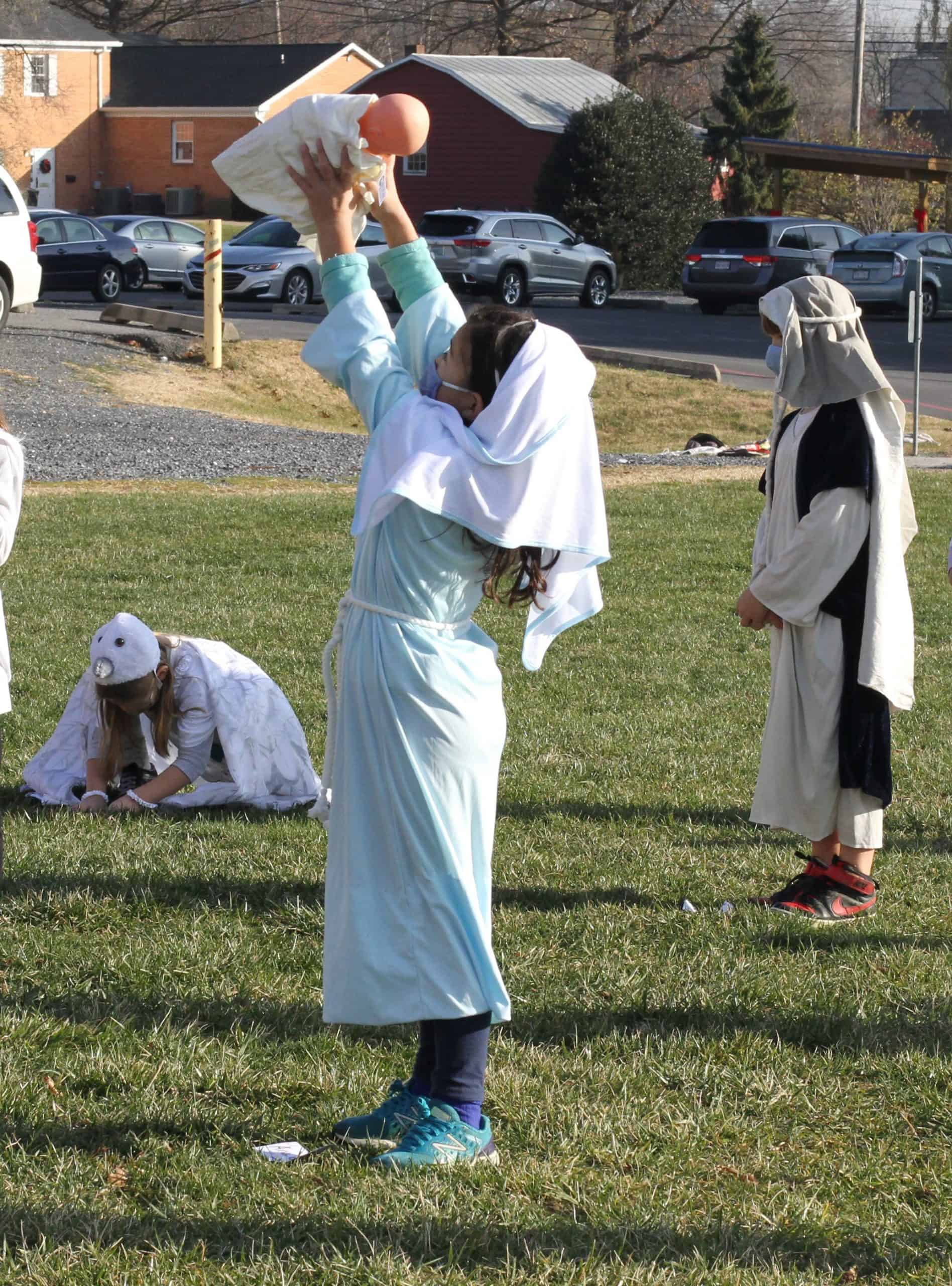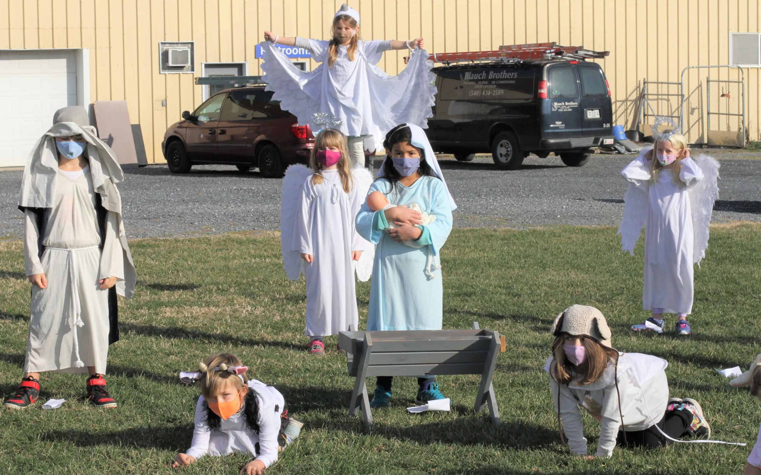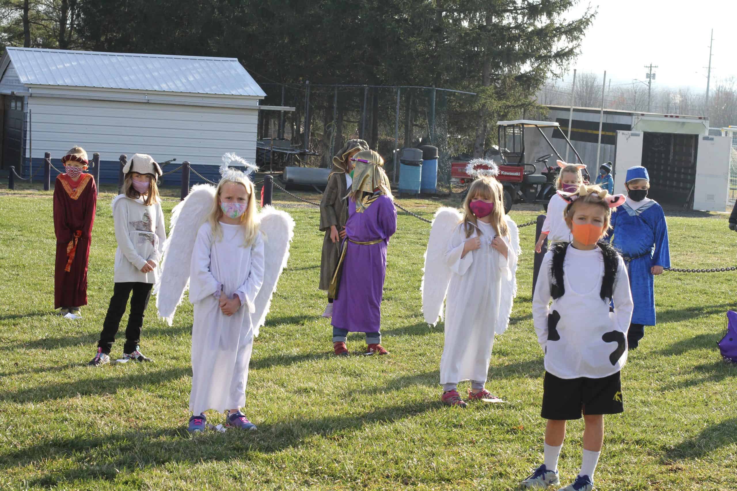 December 10, elementary students enjoyed mild temperatures, standing in distanced formation to sing Christmas songs. Grades K-5 gathered to video tape a program for parents, which featured fifth grade readers, musicians and soloists, and second grade students in the nativity pageant. See the video.