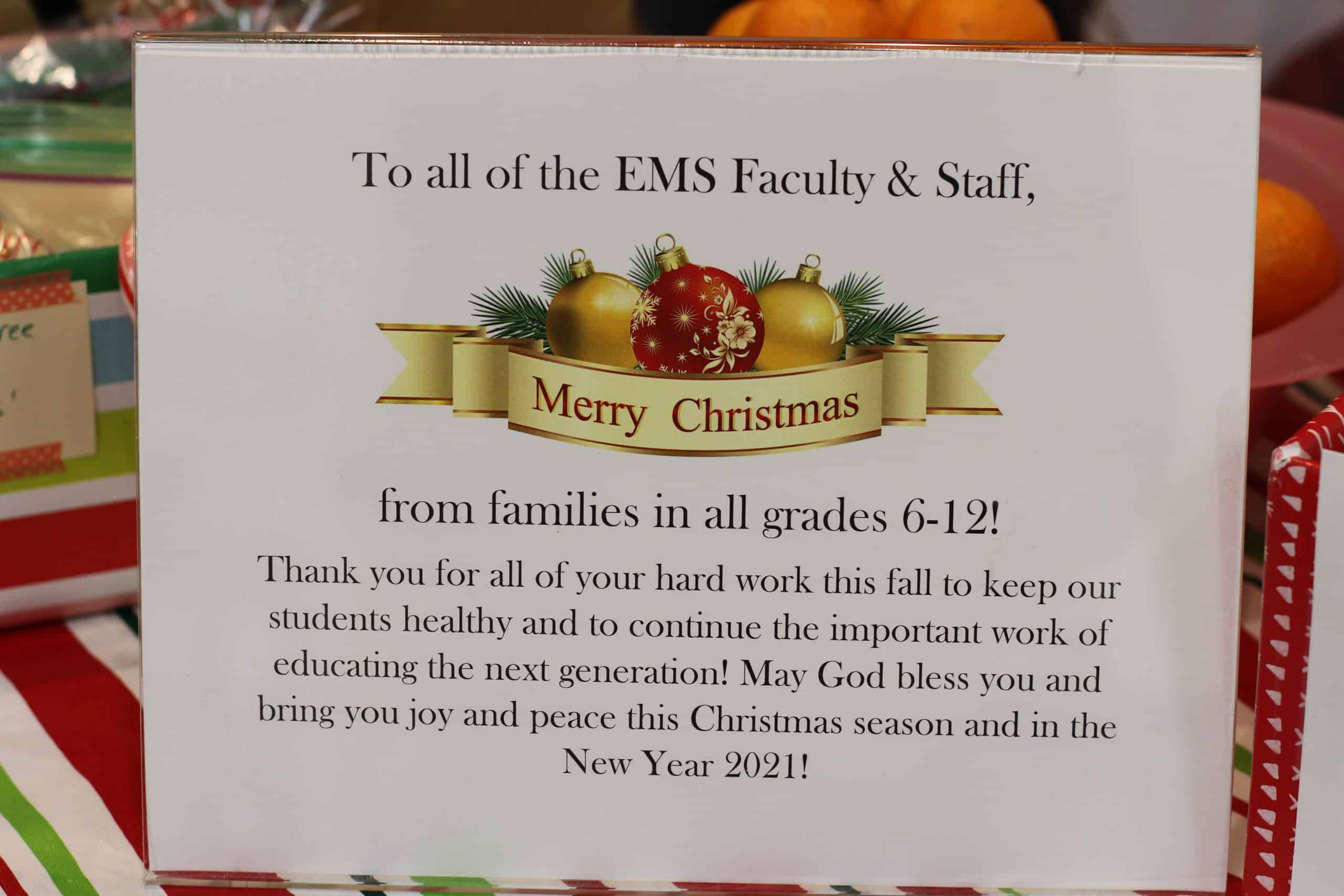 Along with the rest of the country, EMS did its best to find ways to celebrate the Advent season and Christmas message despite the limitations of COVID-19 mitigation practices. The school was able to enjoy in person learning this fall with social distancing and mask wearing at all times before grades 6-12 moved to distance learning following Thanksgiving break through the new year, with elementary classes staying in person through Dec. 11. A few Christmas-related events took place before disbursing.