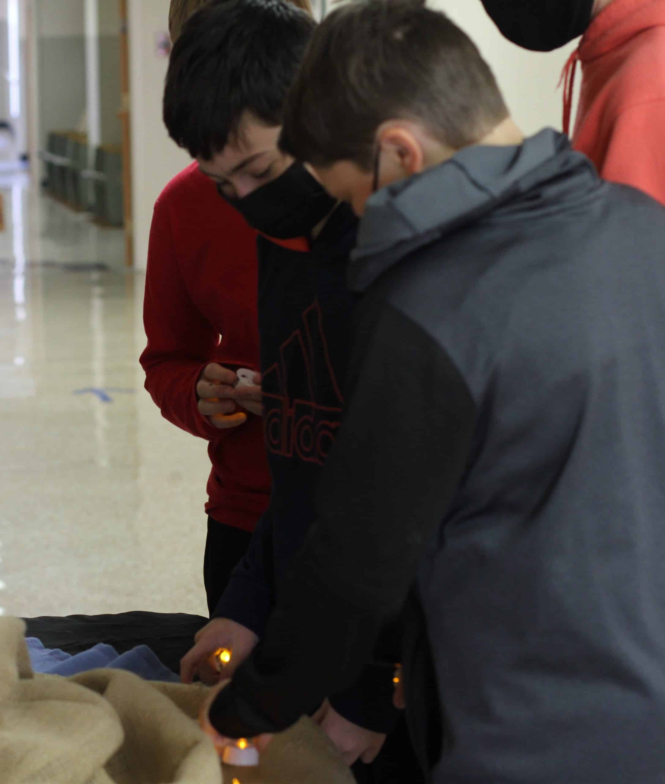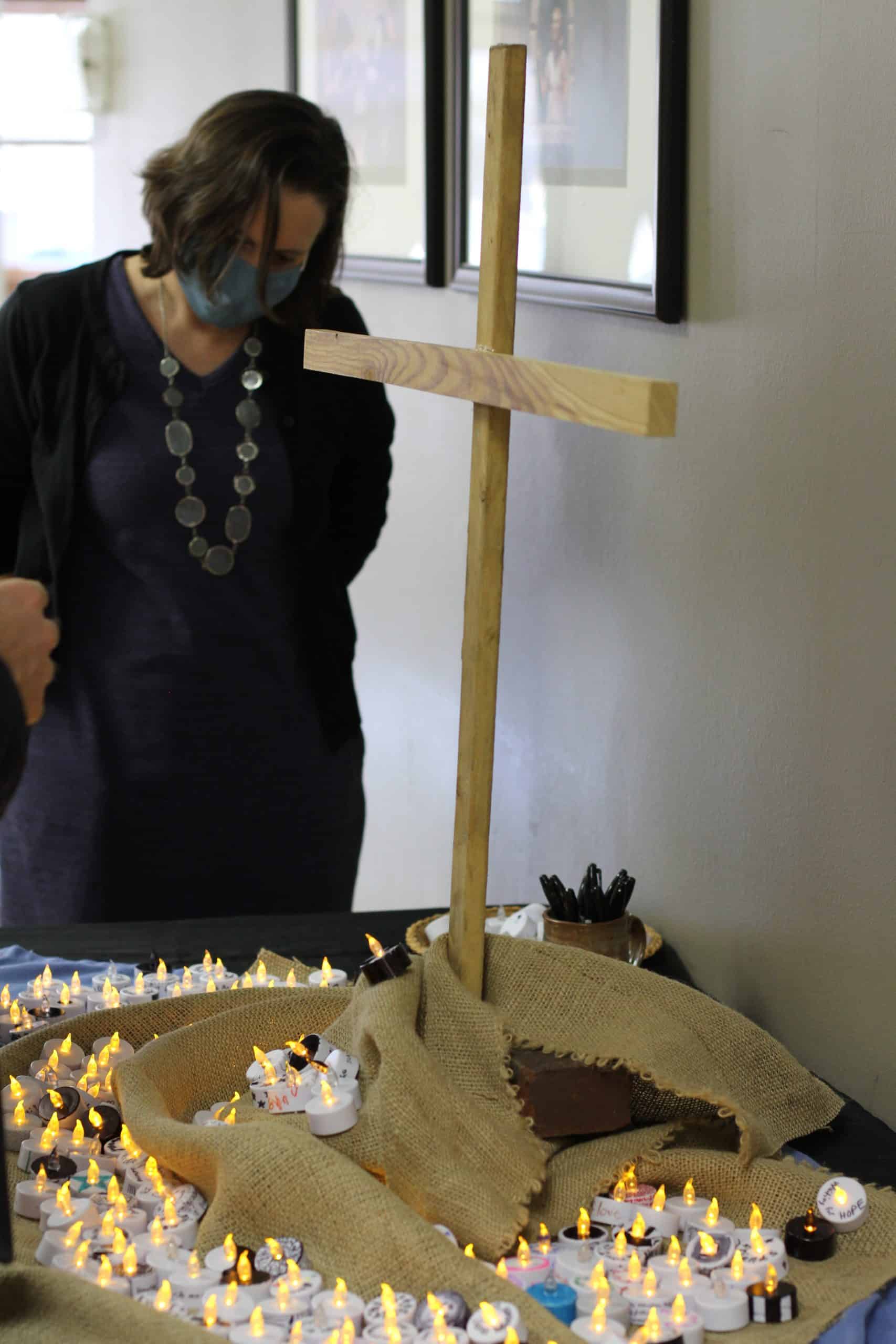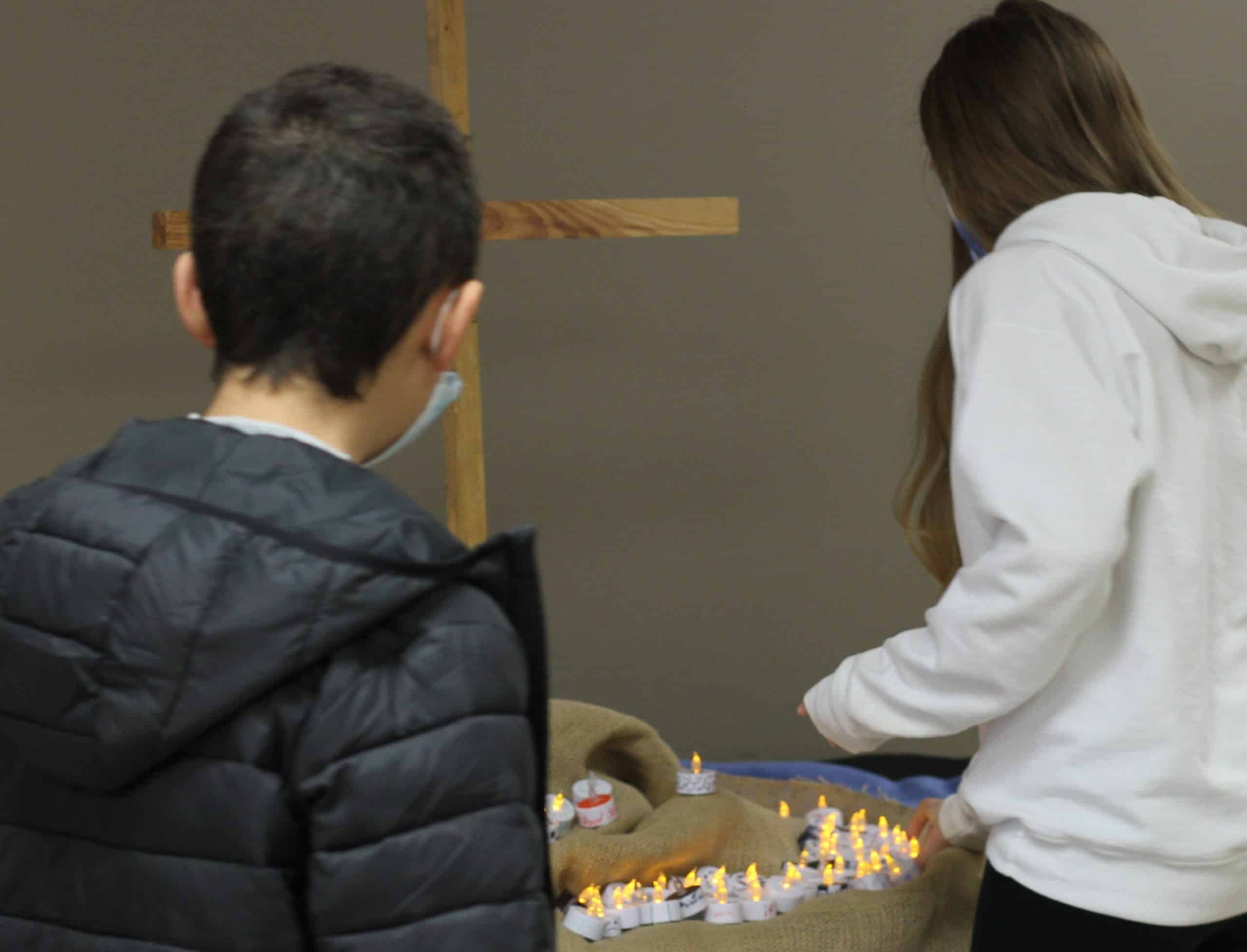 Students were dismissed by classes to take their candles to a cross in the front foyer. “Even though we’ve been blessed by having most students at school in person this year, there’s still a lot of loss,” said King. “It’s moving to read some of the wisdom and pain in these words,” he noted as teachers and administrators looked at the display.