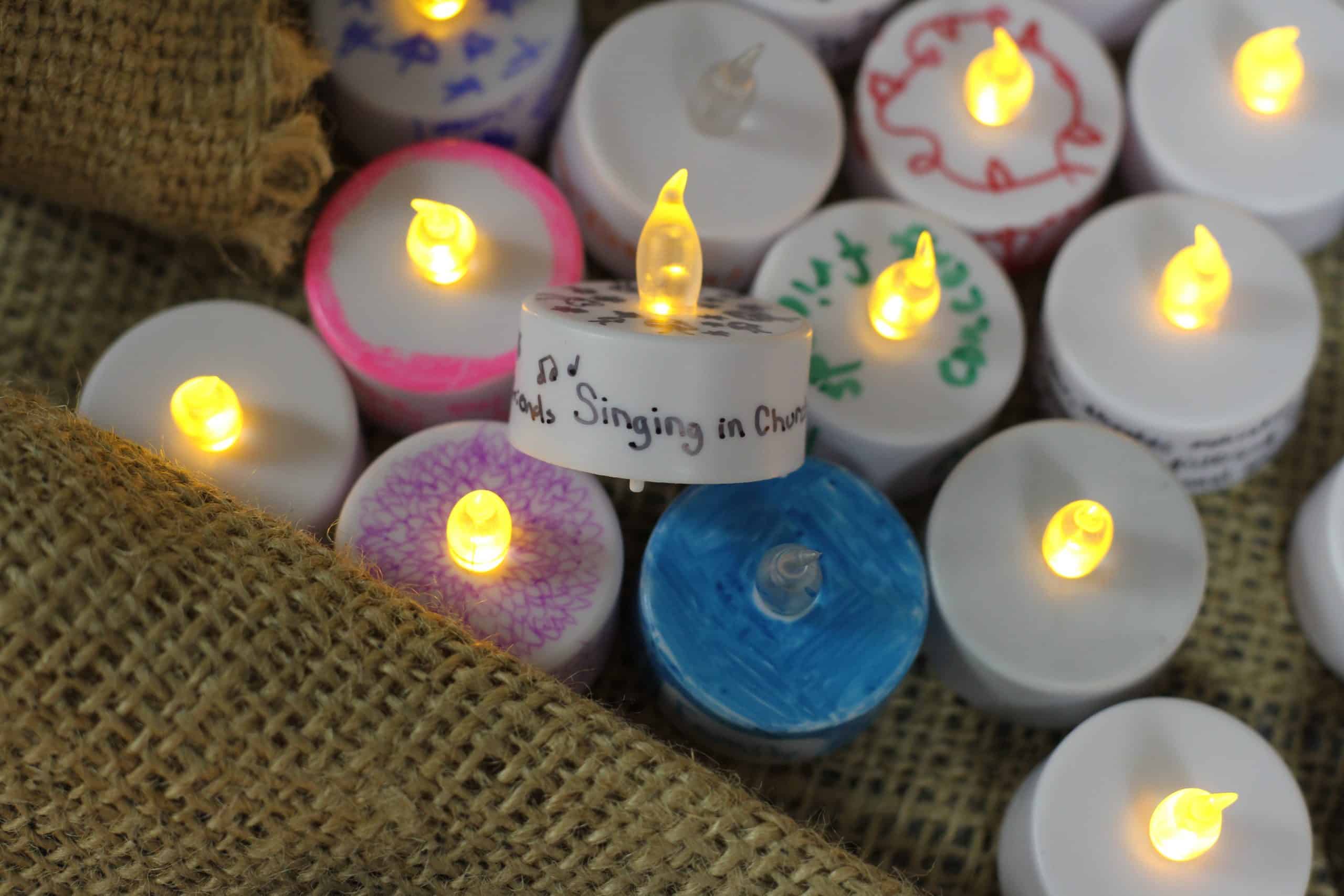 Teachers distributed battery-operated lights and Sharpie pens before students viewed the pre-recorded chapel video in their second block class period, the way chapel has taken place all year. The video included four questions for reflection as students wrote on their lights: