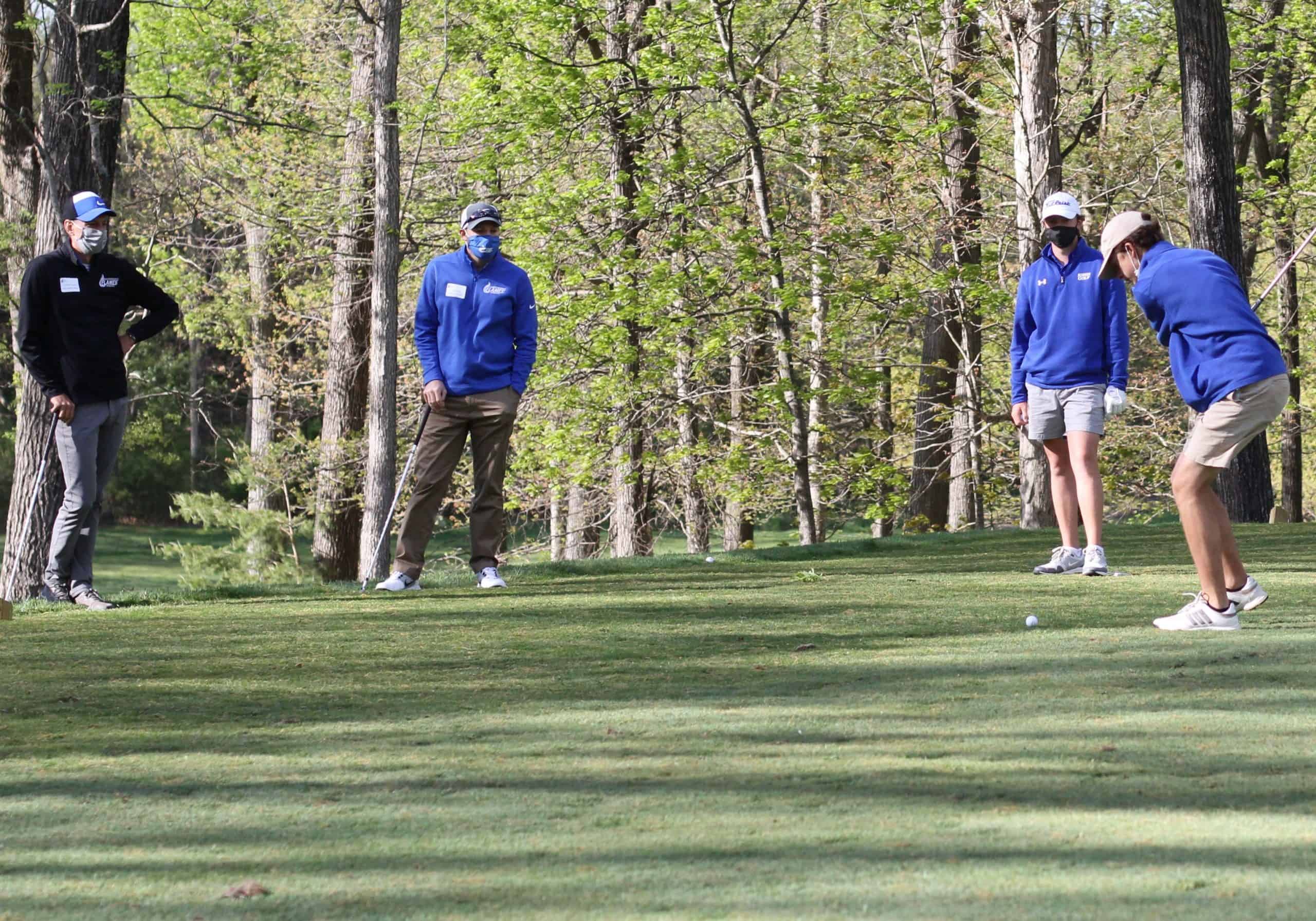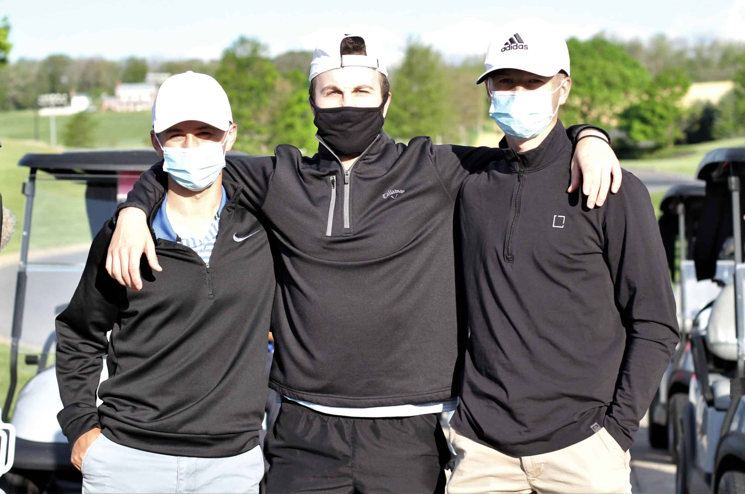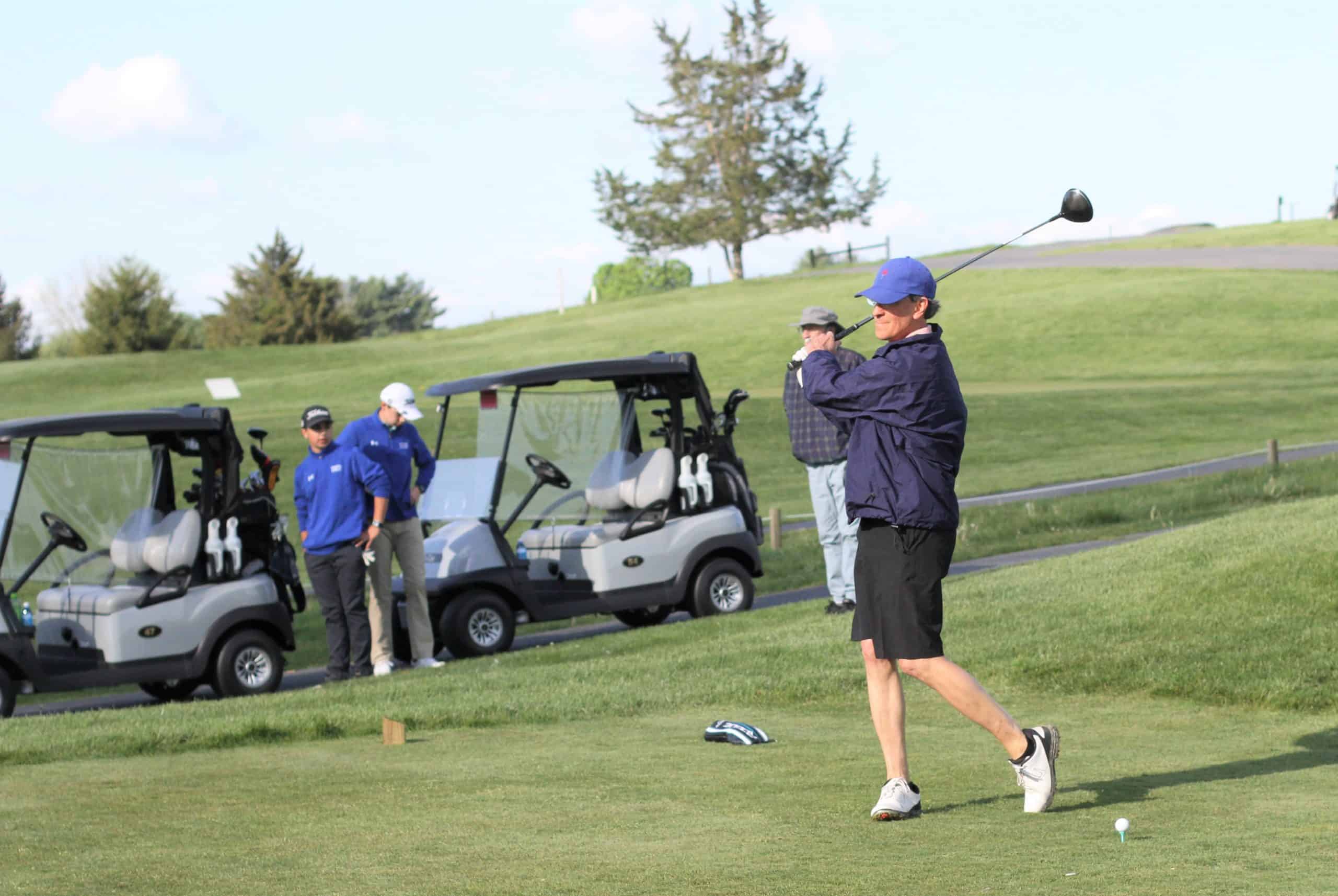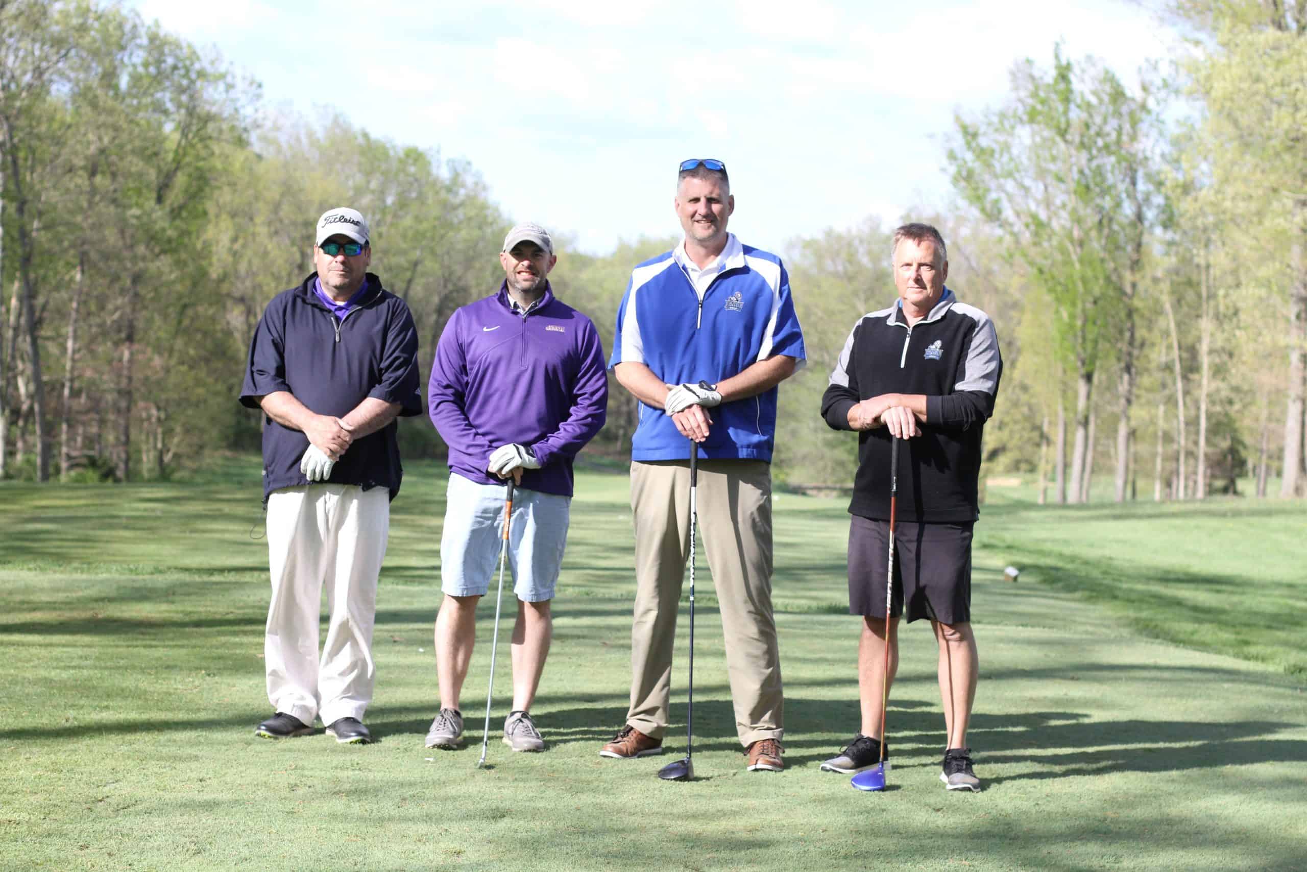 The top score for the 18-hole day — in gusty windy conditions — came from the foursome (pictured left to right, above) of Schuylar Harmison ’22, Andrew Gascho, athletic director; Justin King, high school principal; and Ryan Slonaker ’22.