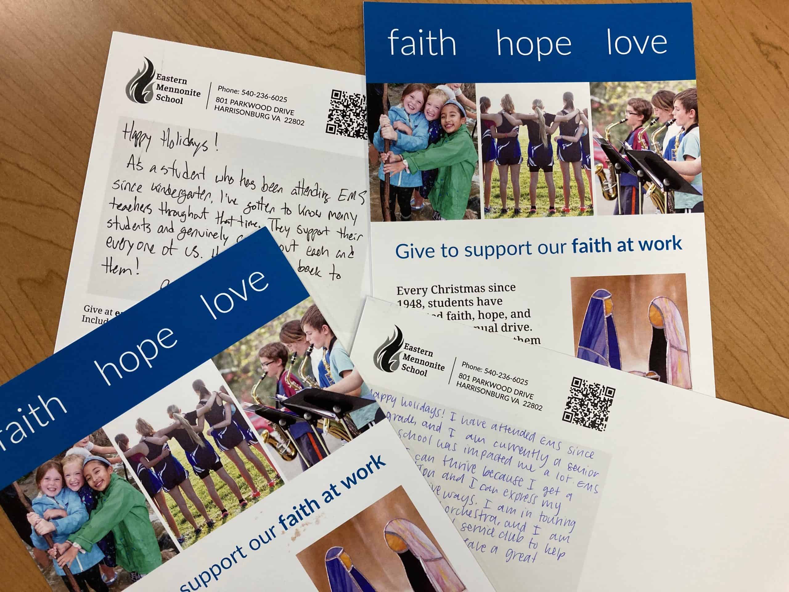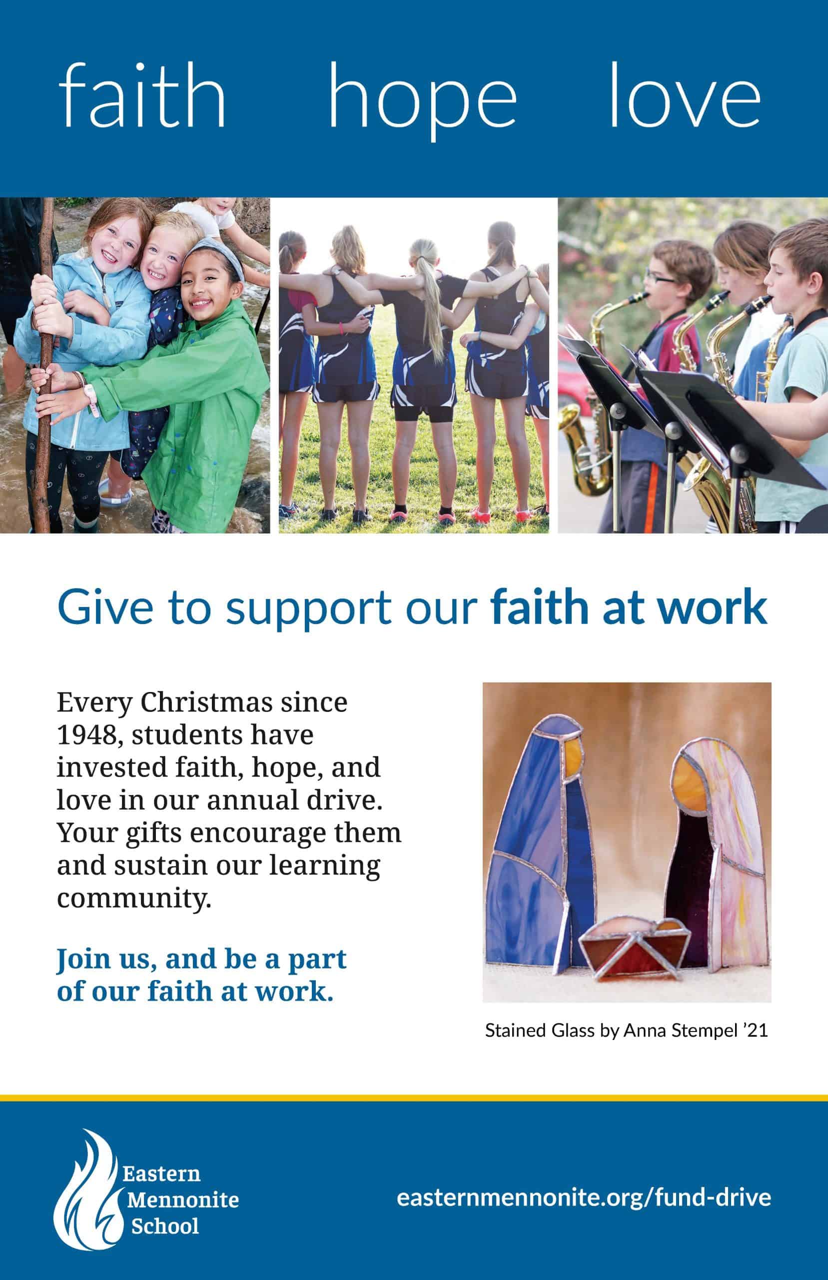 Donations for the 2021 Christmas Fund Drive are welcome through January 31. Donate online, by dropping a gift at the school’s front office, or by mailing a check to Eastern Mennonite School, 801 Parkwood Drive, Harrisonburg, Va. 22802.