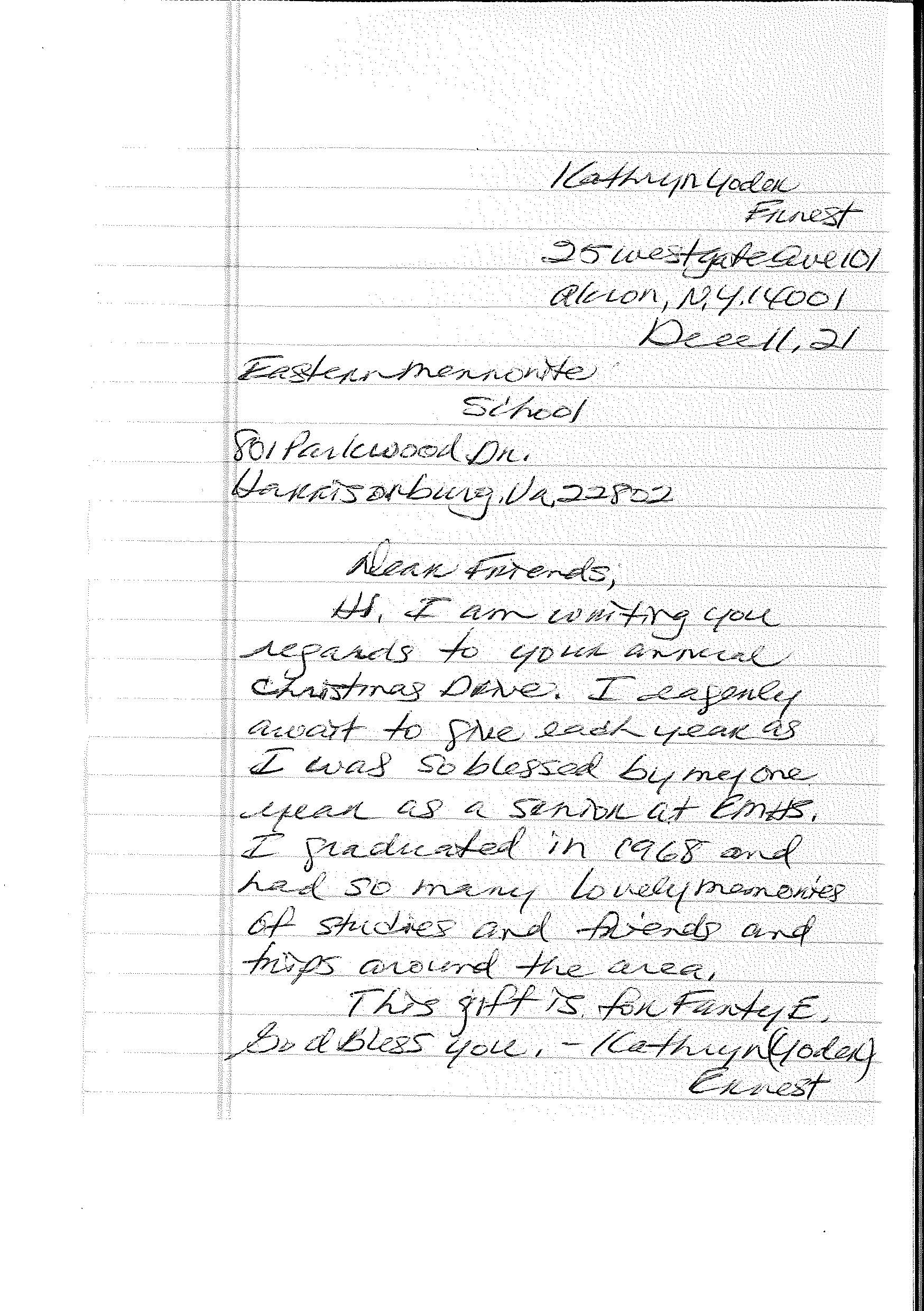 “I eagerly await to give each year as I was so blessed by my one year as a senior at EMHS,” wrote Kathryn Yoder Ernest, class of ’68. “I have so many lovely memories of studies and friends and trips around the area,” she noted.