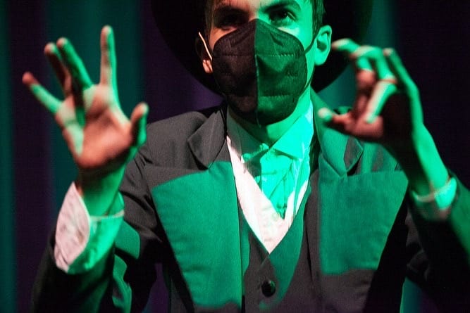 Before she could turn back, Dorothy and Toto were swept up in a tornado. The storm was acted out onstage by an ensemble of twister cancers, with black ribbons and a storm scene that doubles as a set change.