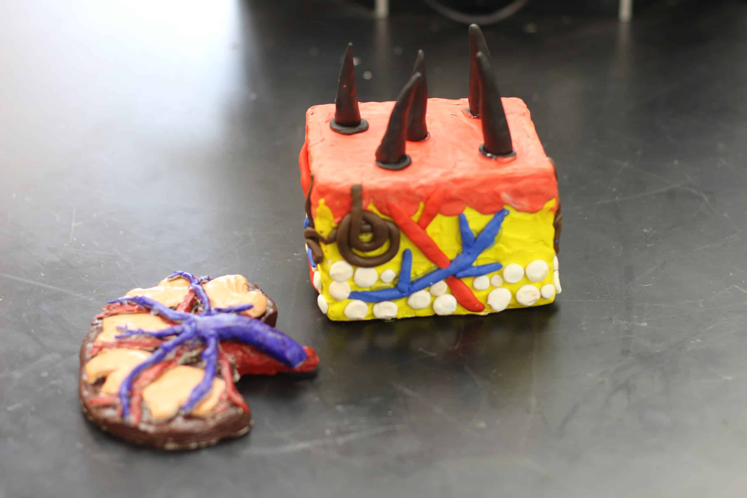 Using their fingers to create blood vessels and an optic nerve, sculpt hair follicles, and label parts of the brain, helped students to absorb anatomy lessons at a deeper level than reading, looking at pictures, or even drawing might. The photos feature a kidney, eyeball, brain, and cross section of human skin.