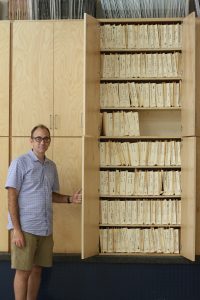 Jared Stutzman, choral director, with one small section of the choral music library of more than 1,700 pieces, in new shelving