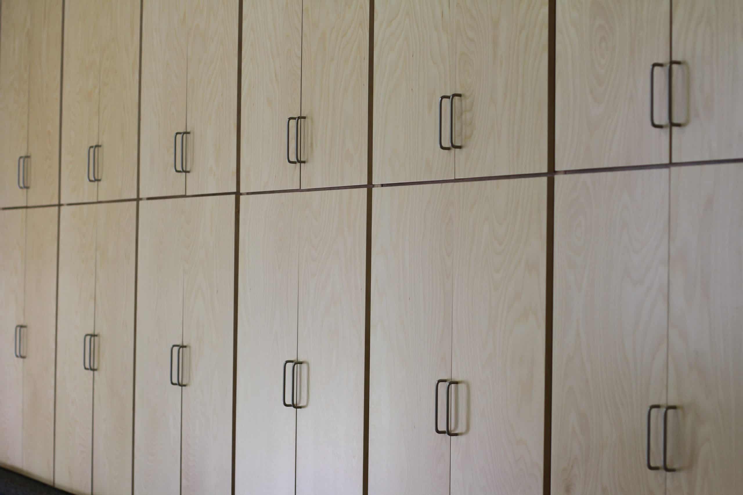 Doug Lantz ’89 of Lantz Custom Woodworking and his son Andrew ’24, prepared the 56 door panels using their computer numerical control cutting equipment and spray booth to apply three coats of satin urethane. The Lantz team fixed the hinges before the Brubaker/Leaman team hung the doors.