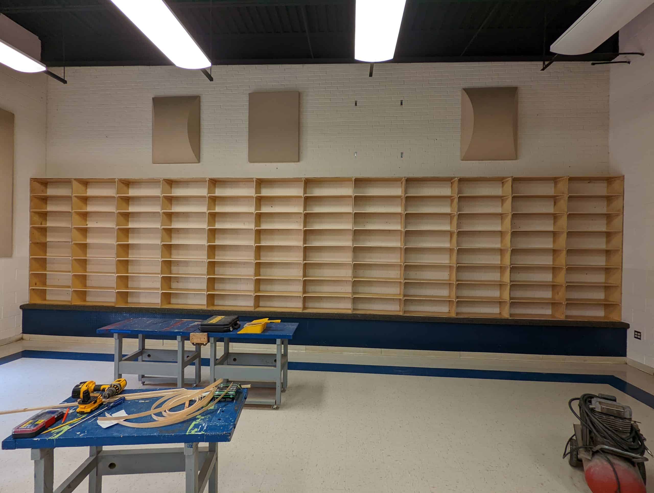The project shelving was “mentally designed,” according to Paul Leaman, head of school, with former tech ed and shop teacher, Dennis Brubaker. The shelves are constructed of birch plywood for the vertical pieces and solid birch faceplates for the horizontal shelves.