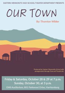 The Eastern Mennonite School Theater Department welcomes the public to its production of Our Town, by Thornton Wilder, October 28 and 29 at 7 p.m. and Sunday, October 30 at 3 p.m. The show features high school actors (list below), as well as Thaddeus Jackson, class of ’20, in the role of Stage Manager, and EMS parent Jeremy Clark as Constable Warren.