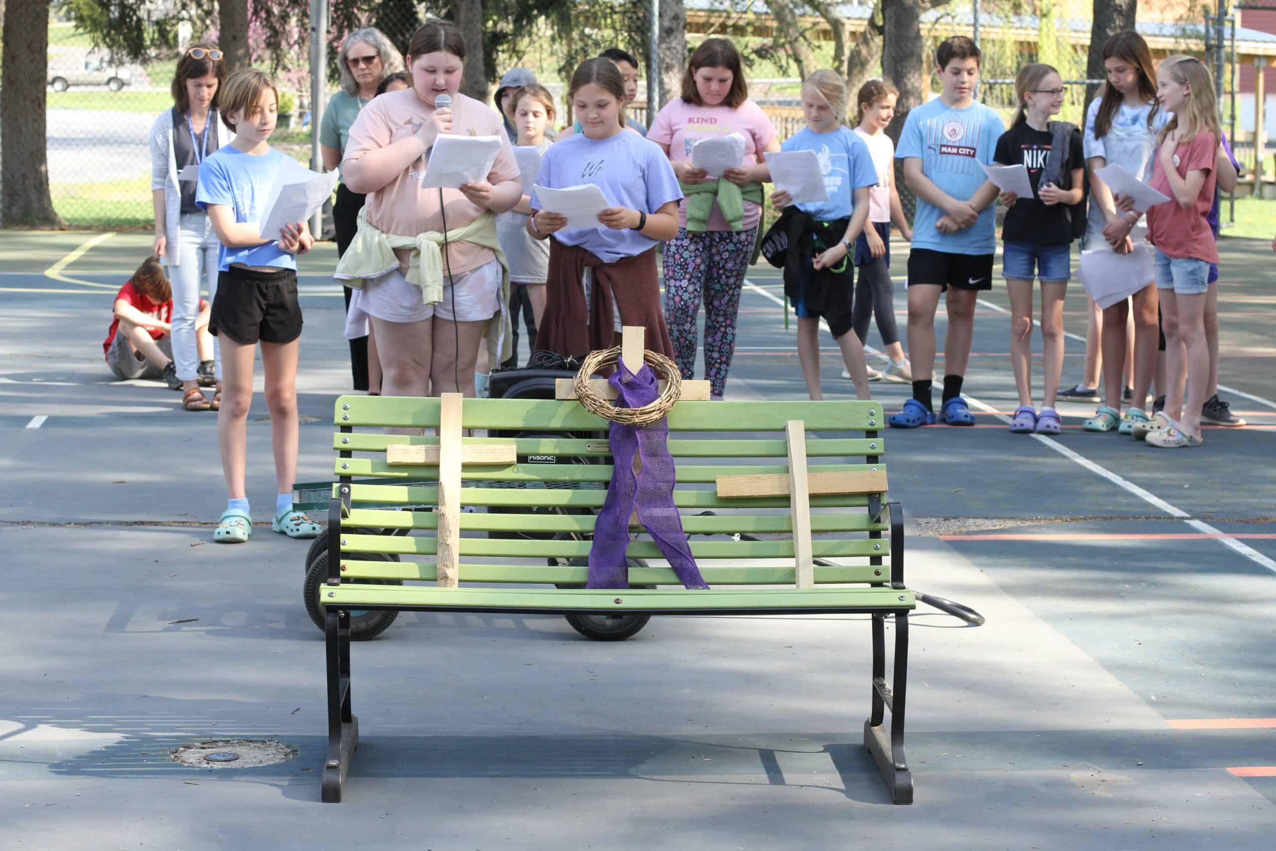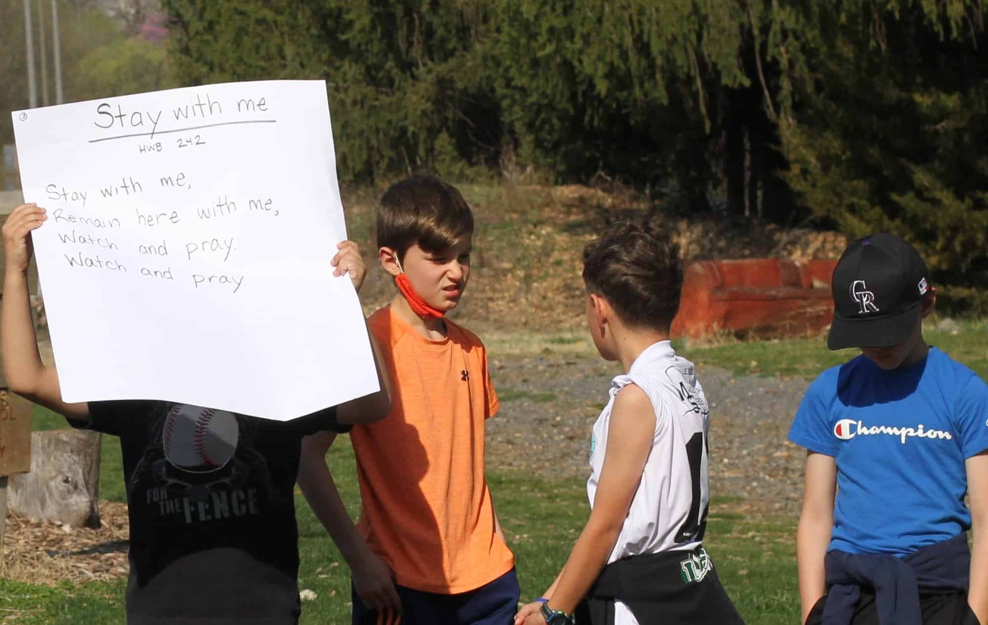 Fourth graders drummed a beat. Fifth graders read scripture. Elementary students, teachers and staff walked quietly on school grounds as part of the EMES annual Passion Walk. It was a time to learn about and remember the last week of Jesus’ life with stations to stop and reflect.