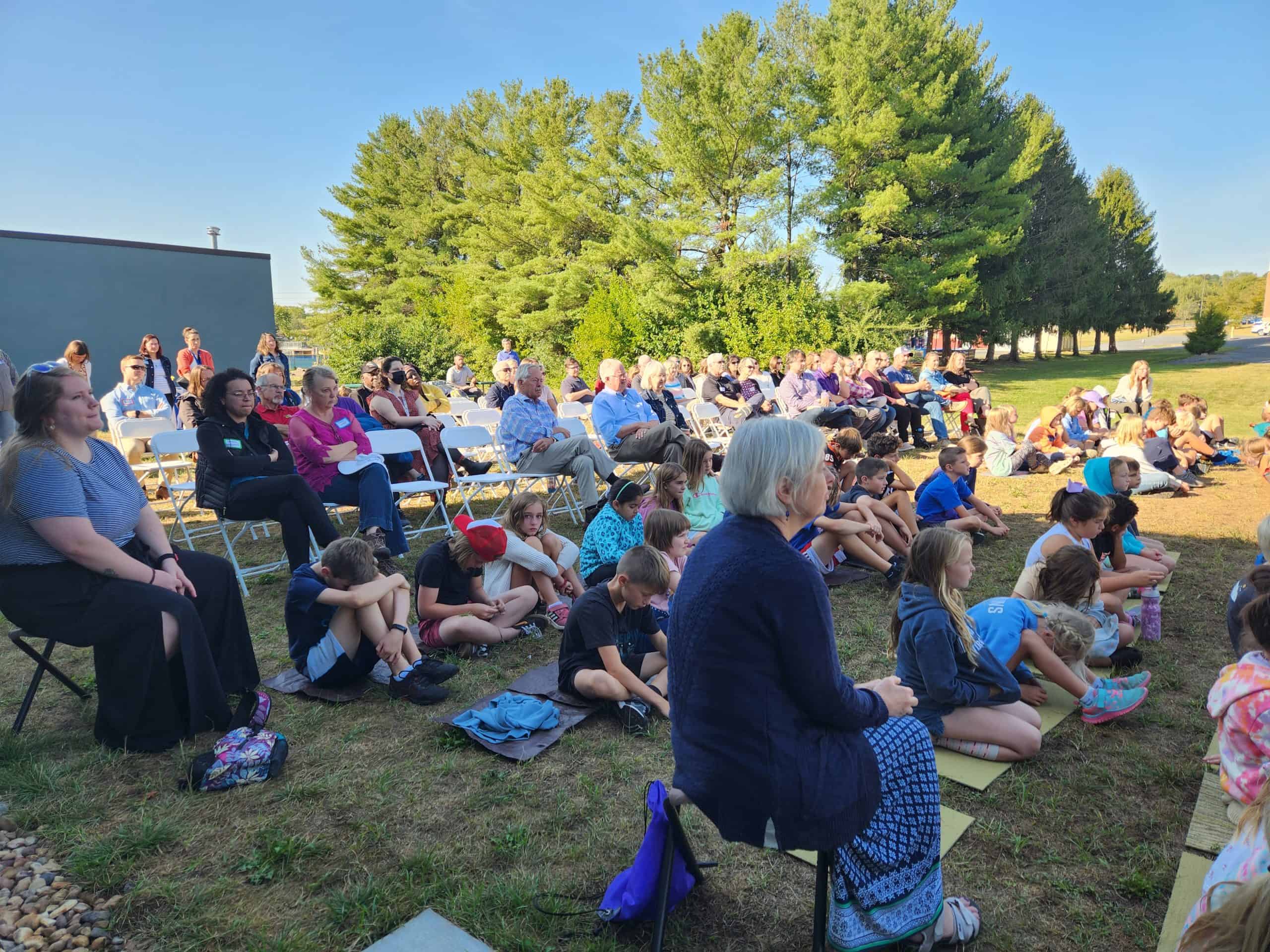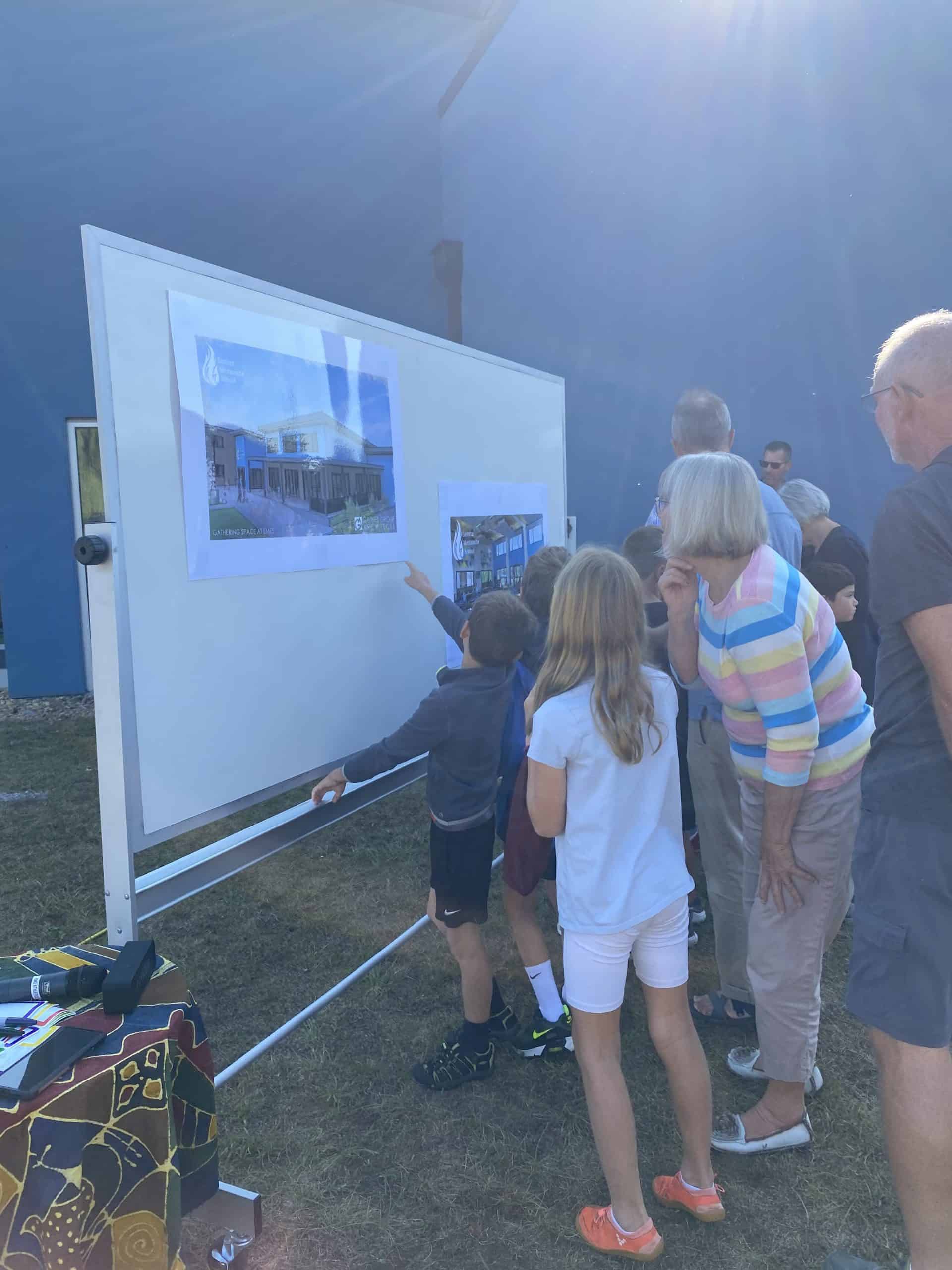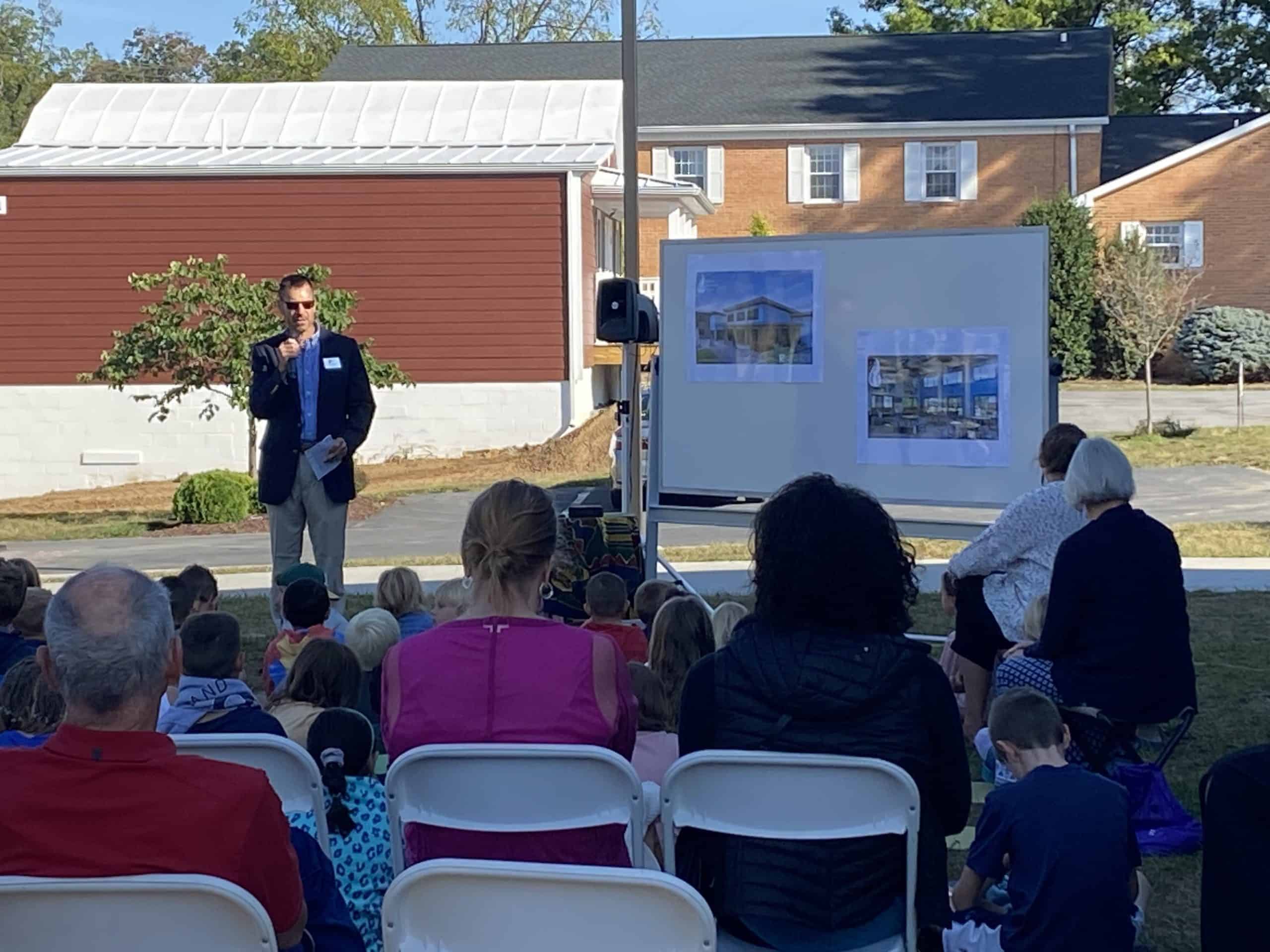 On September 20, 2023 our EMS parents, grandparents, and supporters joined EMES students. teachers and staff in celebration of the design reveal for the gathering space. Guests walked between painted lines, entering through the wide porch, and seeing the walls, classroom/offices, serving kitchen, and bathrooms. One student exclaimed “really!?!” when Paul Leaman, head of school, pointed out that they were sitting on the grass that will soon be the front of the new gathering space.