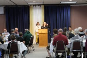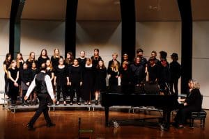 - Former EMHS choral director Marvin Miller leading the hymn, after reminding everyone to “sit tall”