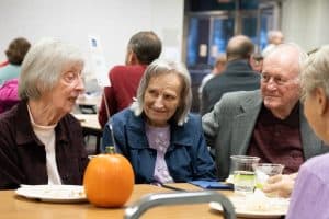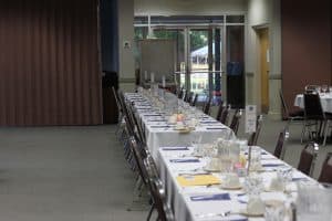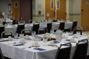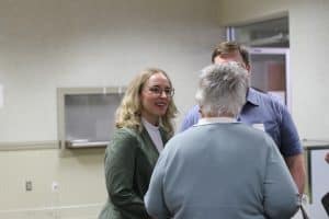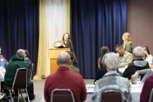 - Hannah DePoy enjoying conversation at alumni breakfast