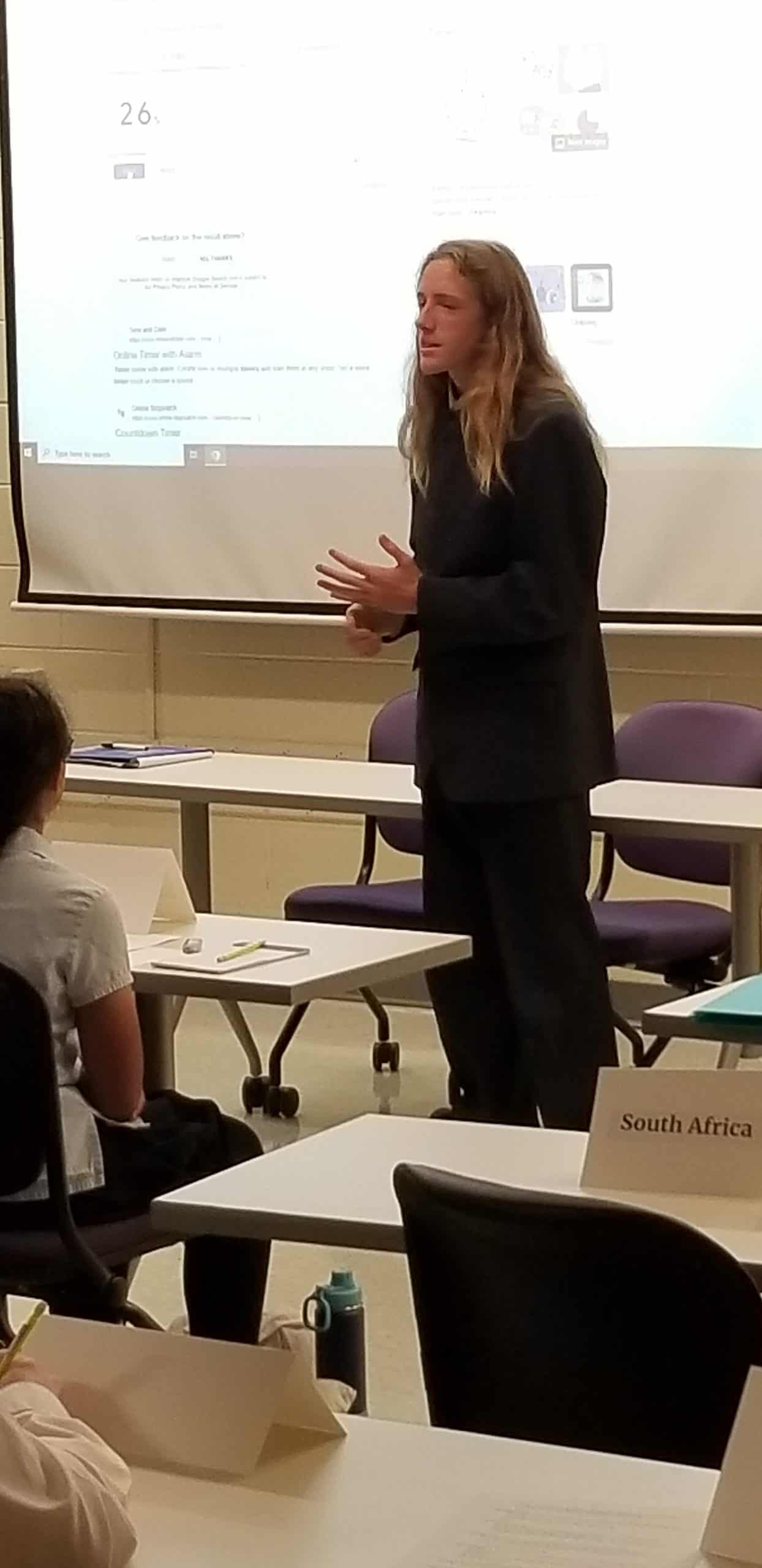 On September 29, 2023, Eastern Mennonite High School participated in Harrisonburg High School’s Model United Nations (MUN) conference for the first time. The three committees discussed serious topics – human trafficking, drug usage, and nuclear weapons. The day began with a keynote from a JMU professor encouraging students to spend time abroad, learning another language, and to engage with others because we need to live as a global community on our only planet. “Because it was a smaller conference, I had the opportunity to be more involved,” says Karinna Fink. Many EMHS students were able to participate in depth in their committees, and demonstrated “their willingness to cooperate with delegates from other schools,” explains Nico Armenteros, a student leader.